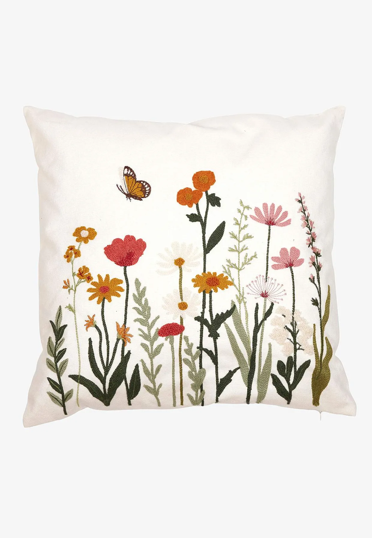 • Charmerende pudebetræk med broderede blomster, stilke og en sommerfugl.