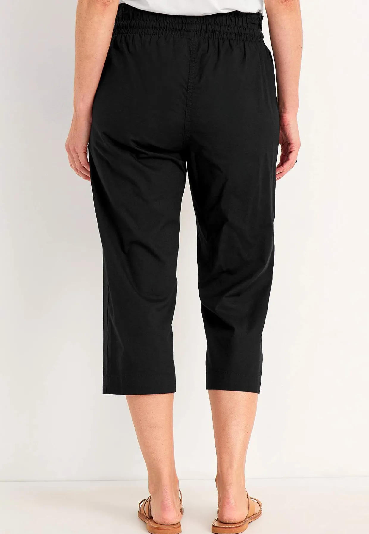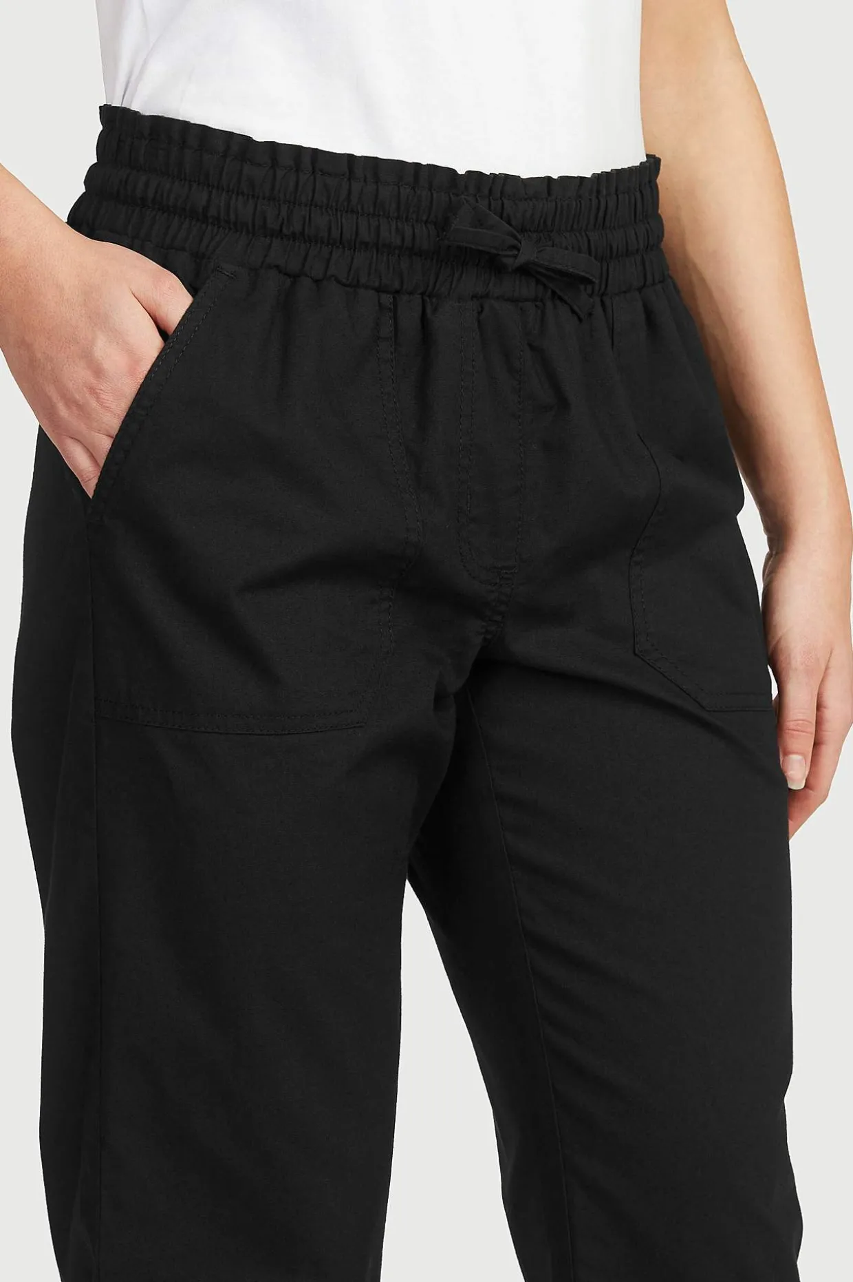 • Elastisk talje med snoretræk og lille volant på toppen