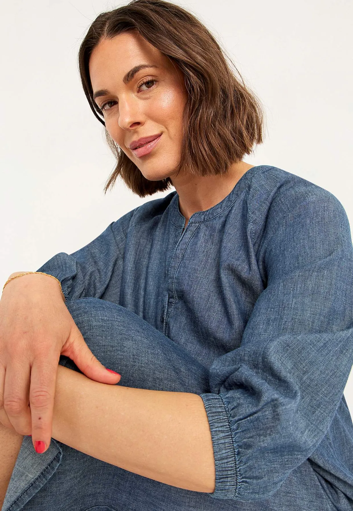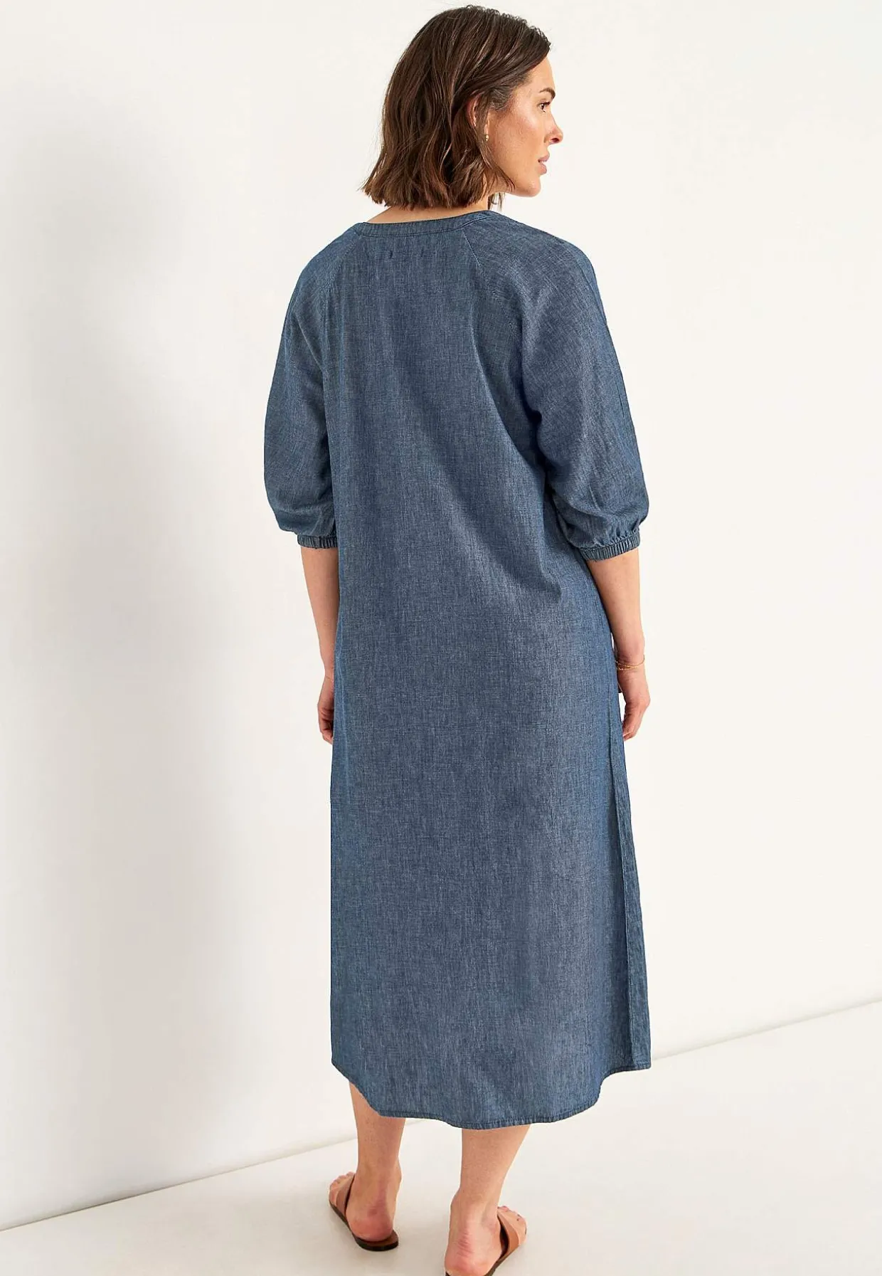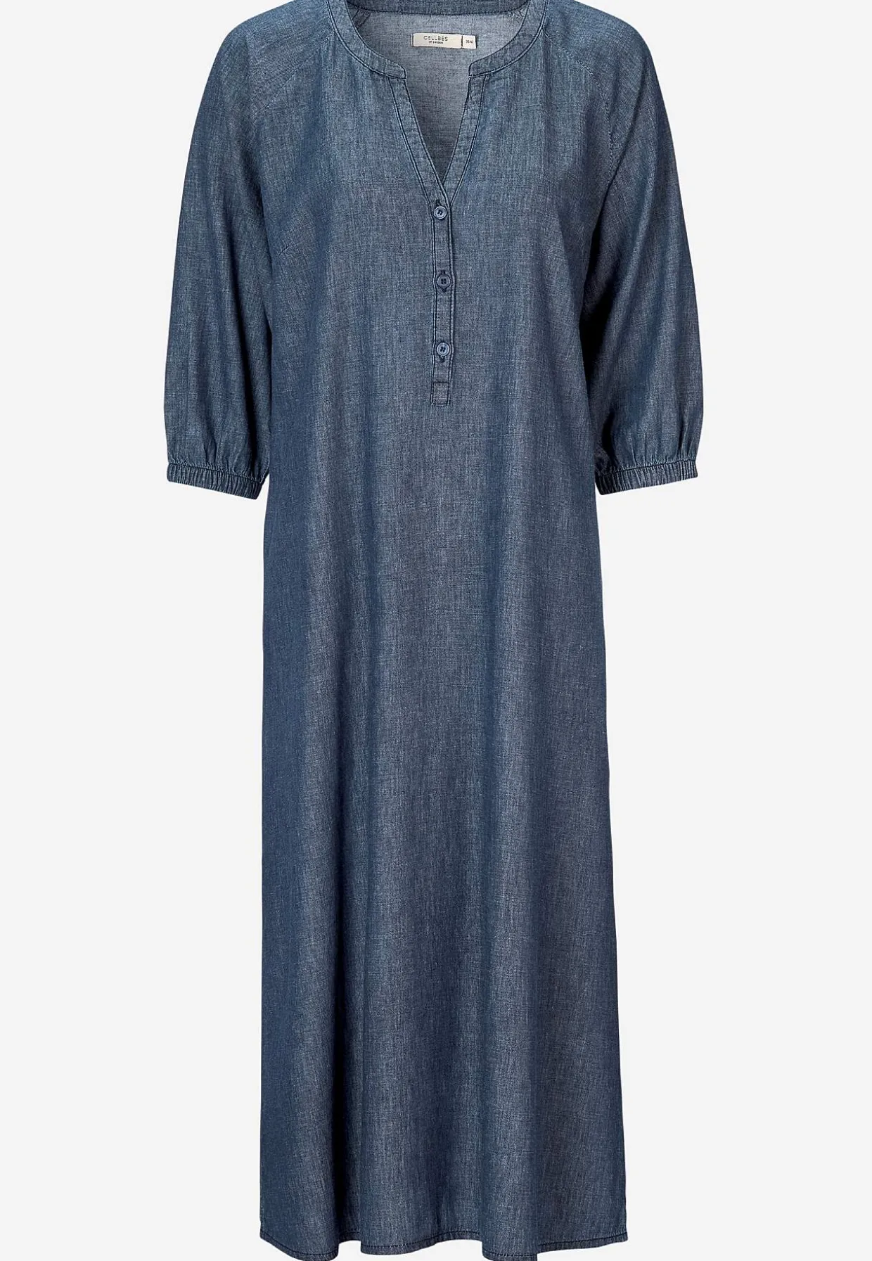 • Rund halsudskæring med en v-udskæring og knapper.