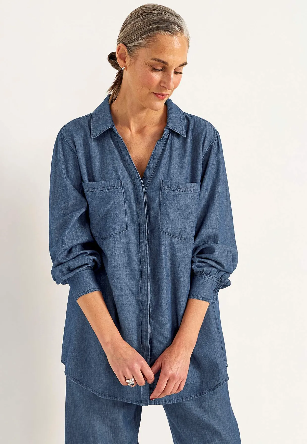 • Lange ærmer med manchet og knap.