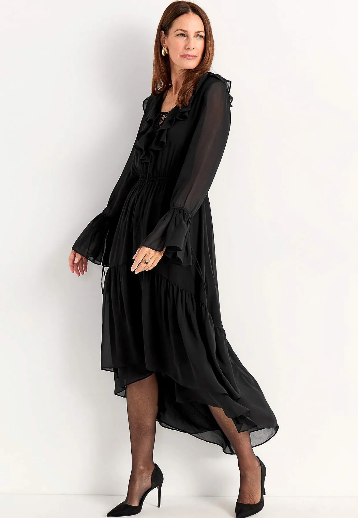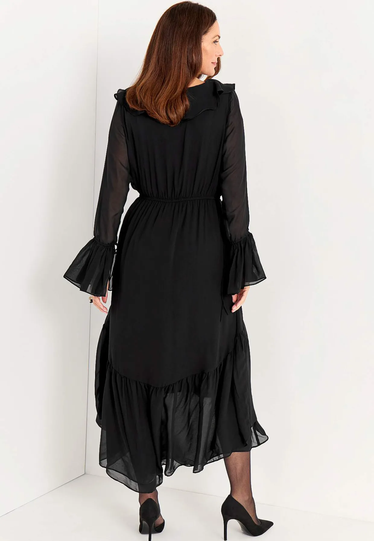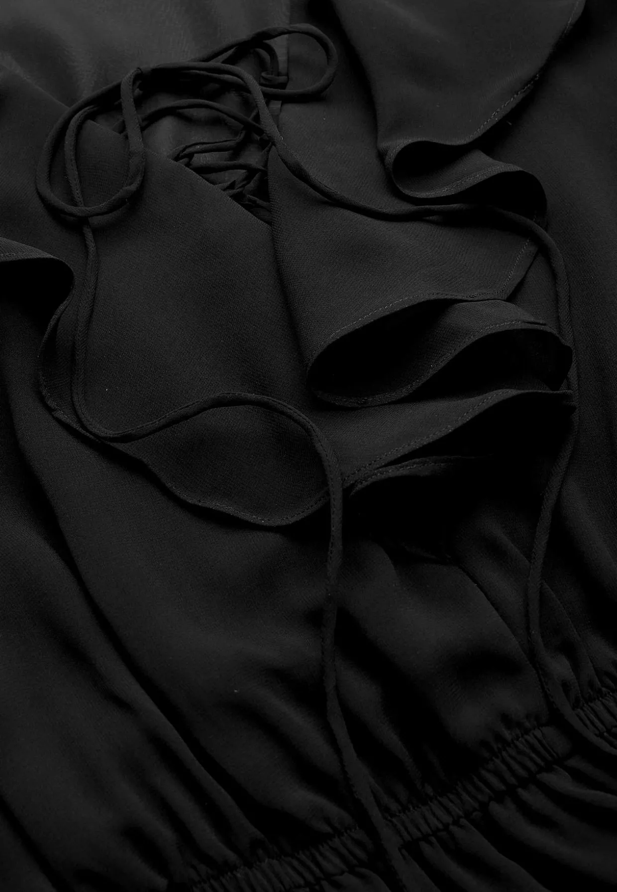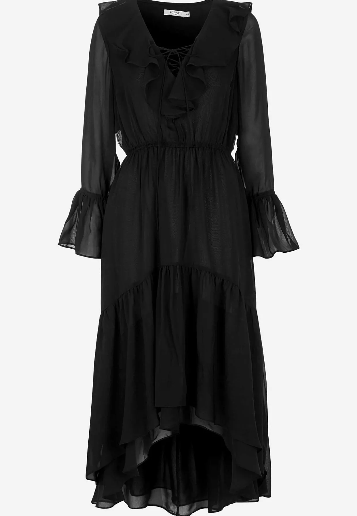 • Lange, næsten gennemsigtige ærmer med volant og justérbar snøring.