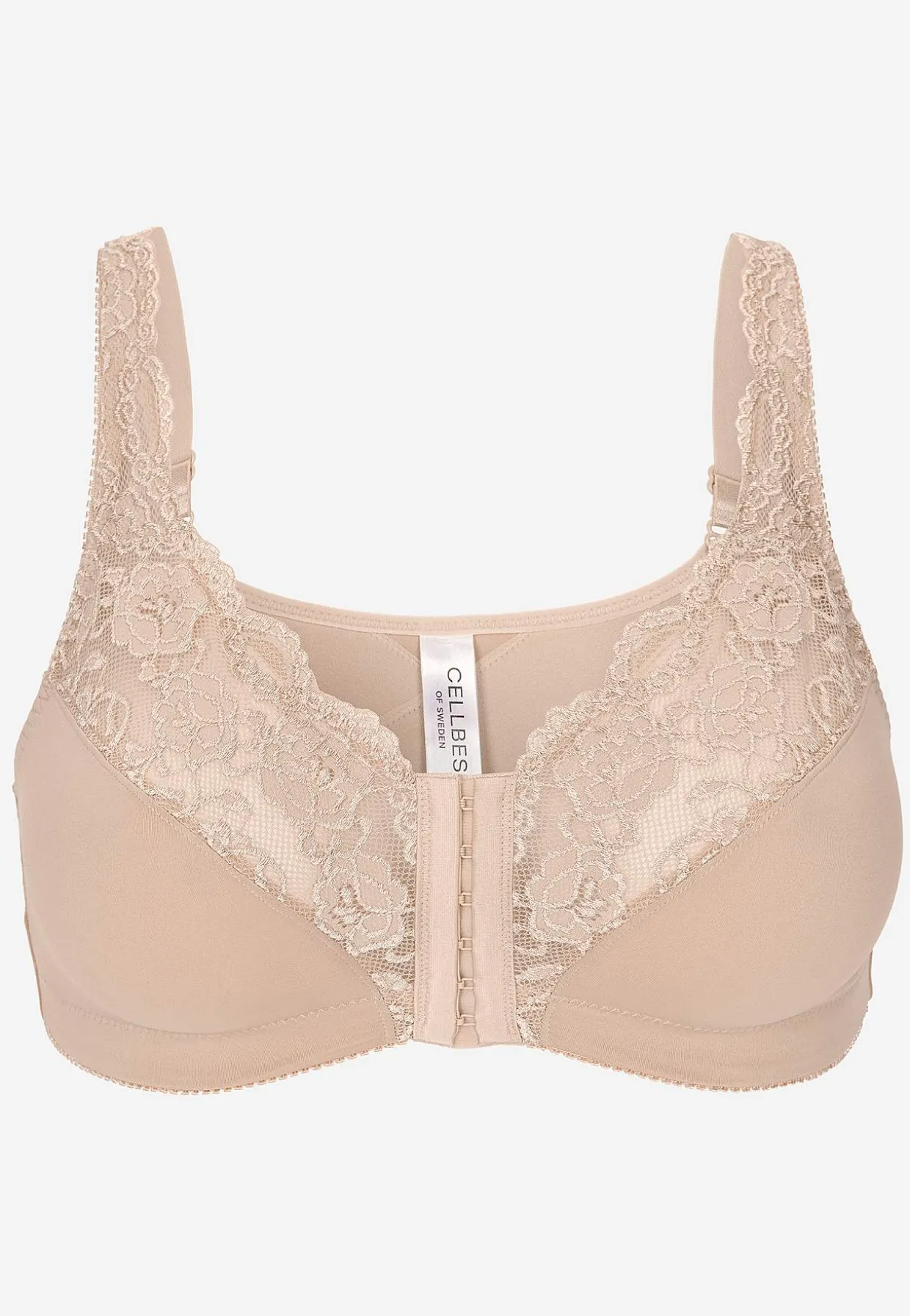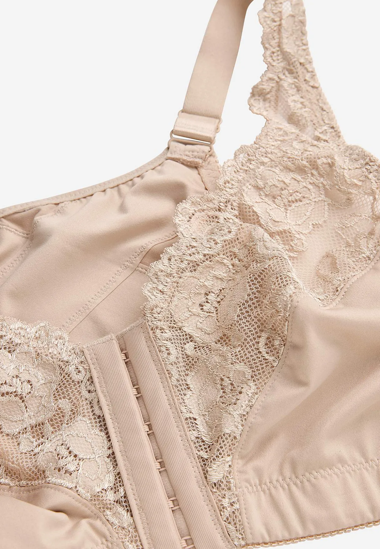 • Vi ønsker, du får den størrelse, der passer dig perfekt! Husk at måle omkredsen under brystet ekstra omhyggeligt, da denne bh kun har én række af krog- og øjelukning i bredden.