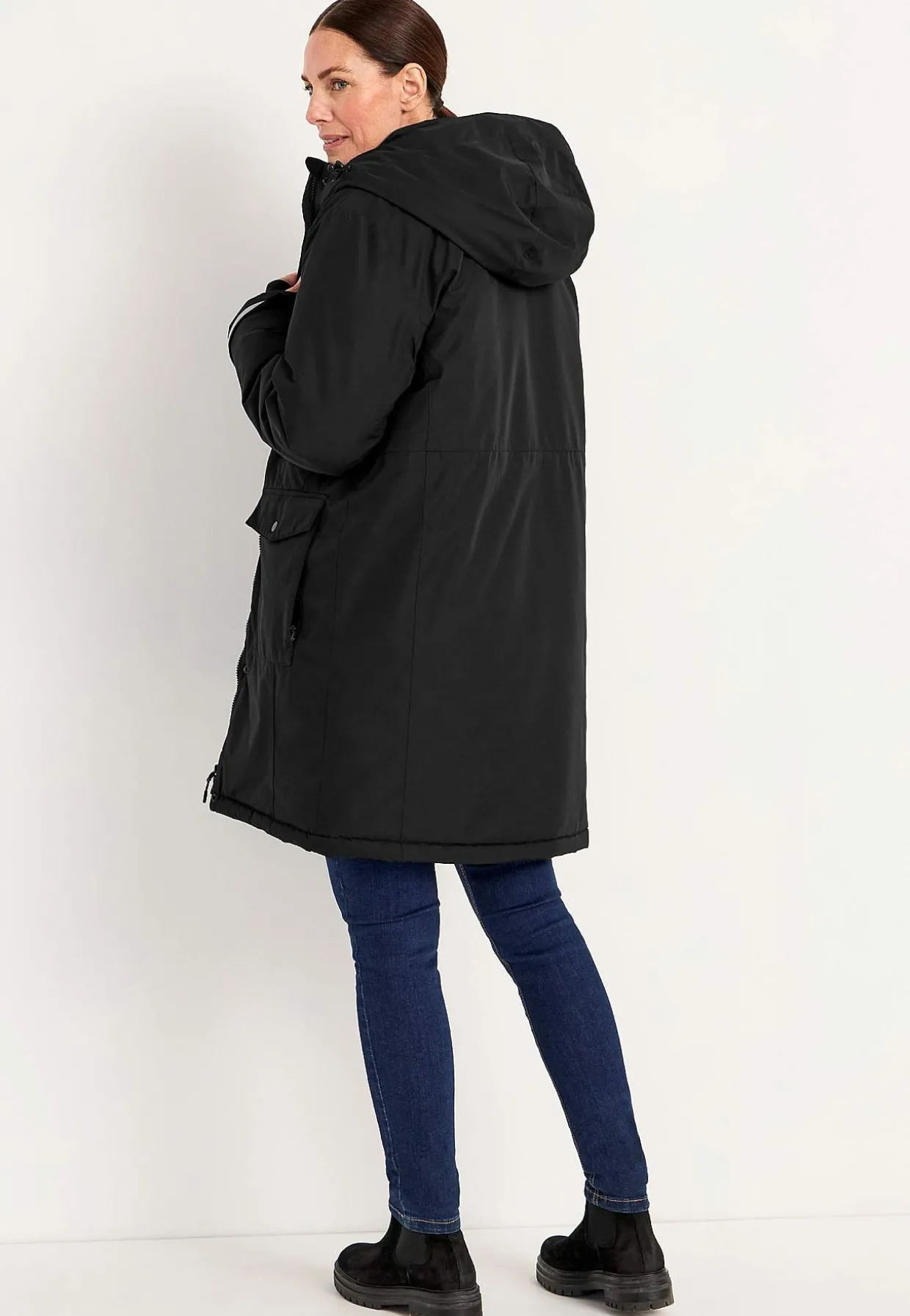 • Syet hætte med træksnøre.