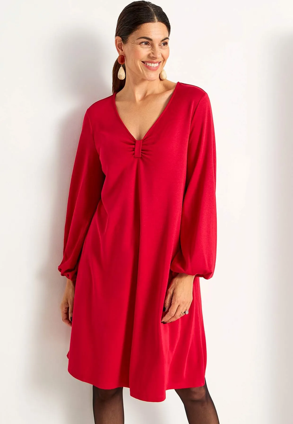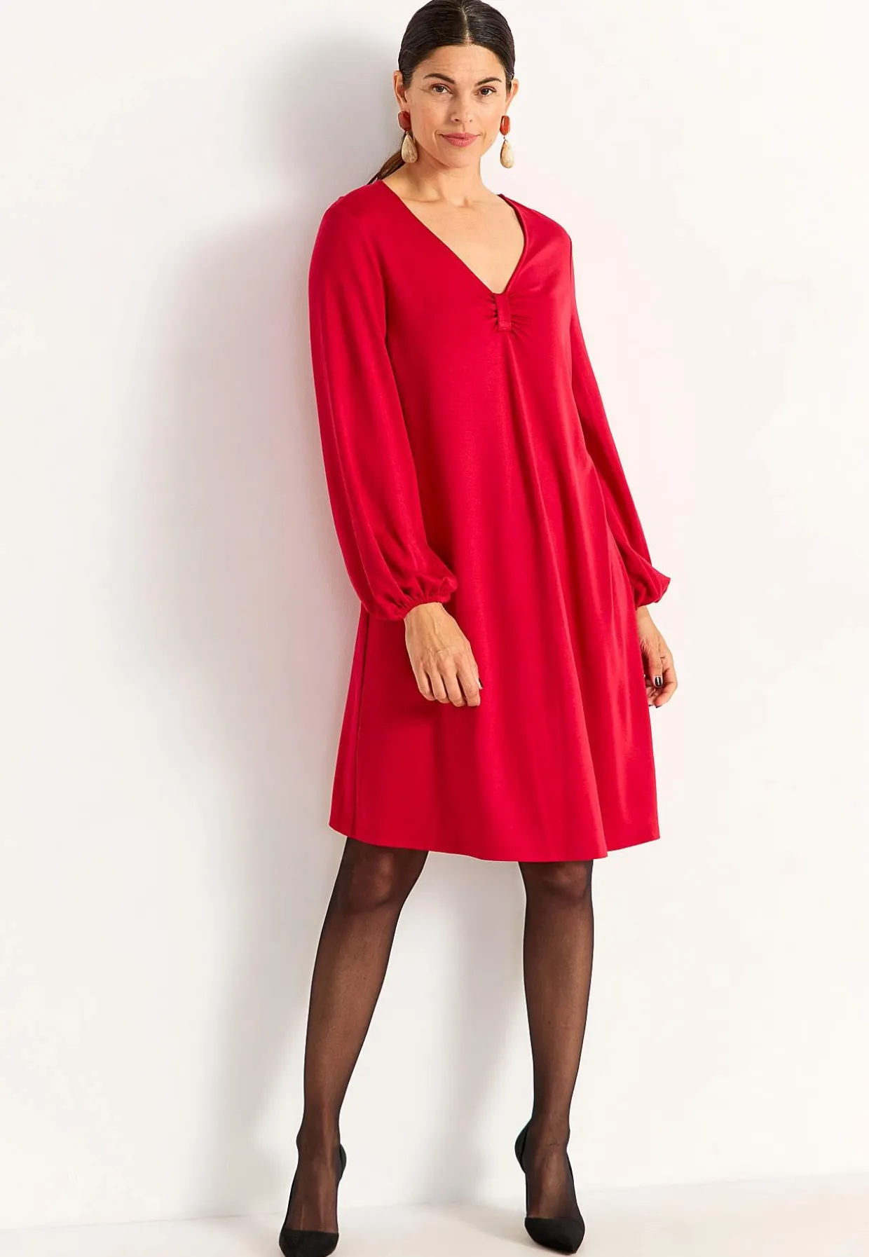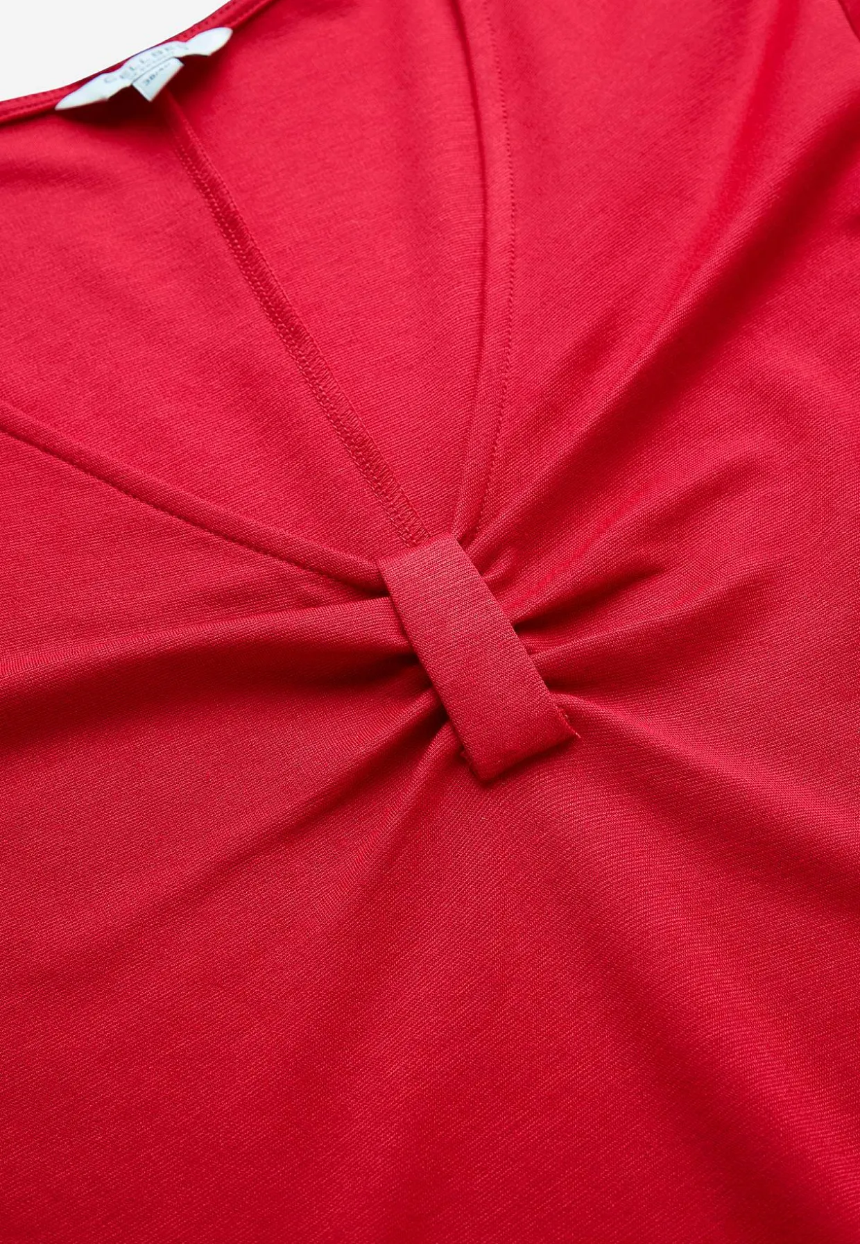 • V-udskåret halsudskæring med dekorativ rynkedetalje.