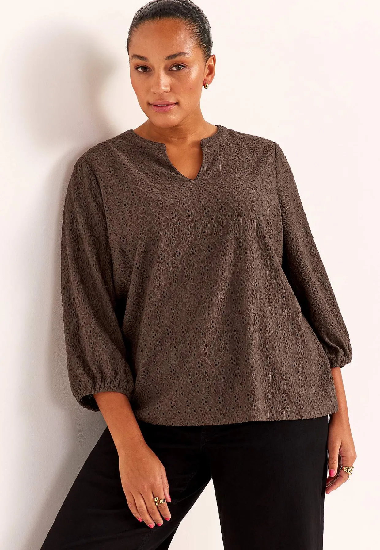 • Trekvartlange, brede ærmer med elastik ved manchetterne.