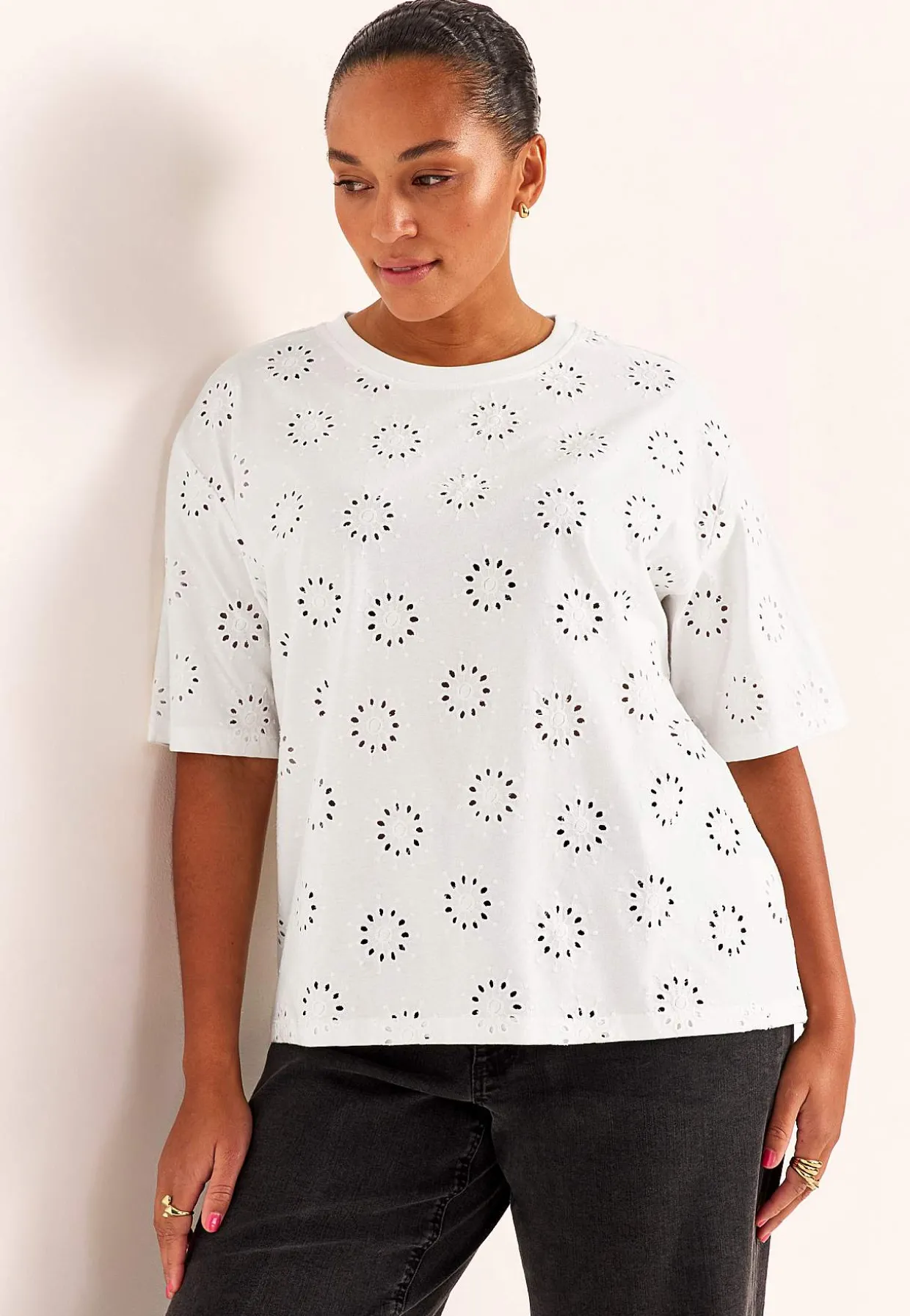 • Dekorativt hulmønster med broderie anglaise.