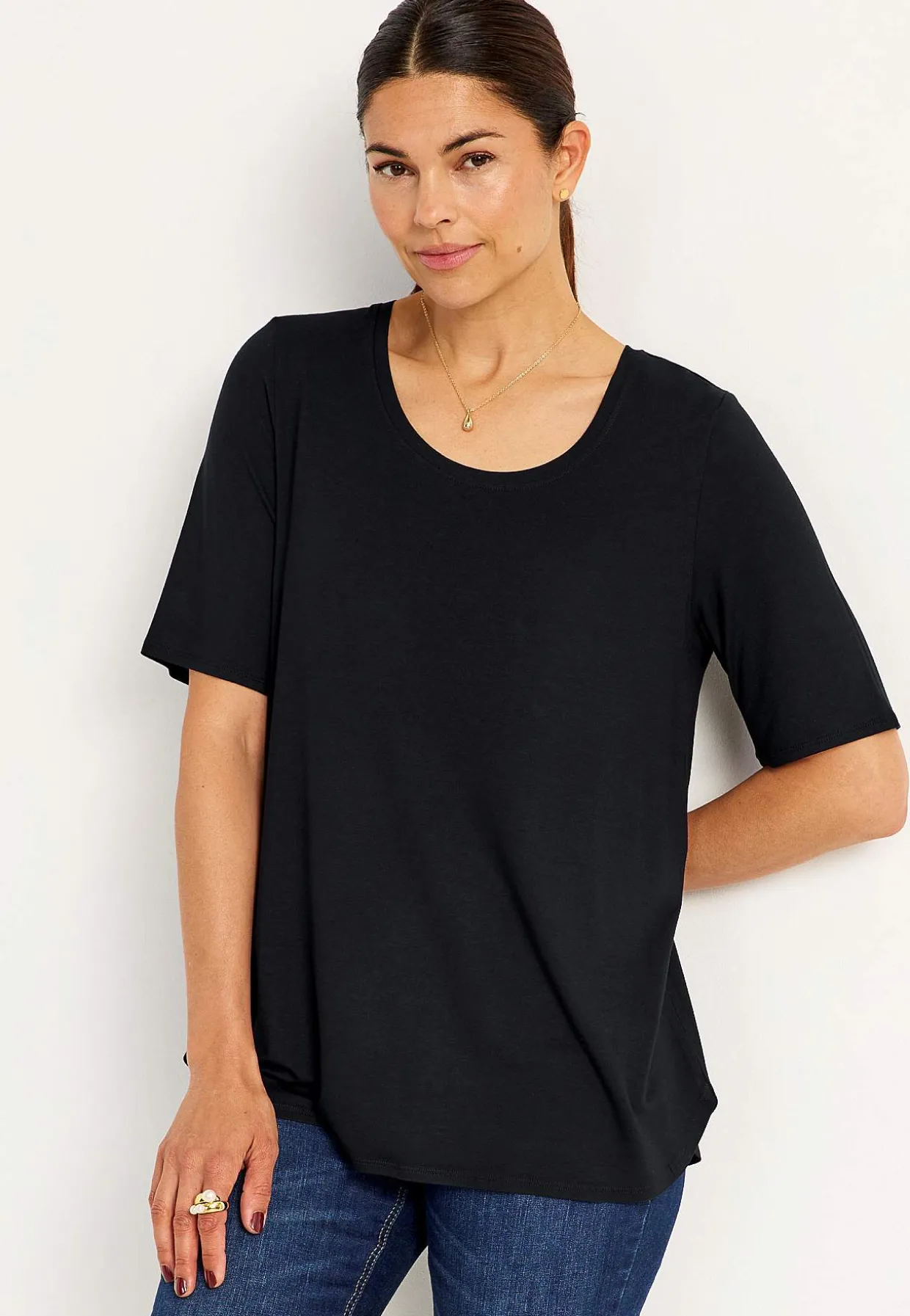 • Afrundet, bred halsudskæring.