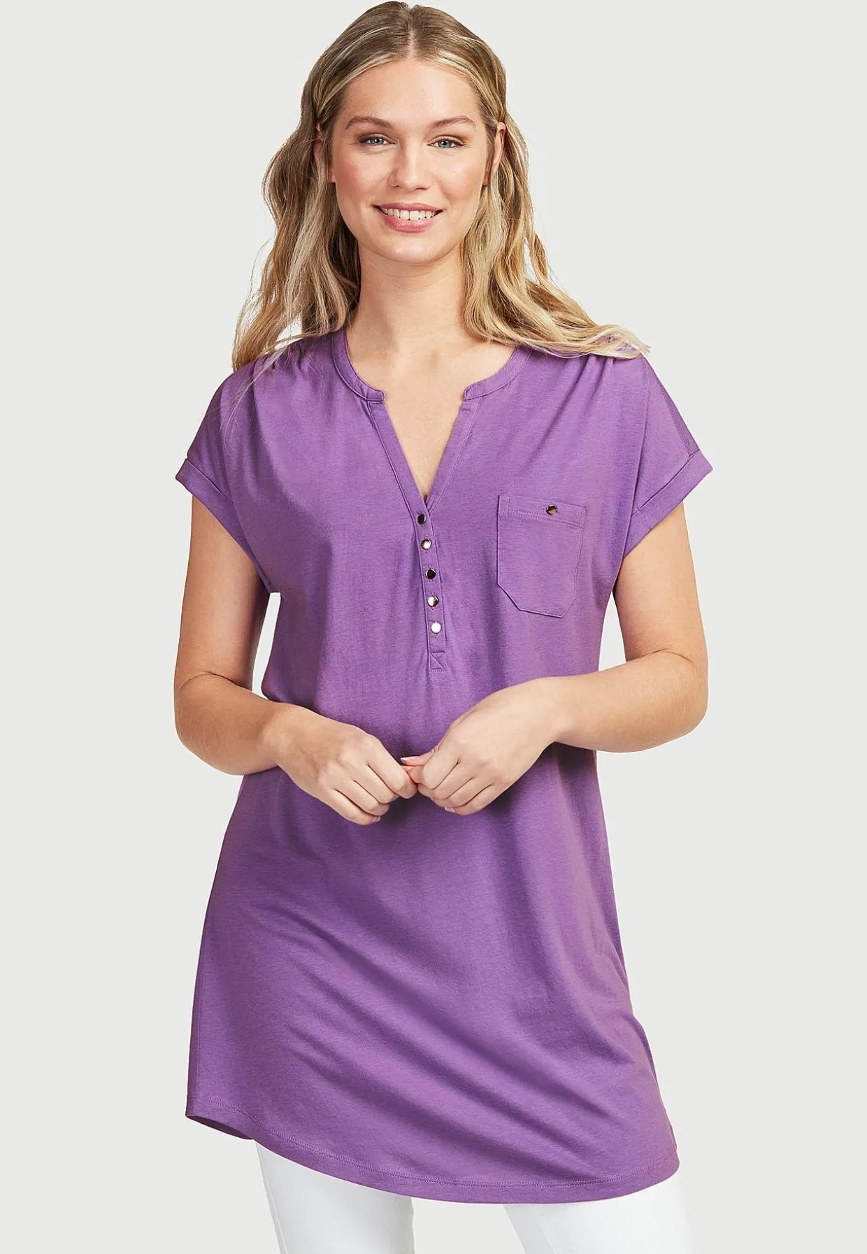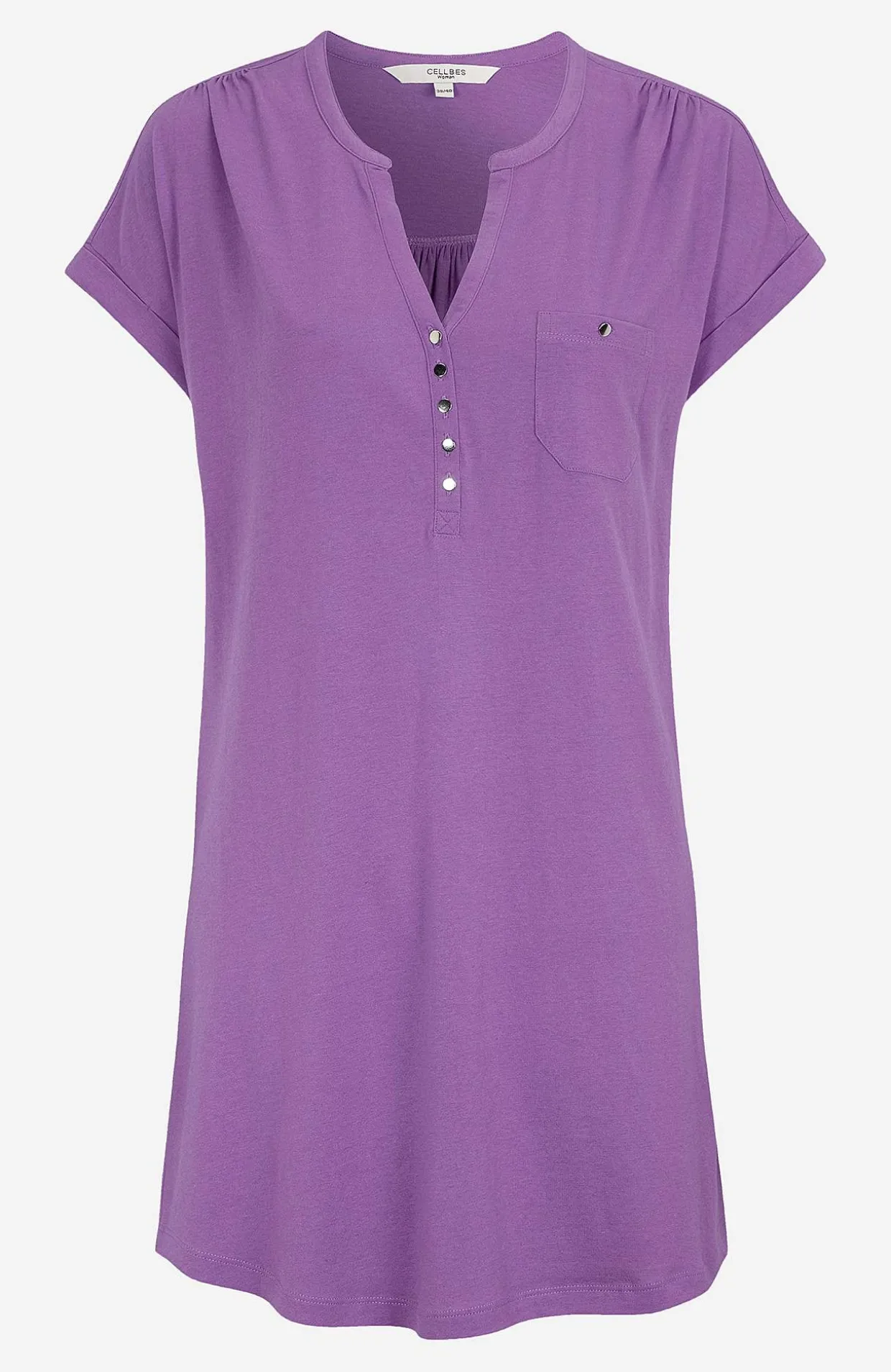• Rund halsudskæring med v-udskæring og knapstolpe foran med sølvfarvede metalknapper.