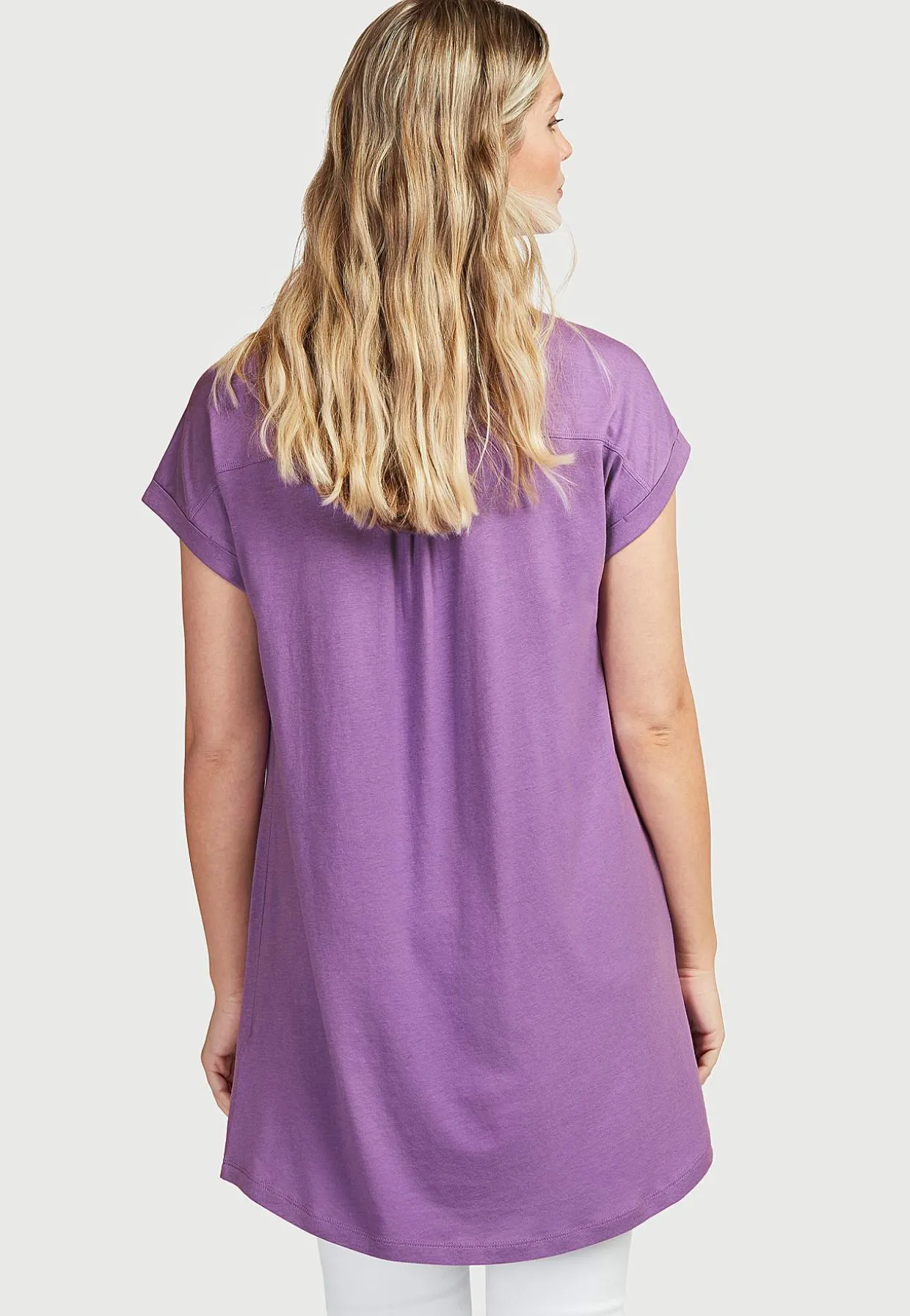 • Kort ærme med samling på skulderen og syet oprullet ved manchetterne.
