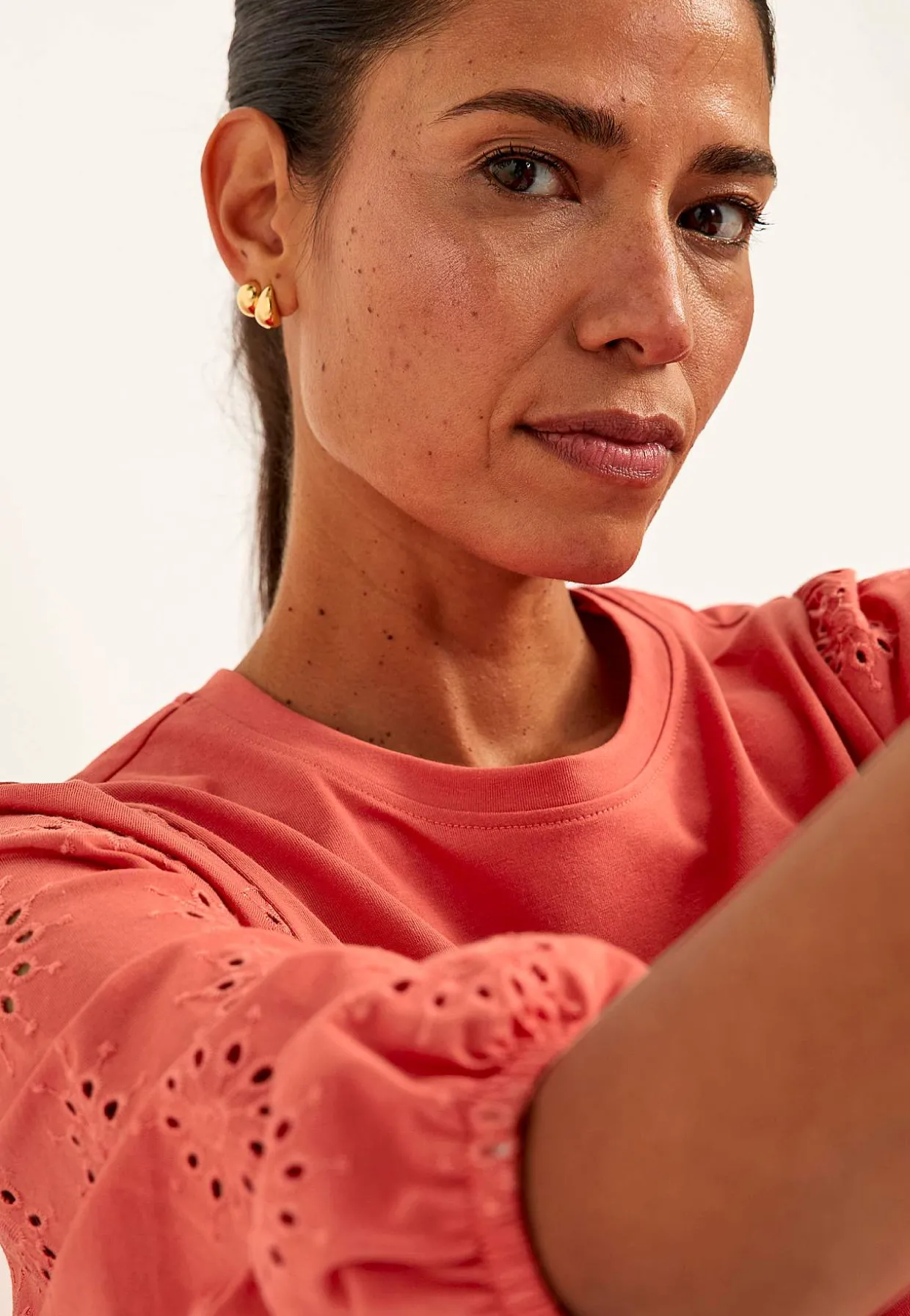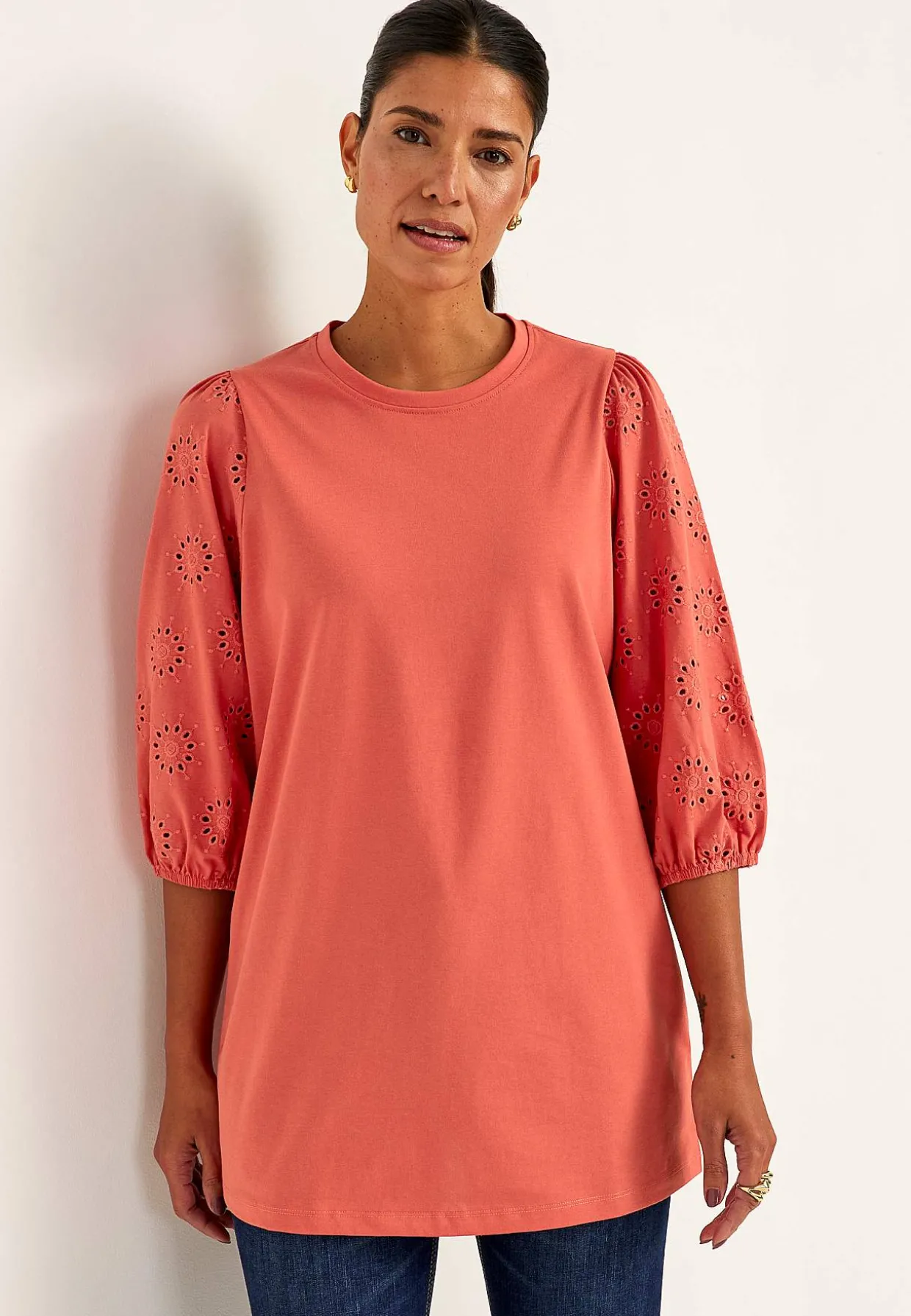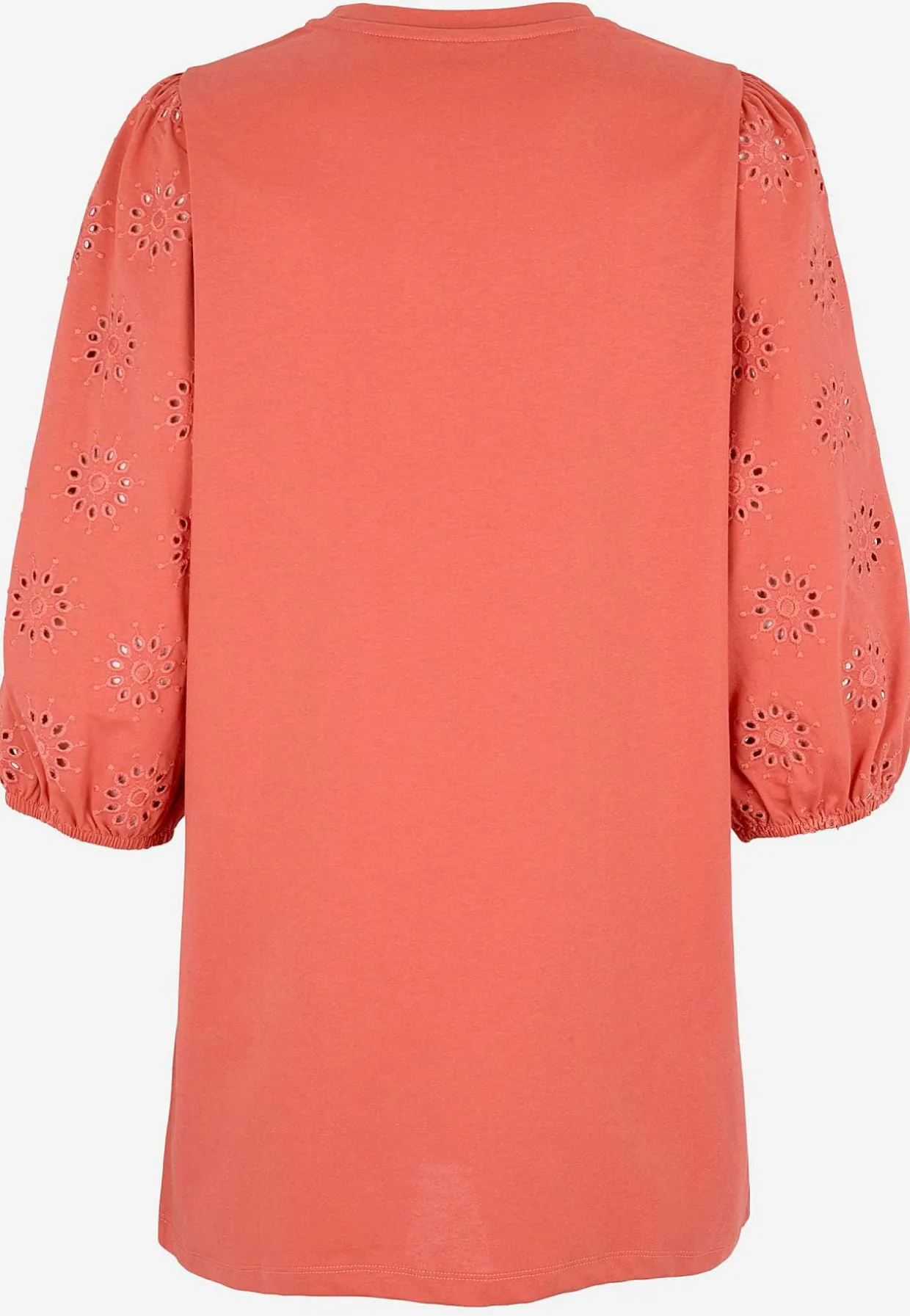• Brede, 3/4 lange ærmer med hulmønster med broderie anglaise og elastik ved manchetterne.