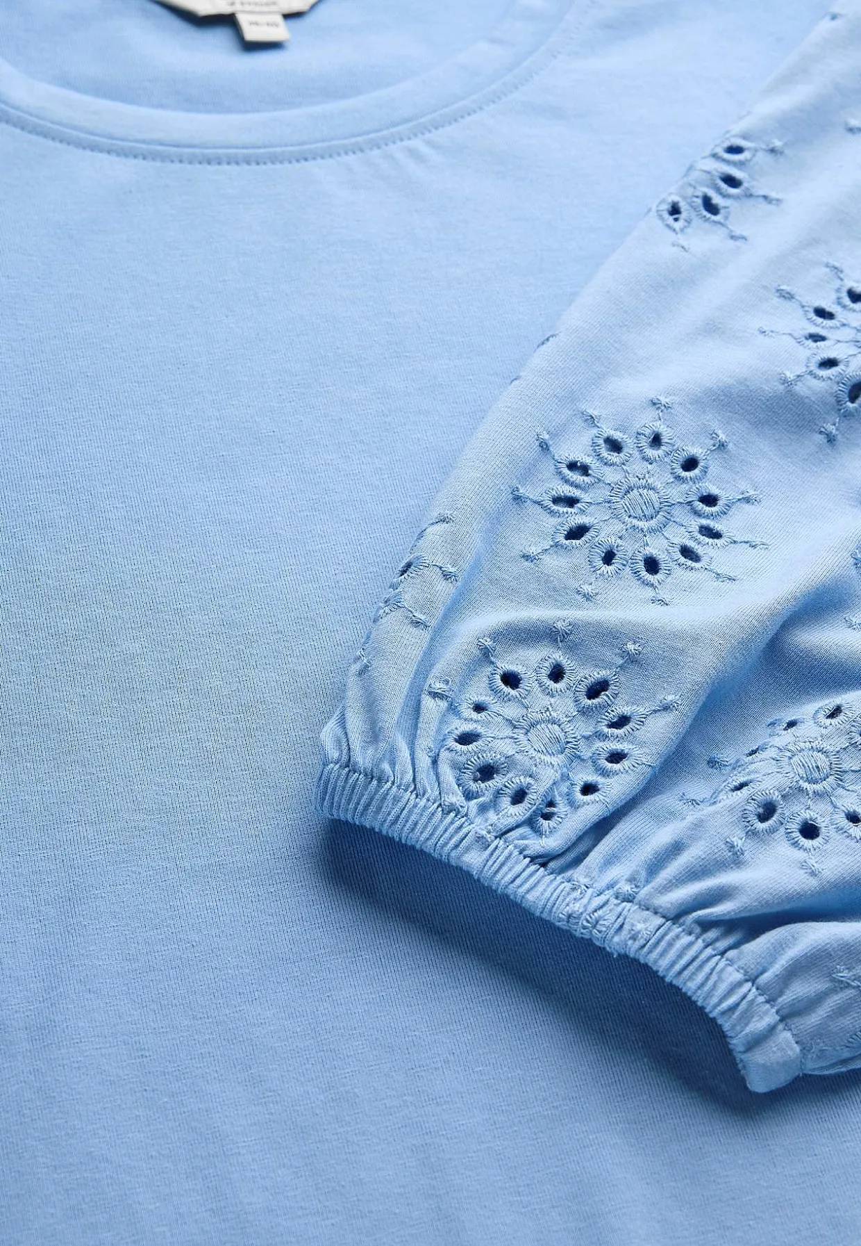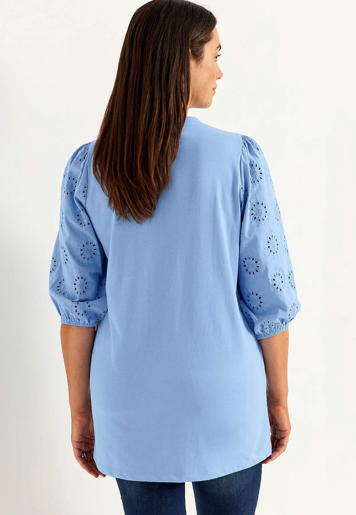 • Brede, 3/4 lange ærmer med hulmønster med broderie anglaise og elastik ved manchetterne.