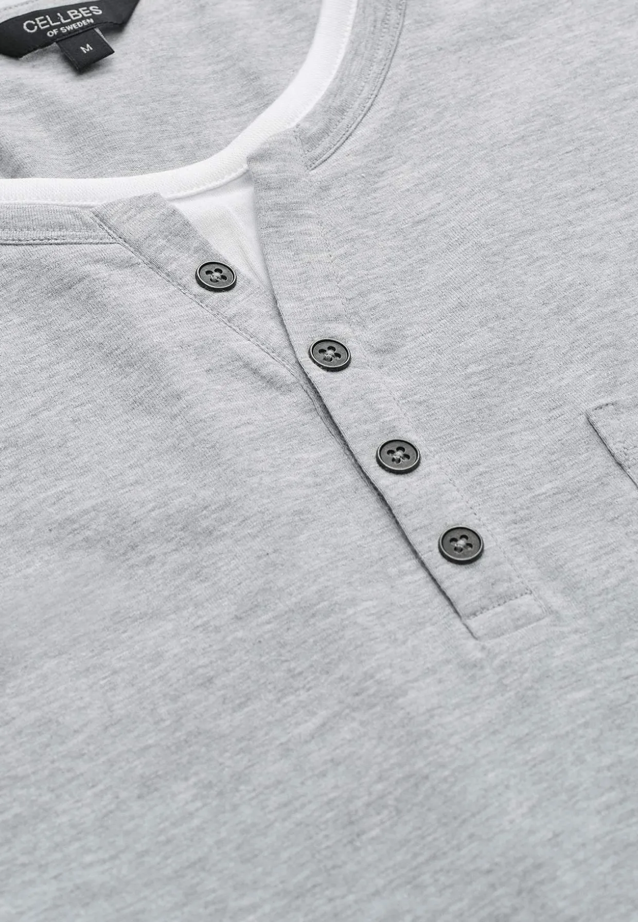 • Rund halsudskæring med lille v-udskæring og en falsk knapåbning.