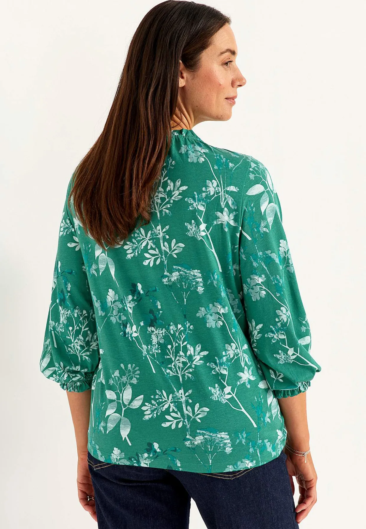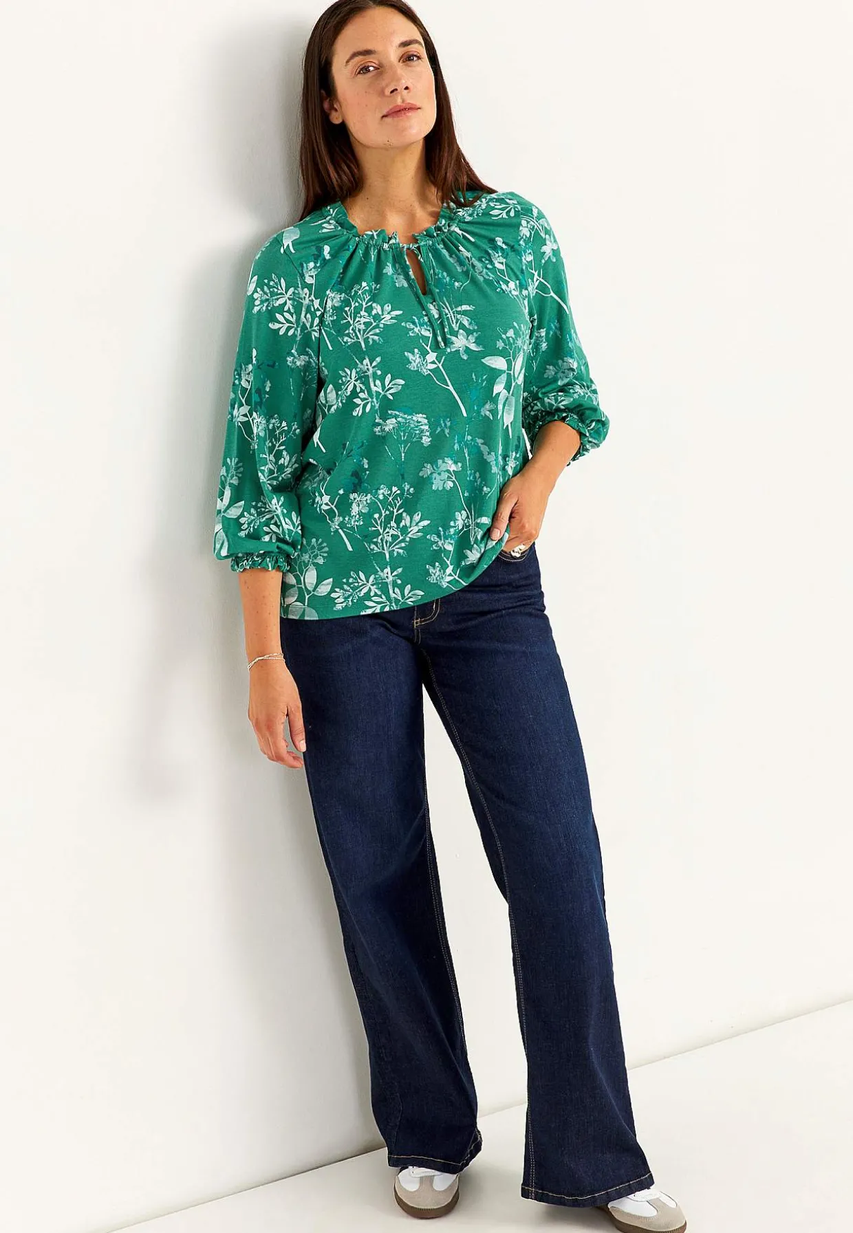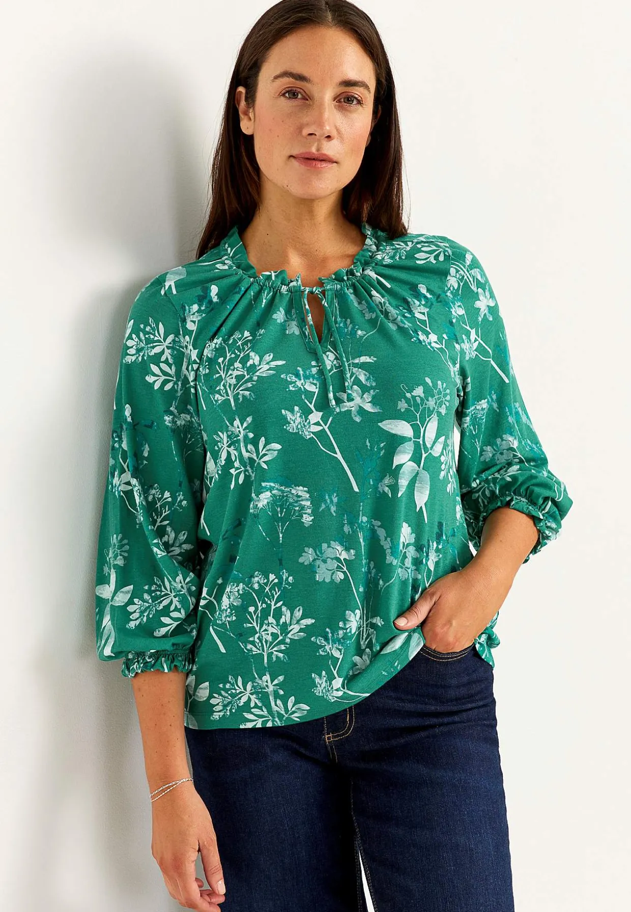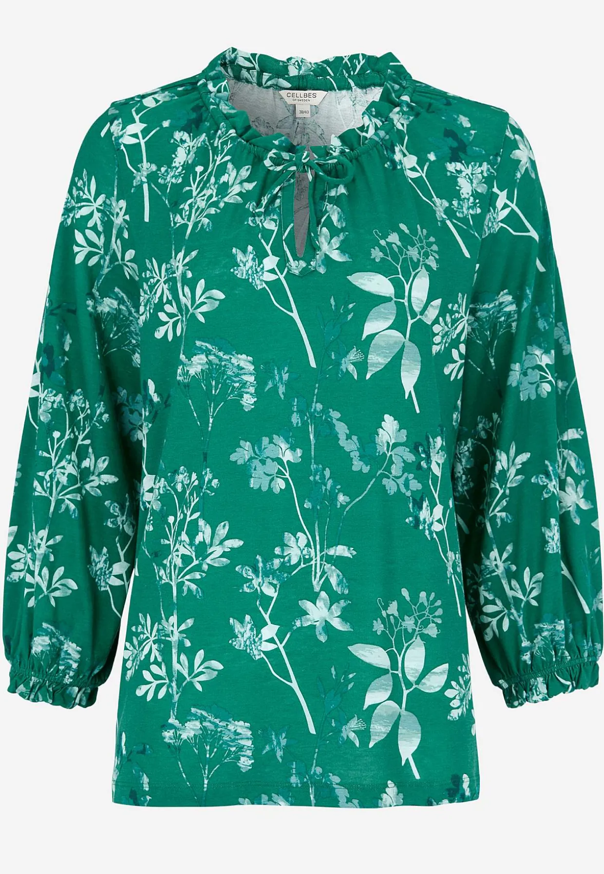 • 3/4 lange, brede ærmer med elastik og lille volant ved manchetterne.