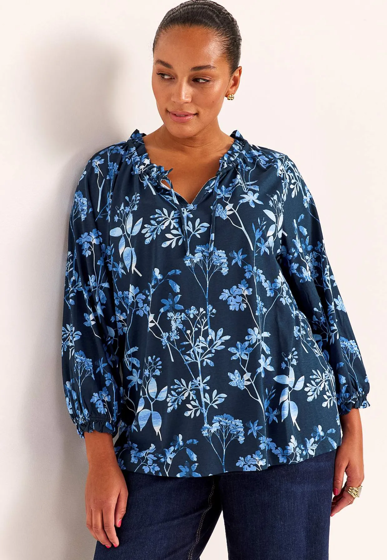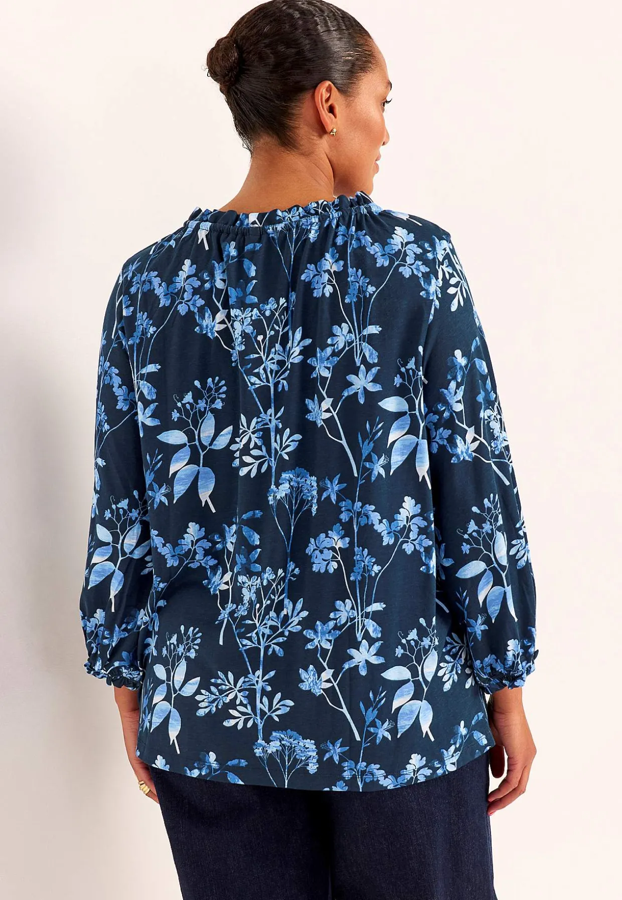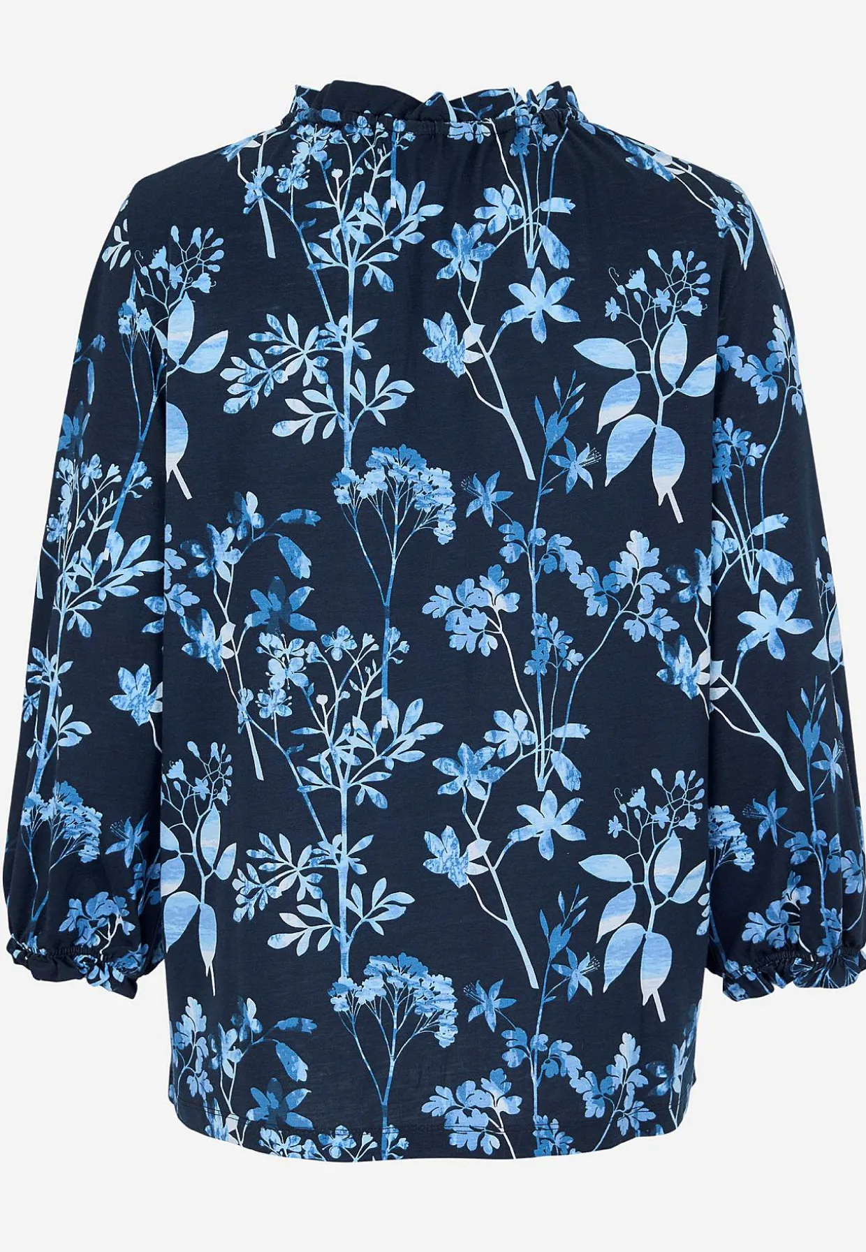 • 3/4 lange, brede ærmer med elastik og lille volant ved manchetterne.