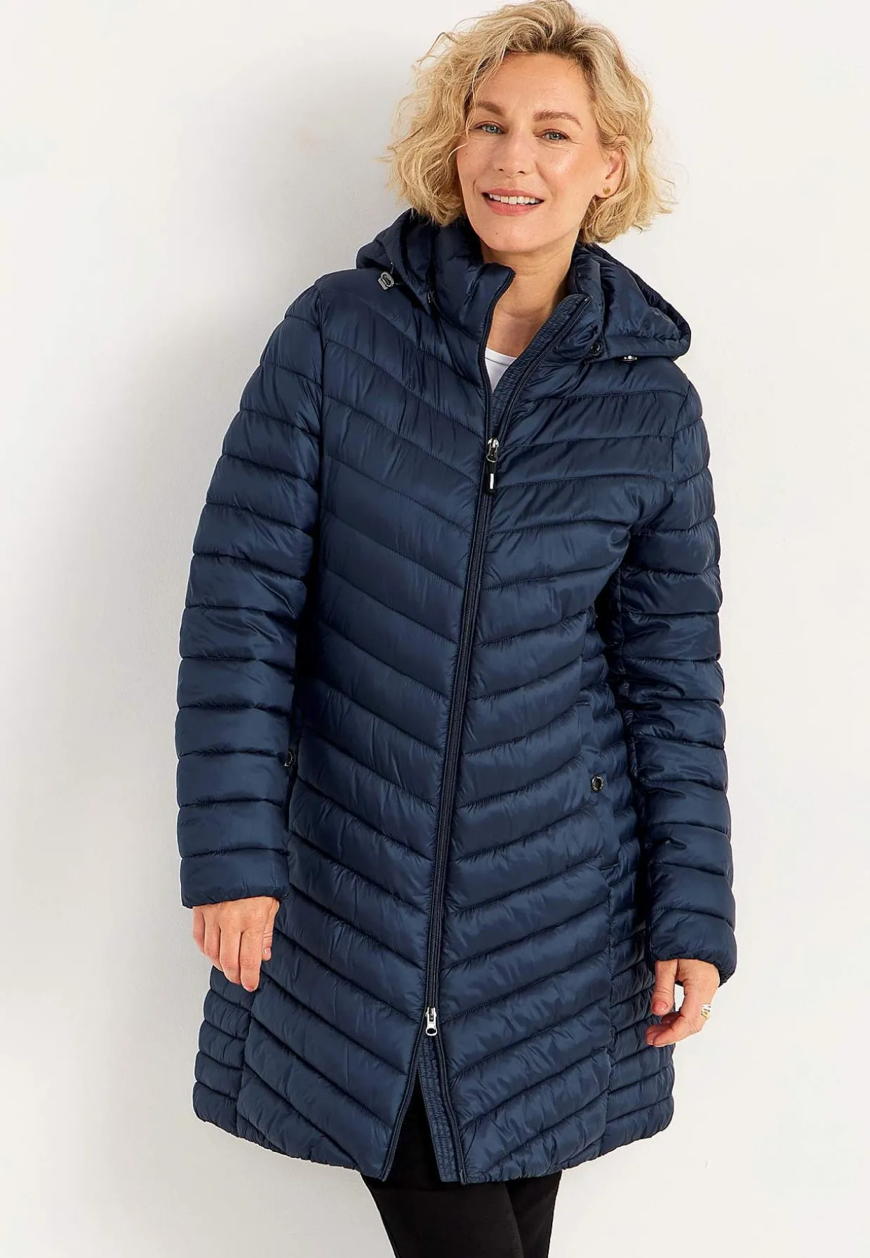 Lang letvægtsjakke med to-vejs lynlås og aftagelig hætte.