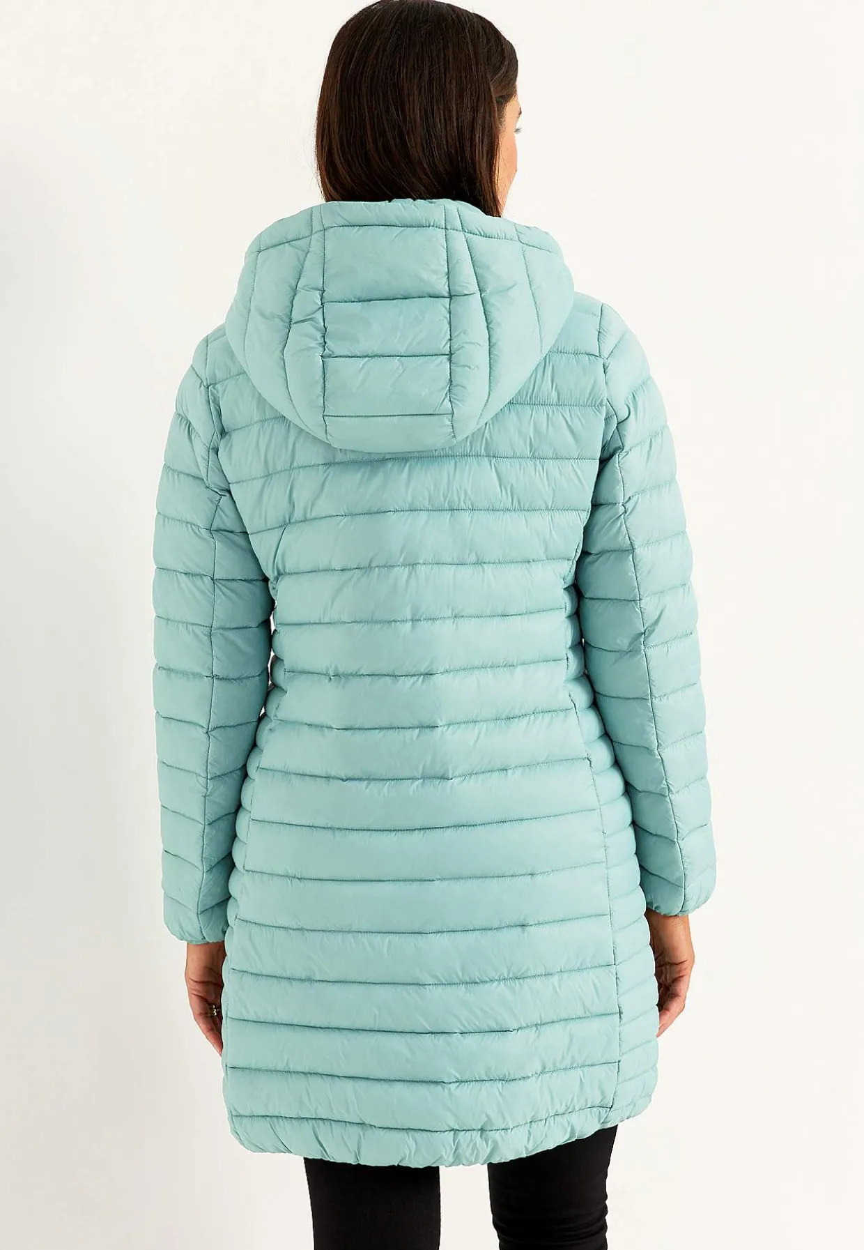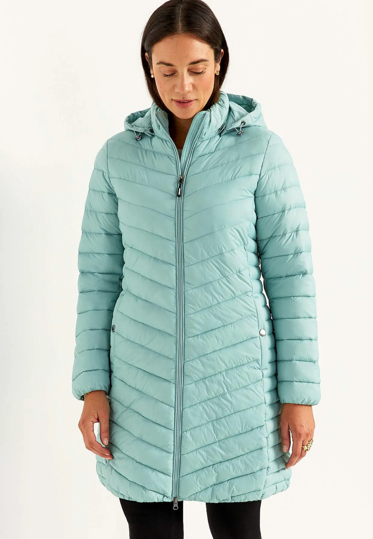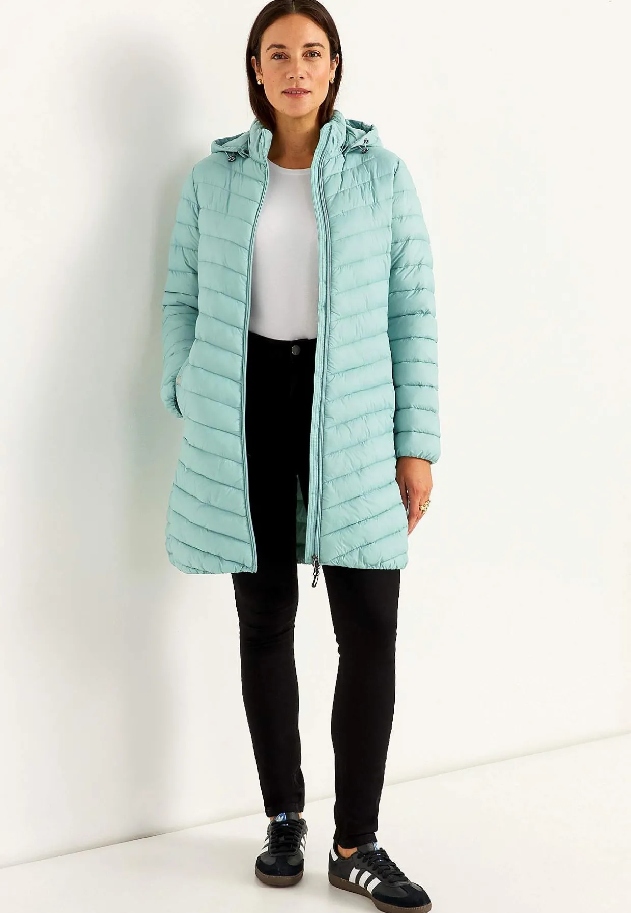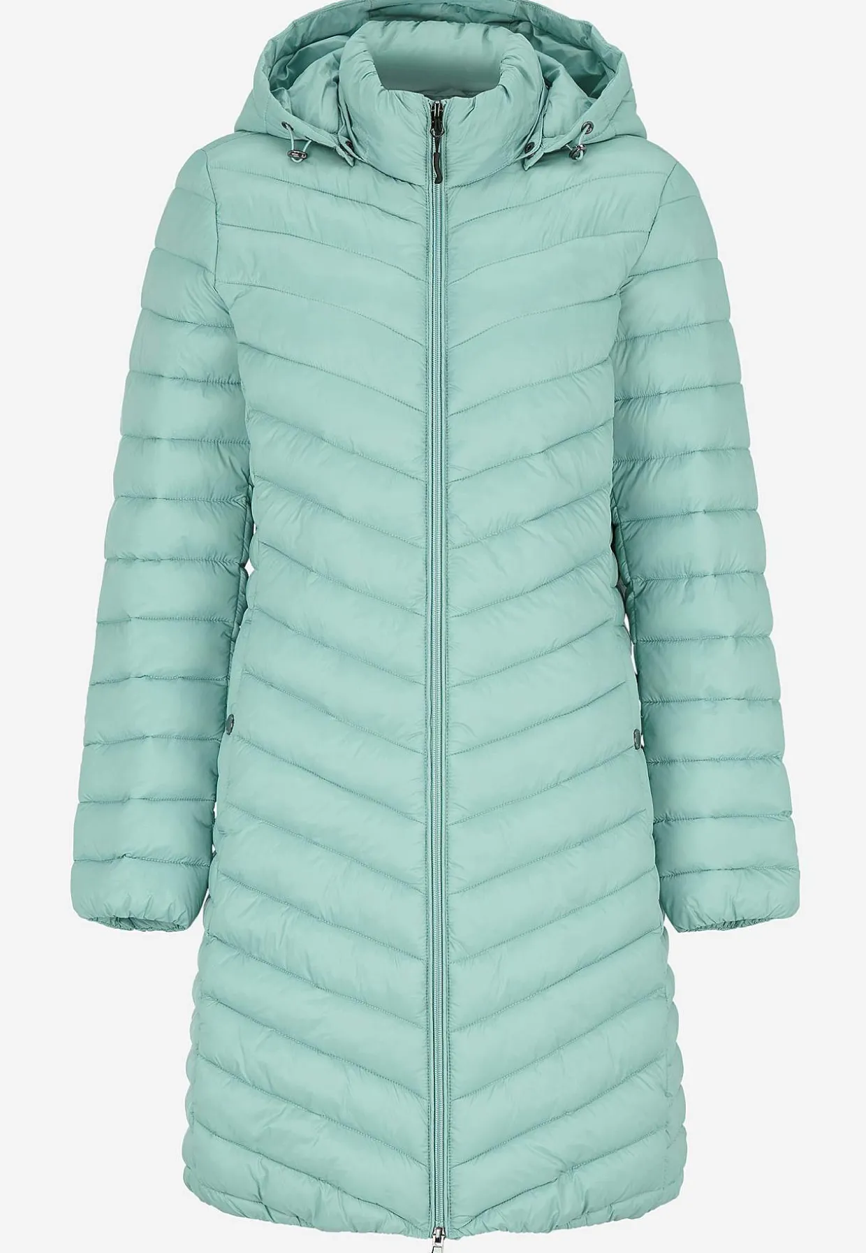 Lang letvægtsjakke med to-vejs lynlås og aftagelig hætte.
