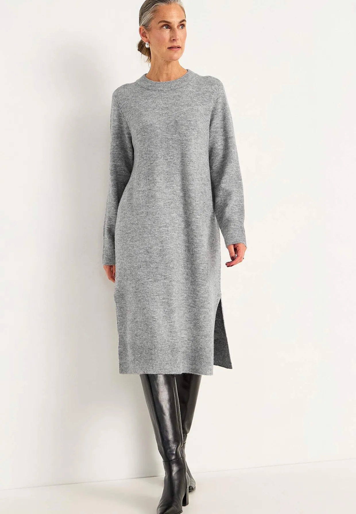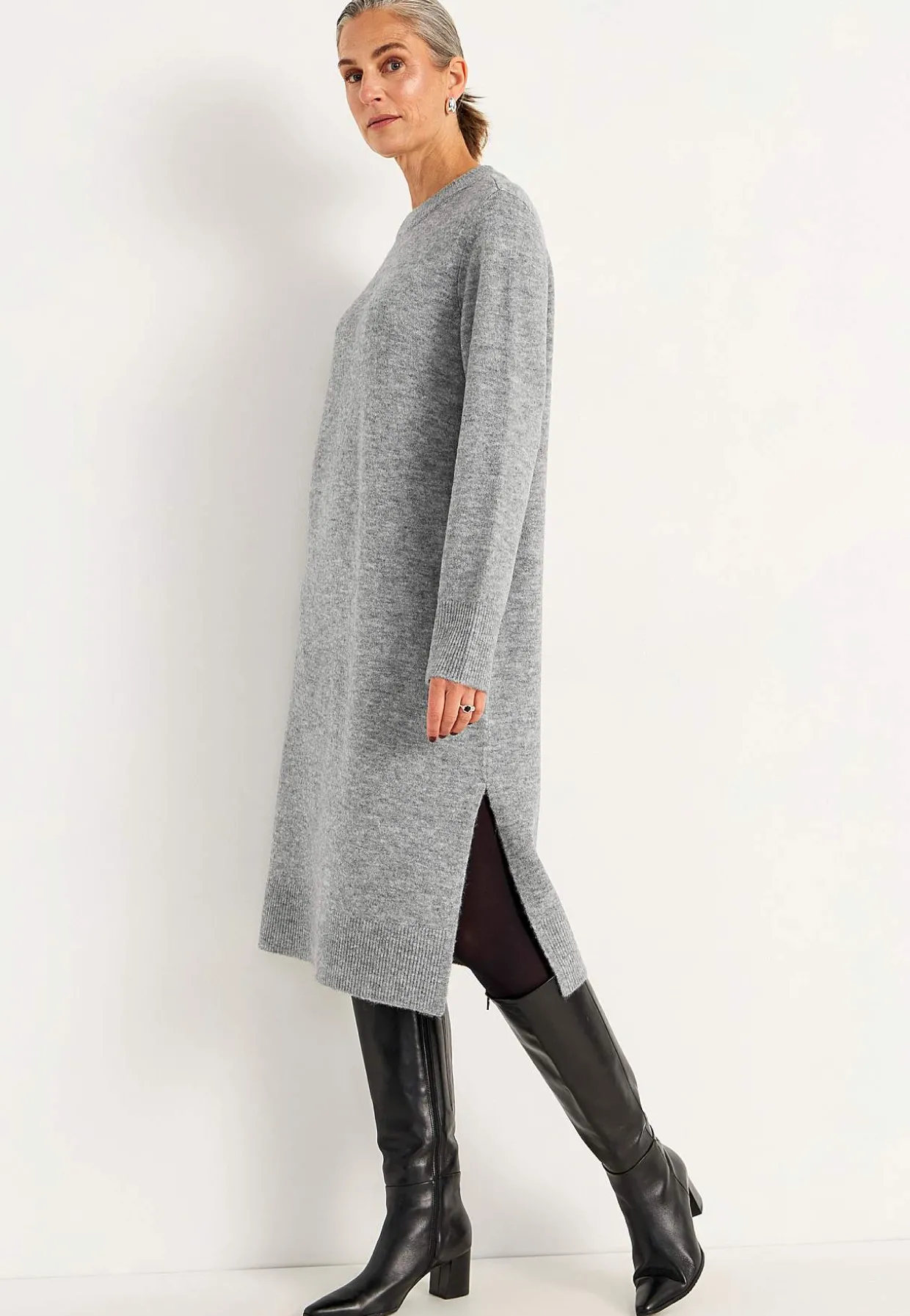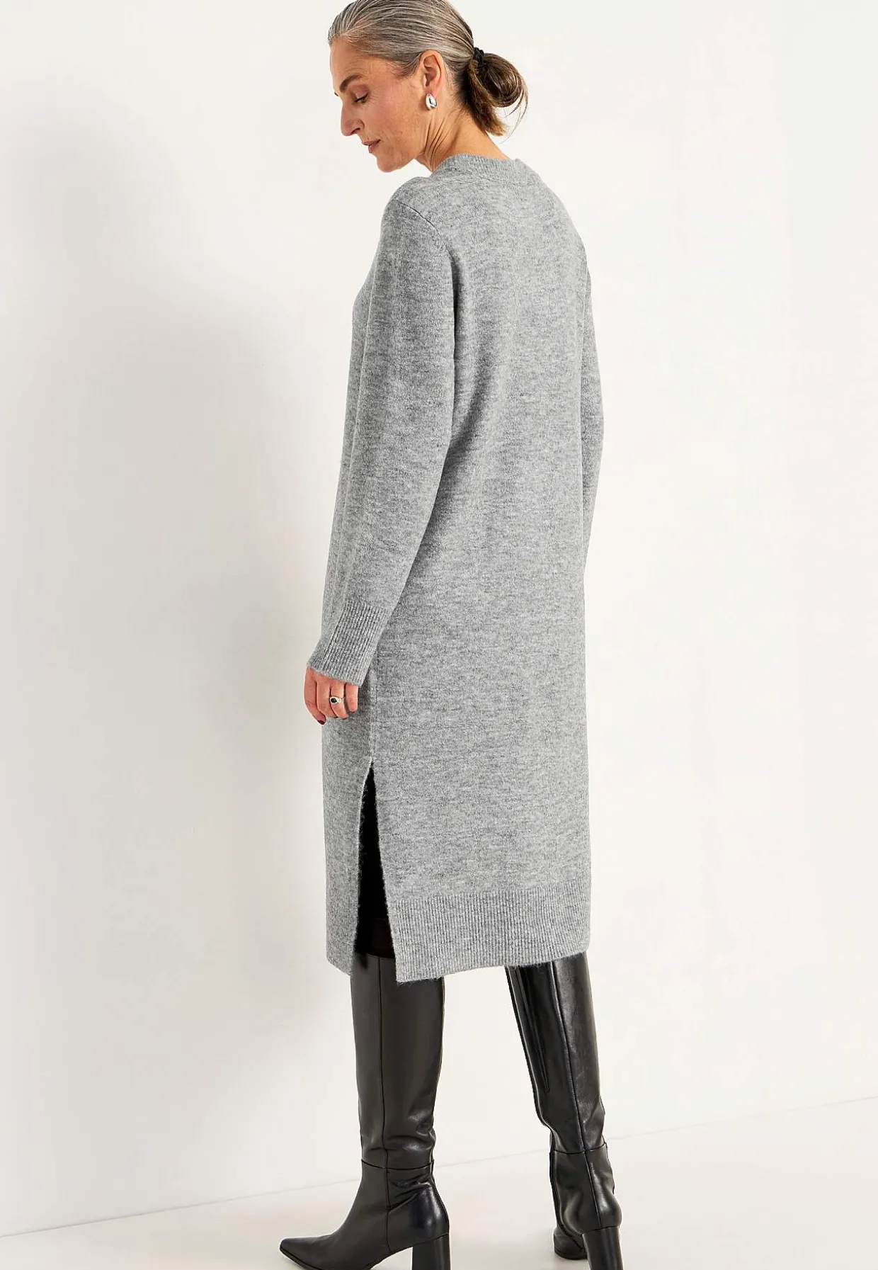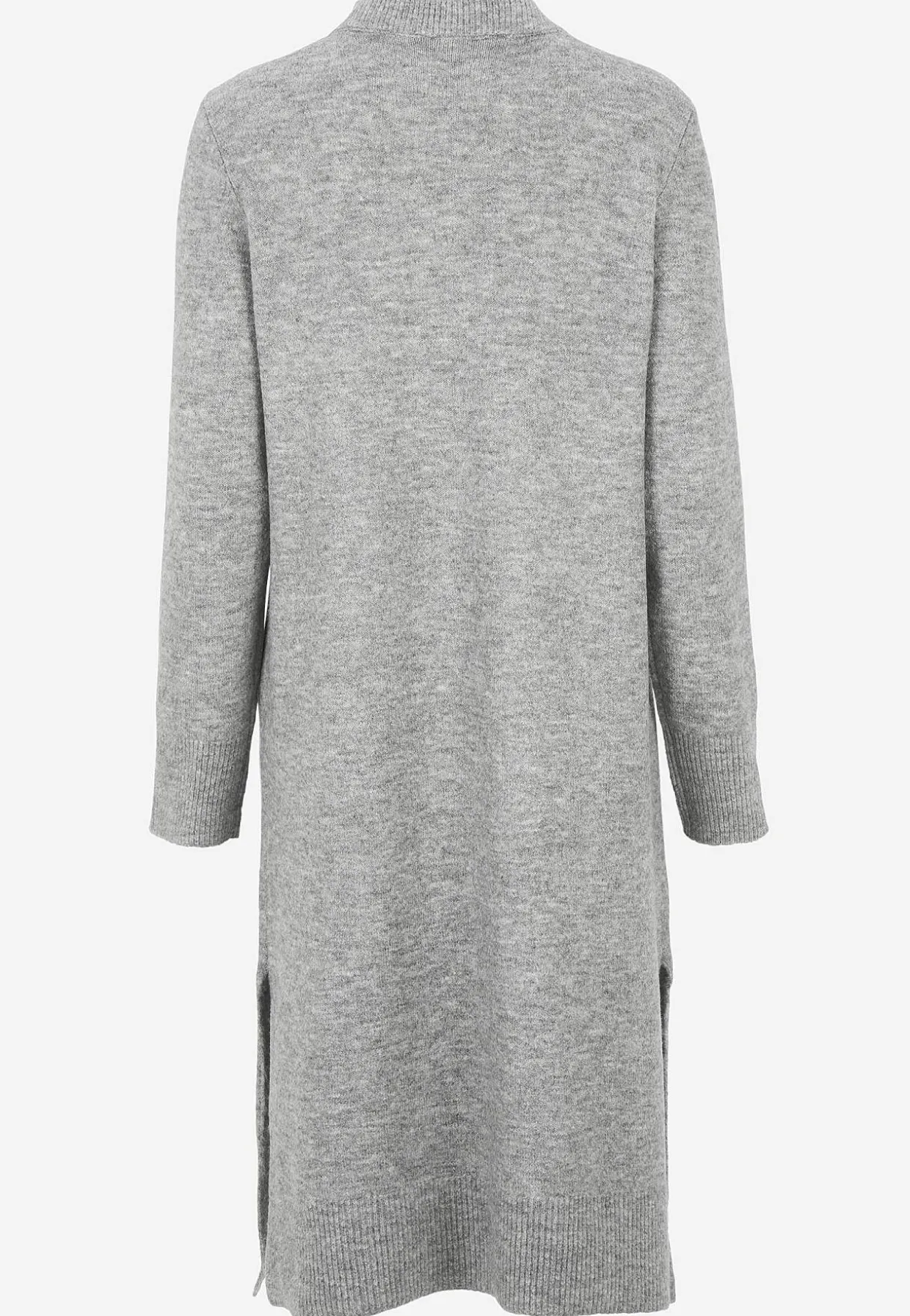 • Fintstrikket kjole med sideslidser nederst, bred ribbet kant og stræk.