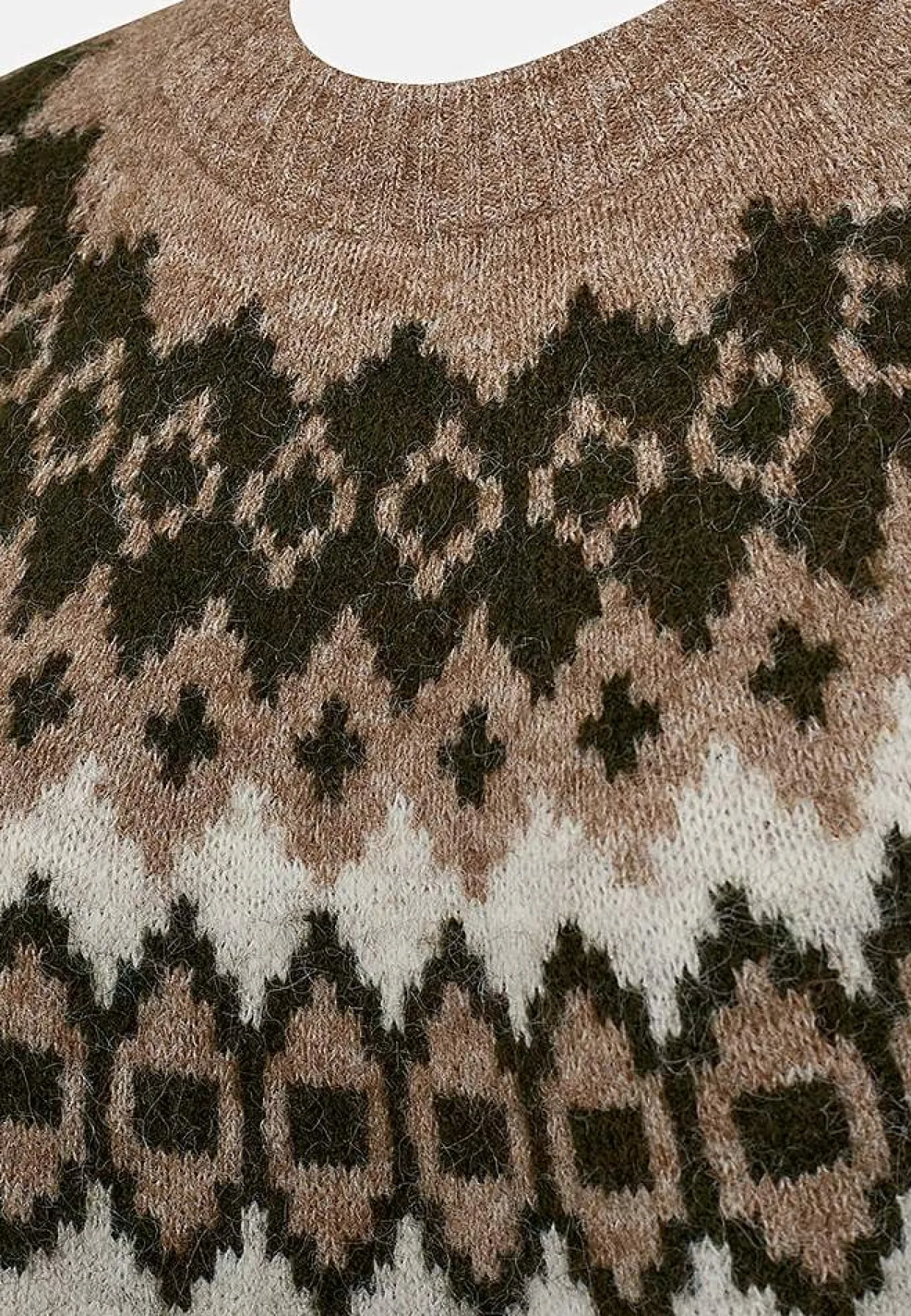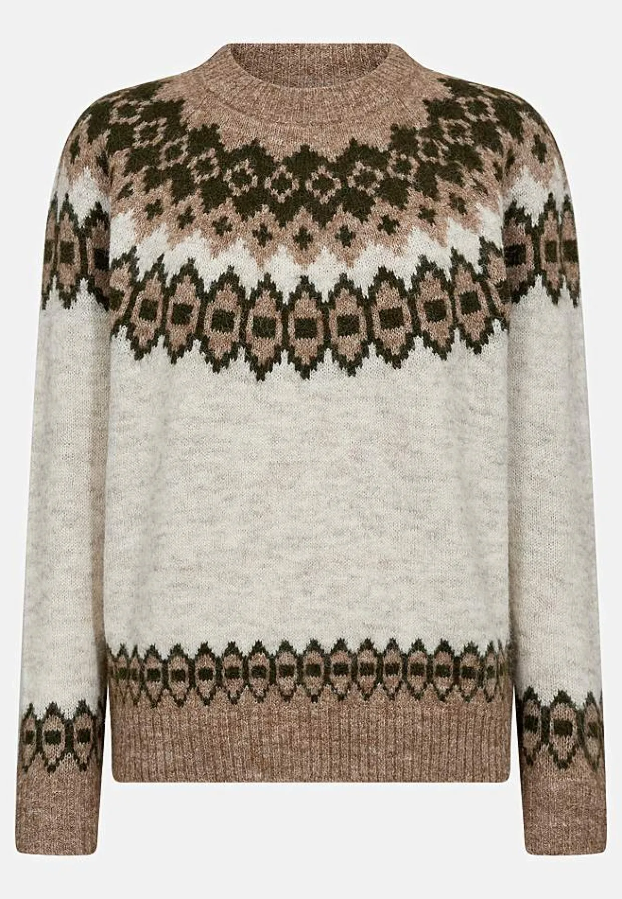 • Lange raglanærmer med mønster og ribmanchet på ærmeafslutningerne.