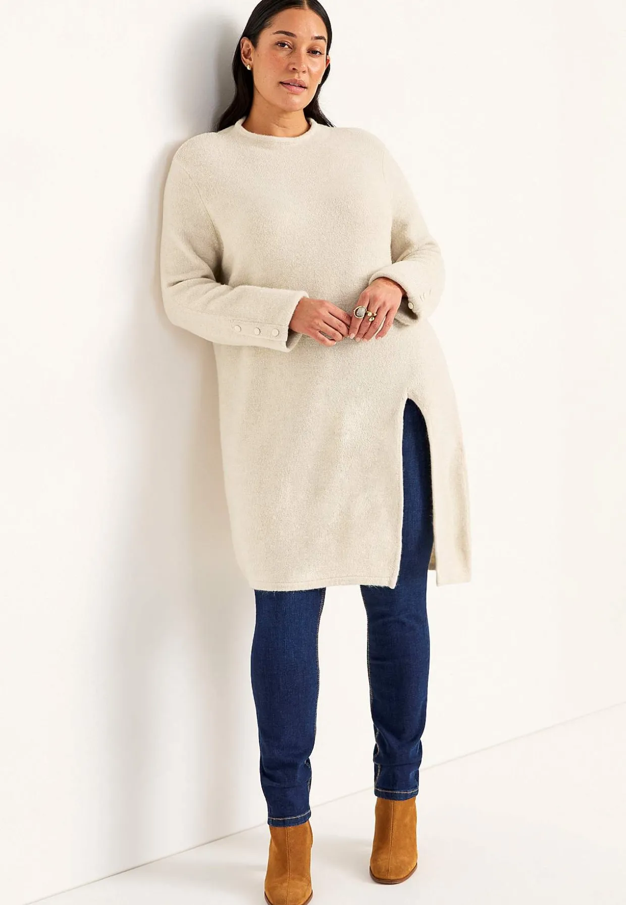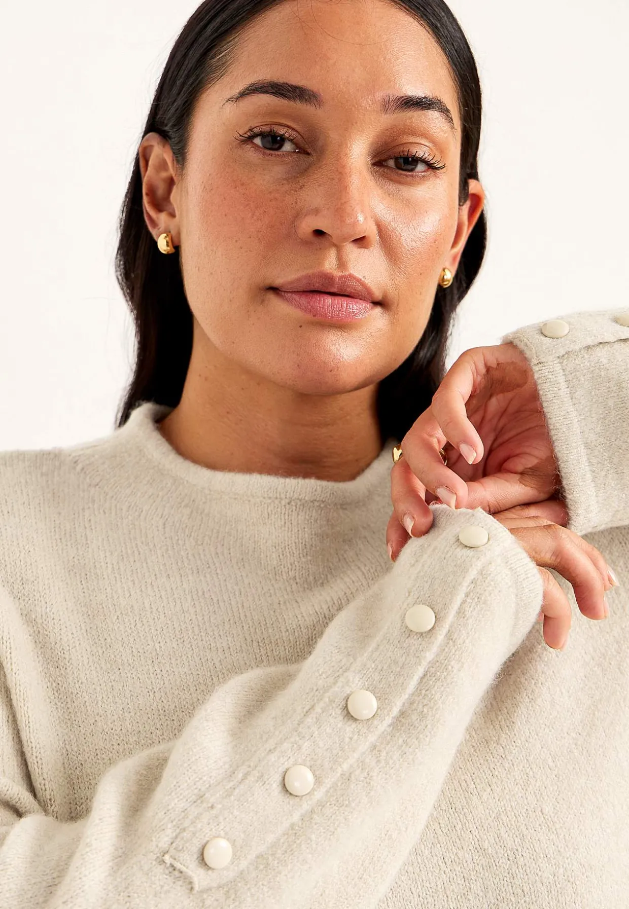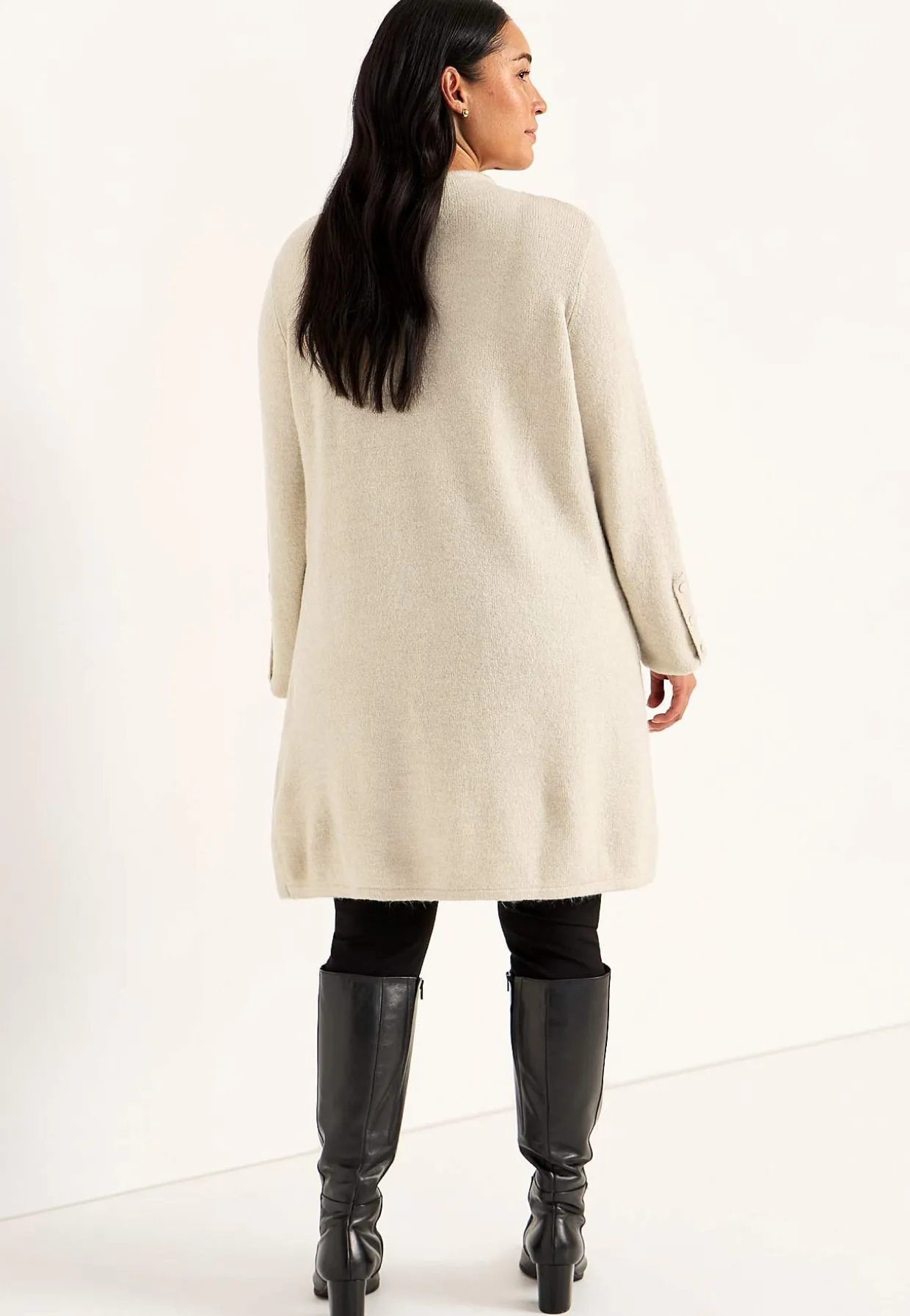 • Lange ærmer med dekorationsknapper ved manchetterne.