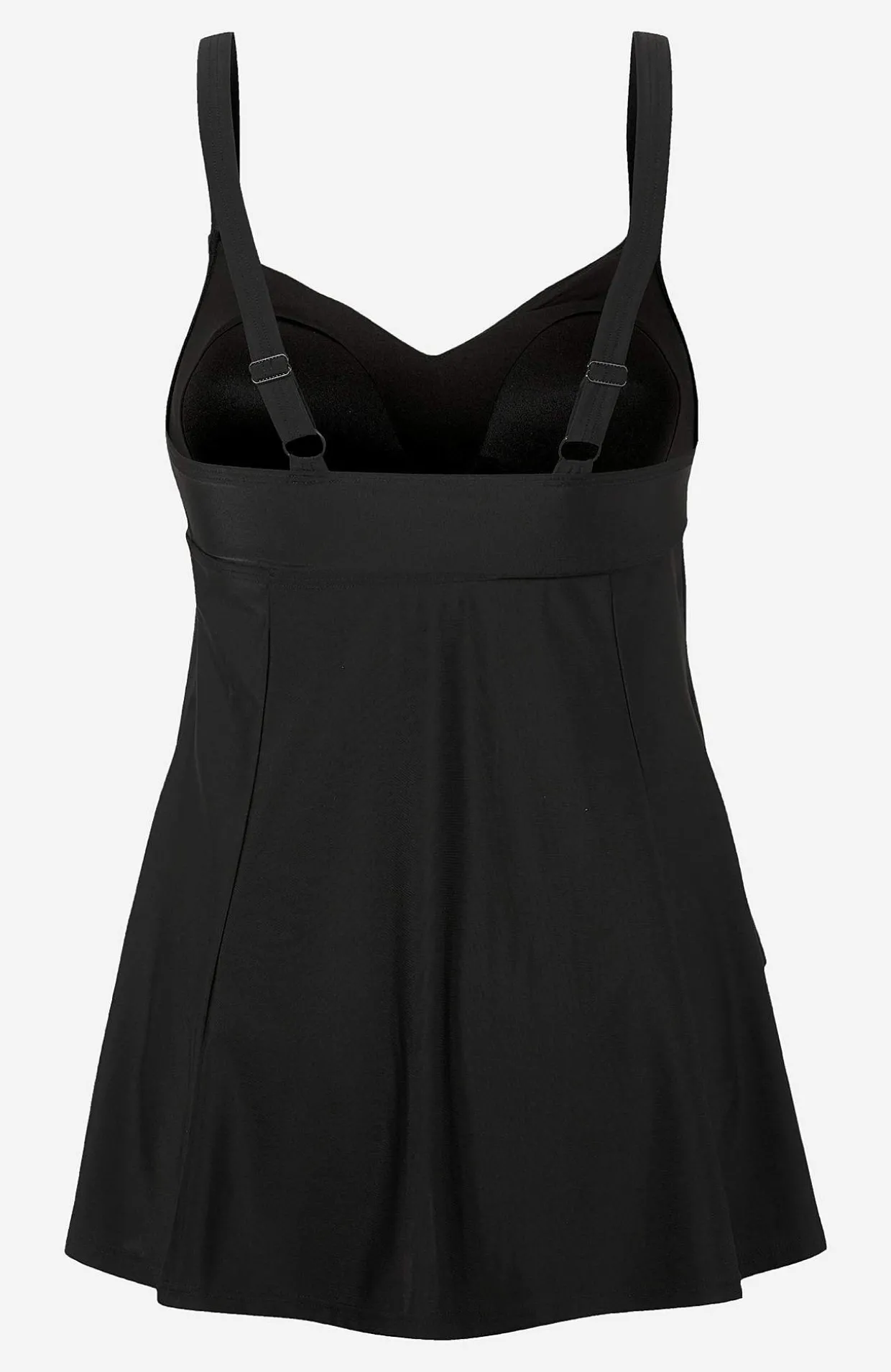 Svømmekjole med figursmigrende volanter og v-udskæring.