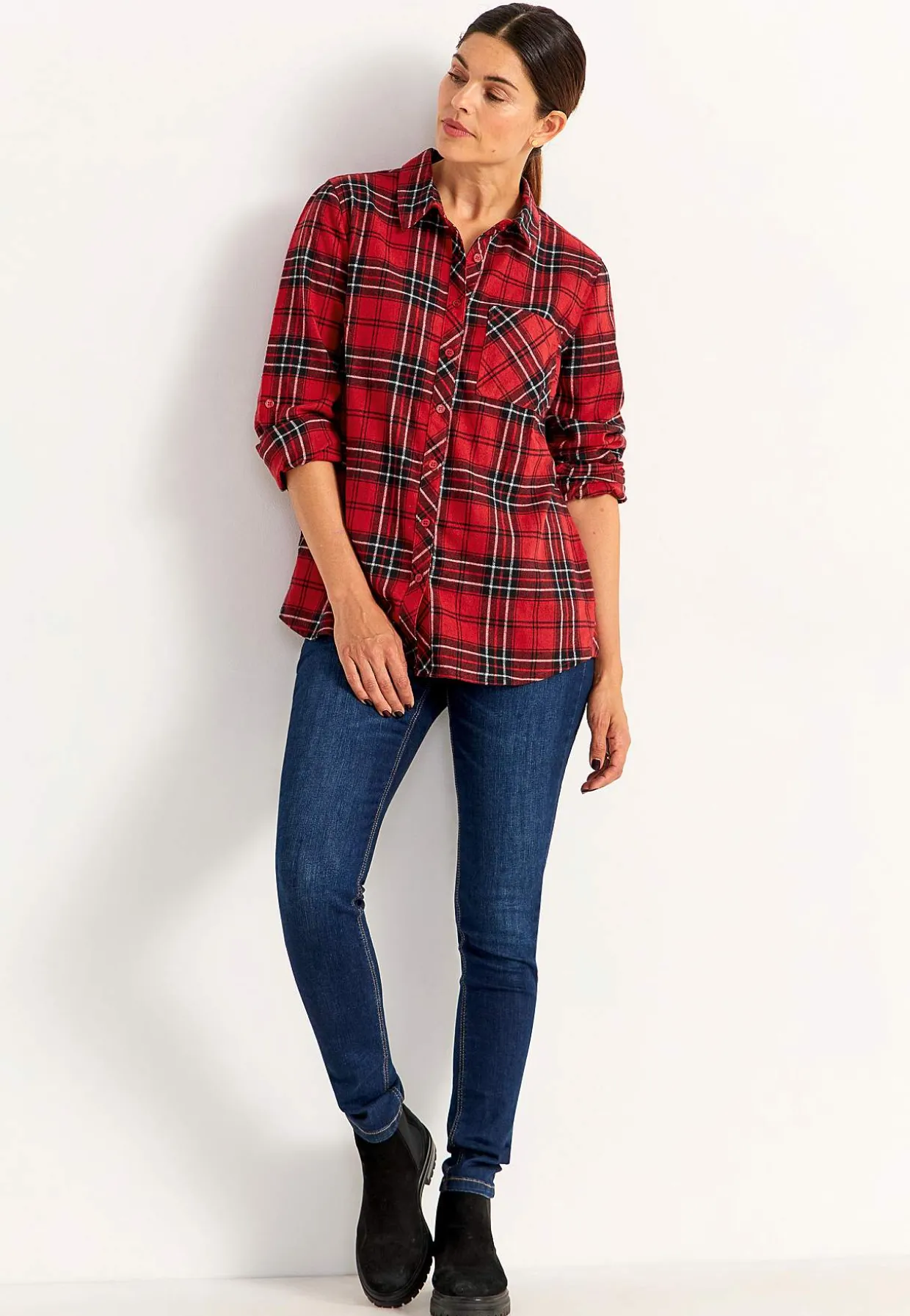 • Lange, foldbare ærmer med strop og knap.