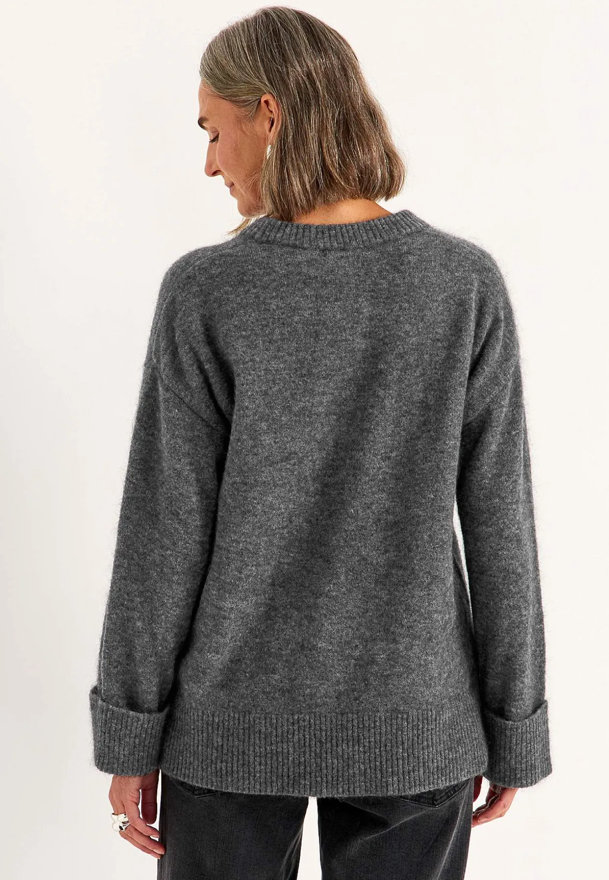• Brede, lige ærmer med bred, foldet ribmanchet ved manchetterne.