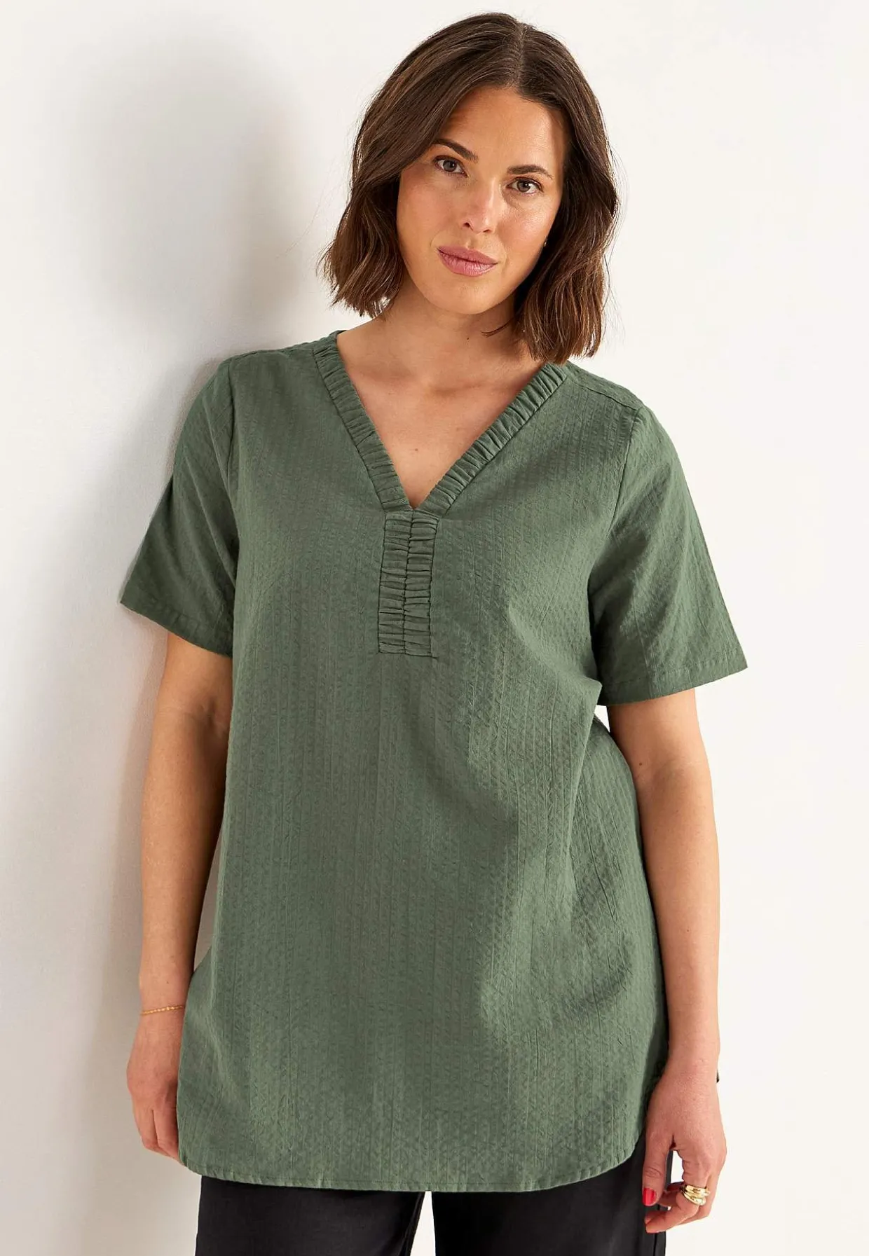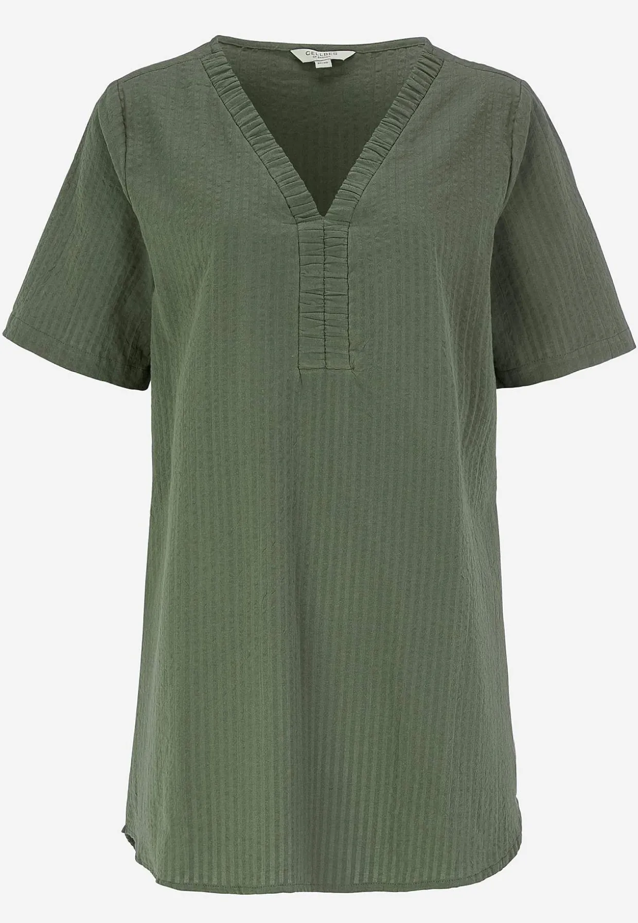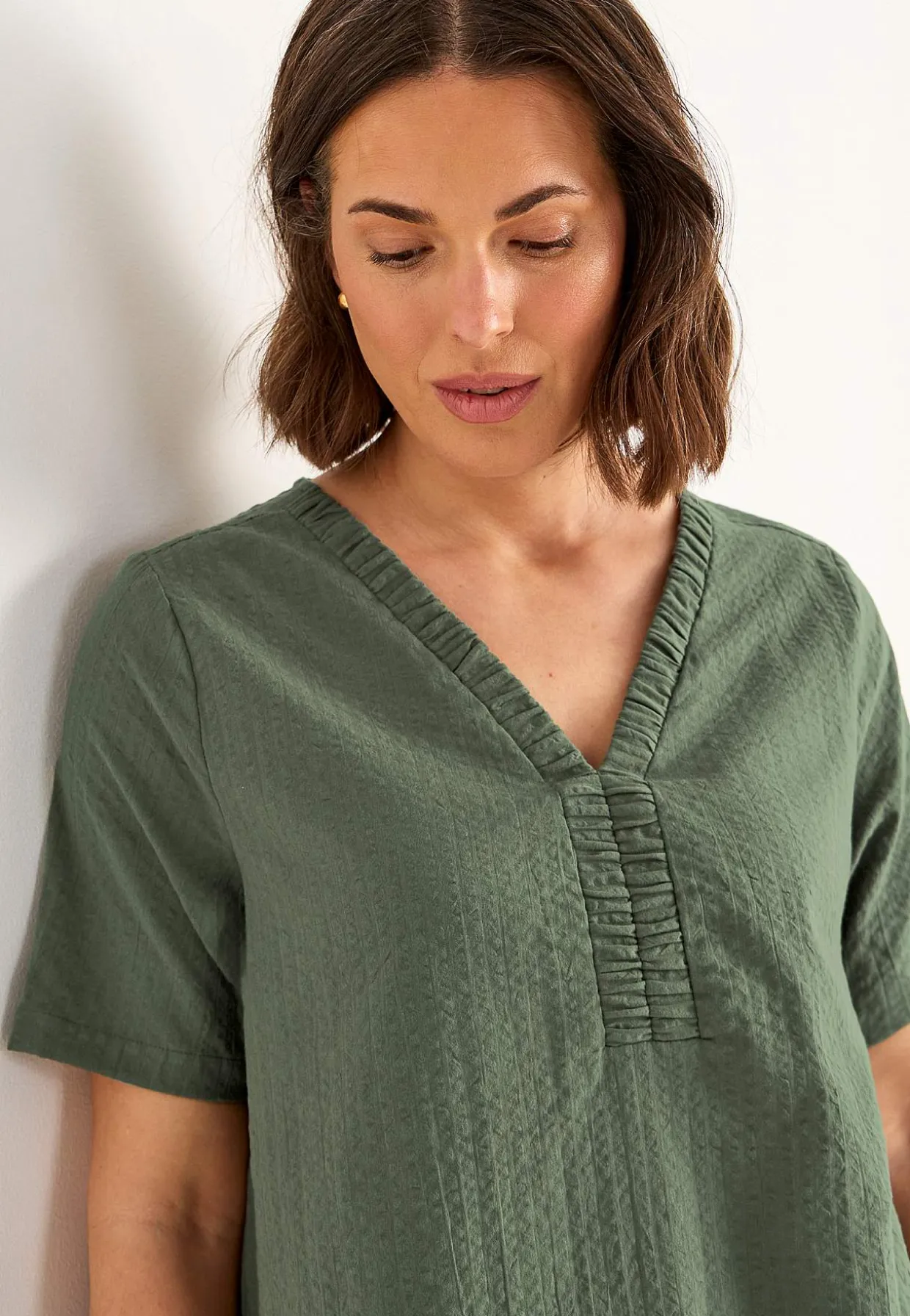 • V-udskåret, rynket halsudskæring.
