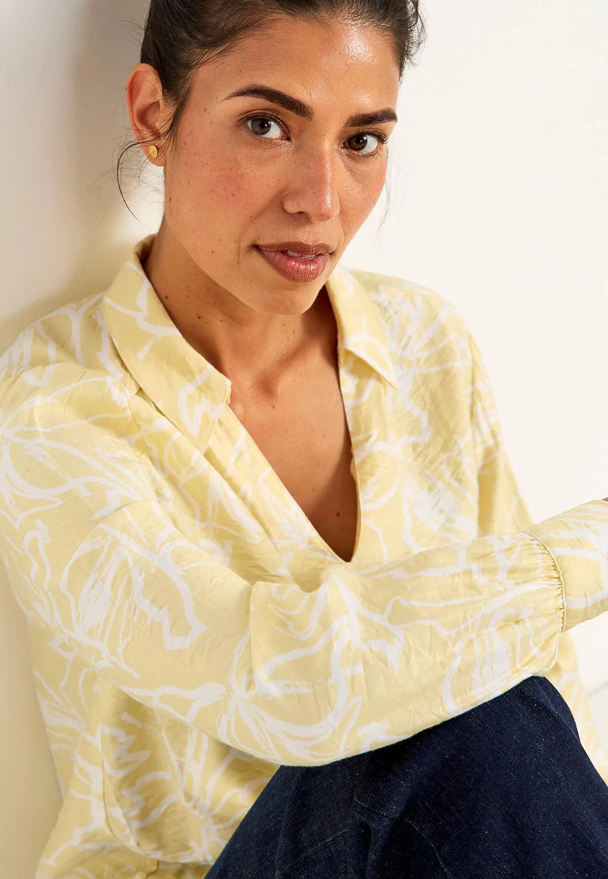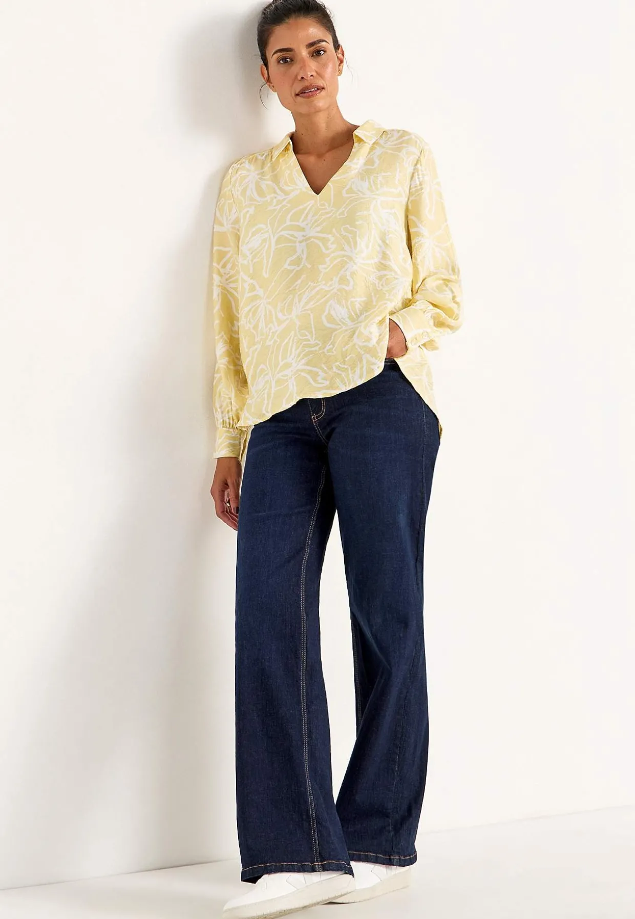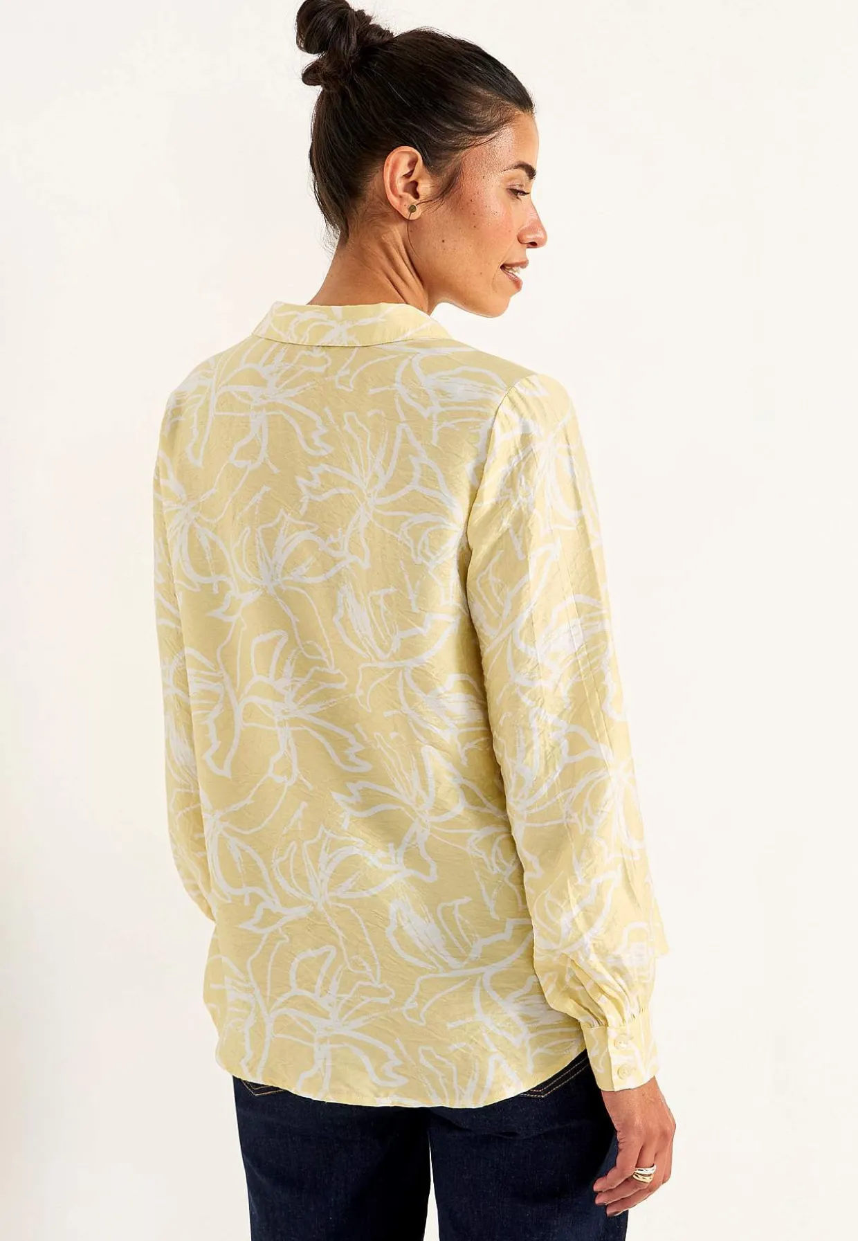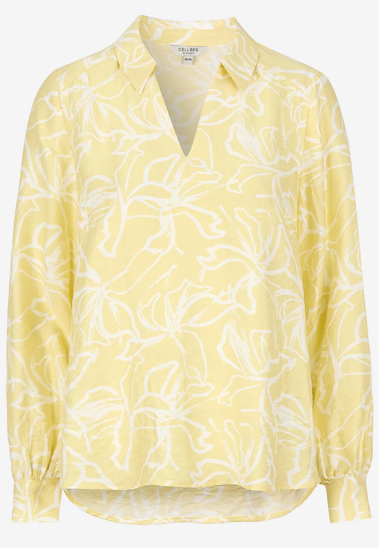 • Lange, brede ærmer med manchet, knapper og samling ved manchetterne.