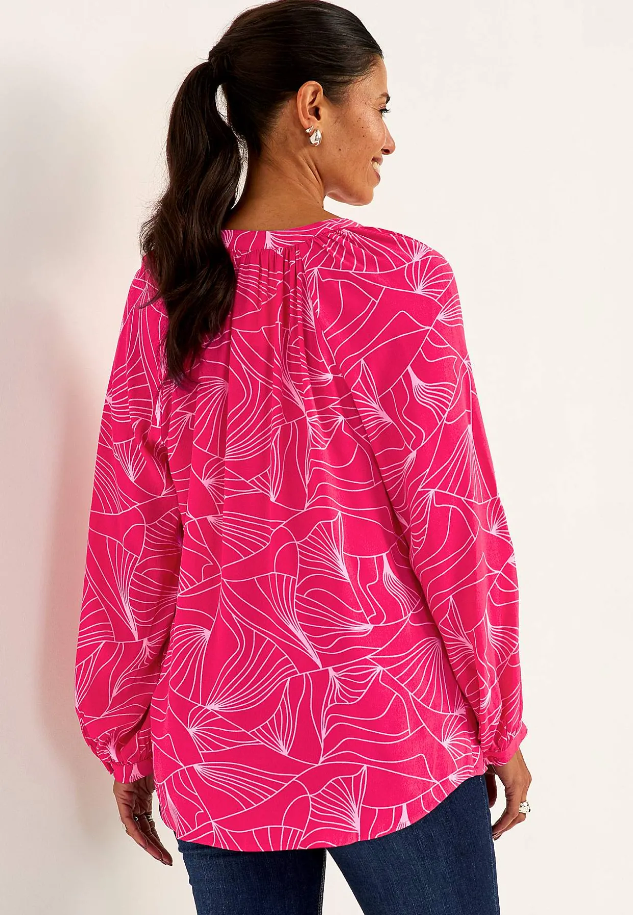 • Afrundet halsudskæring med en let samling og overlappende v-udskæring.