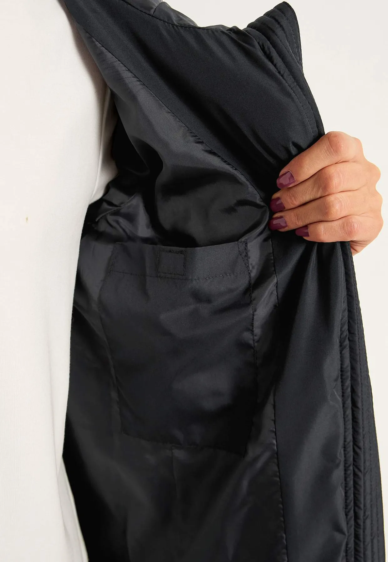 • Paspolerede lommer i siderne med skjult trykknap.