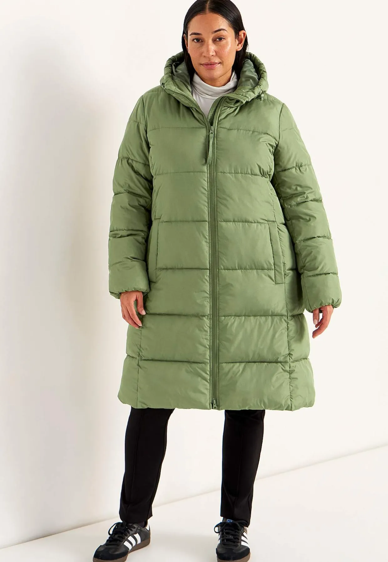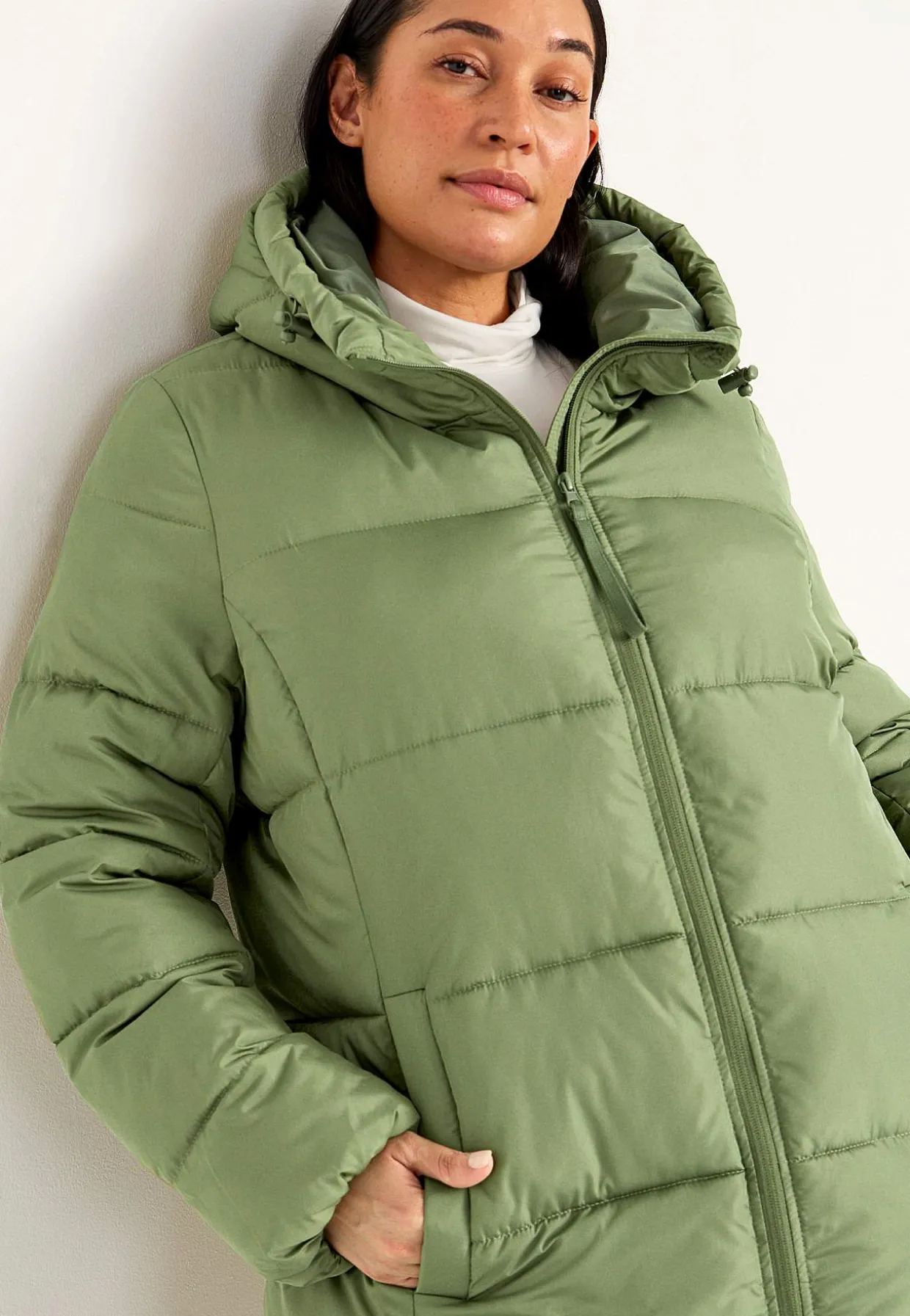 • Lange ærmer med tynd, skjult elastik ved manchetterne.