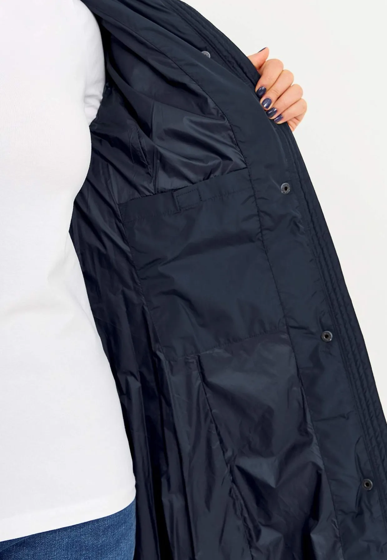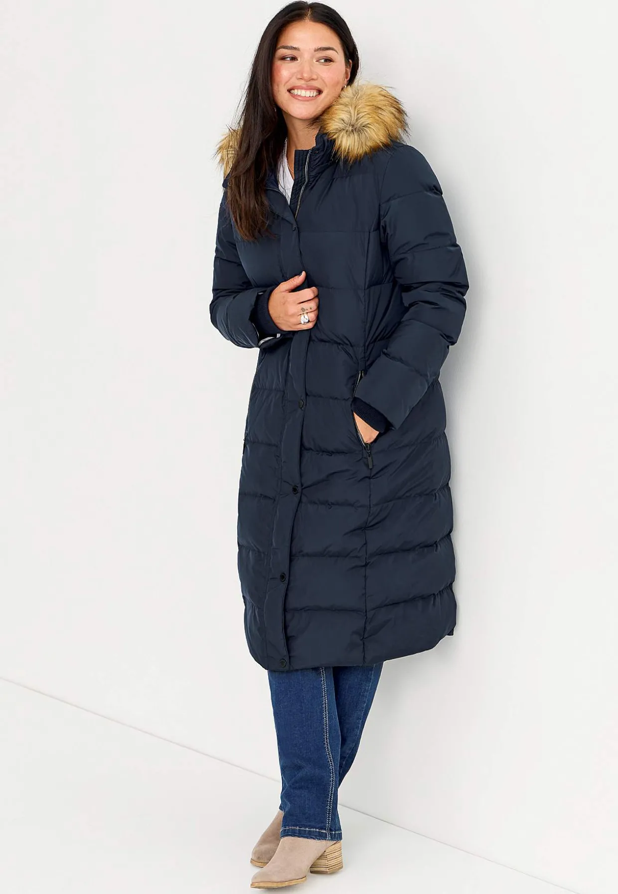 Quiltet dunfrakke i lækker, lang og varmt foret model. Stilsikker frakke med aftagelig hætte med løbegang samt stopper og aftagelig kunstpels. 2-vejslynlås med beskyttende vindfang med trykknapper. Lommer med lynlås. Ærmekanterne kan smøges op og har refleksdetalje på indersiden. Rib i ærmekanterne. Inderlomme. Ryglængden følger størrelsen, ca. 106-122 cm.