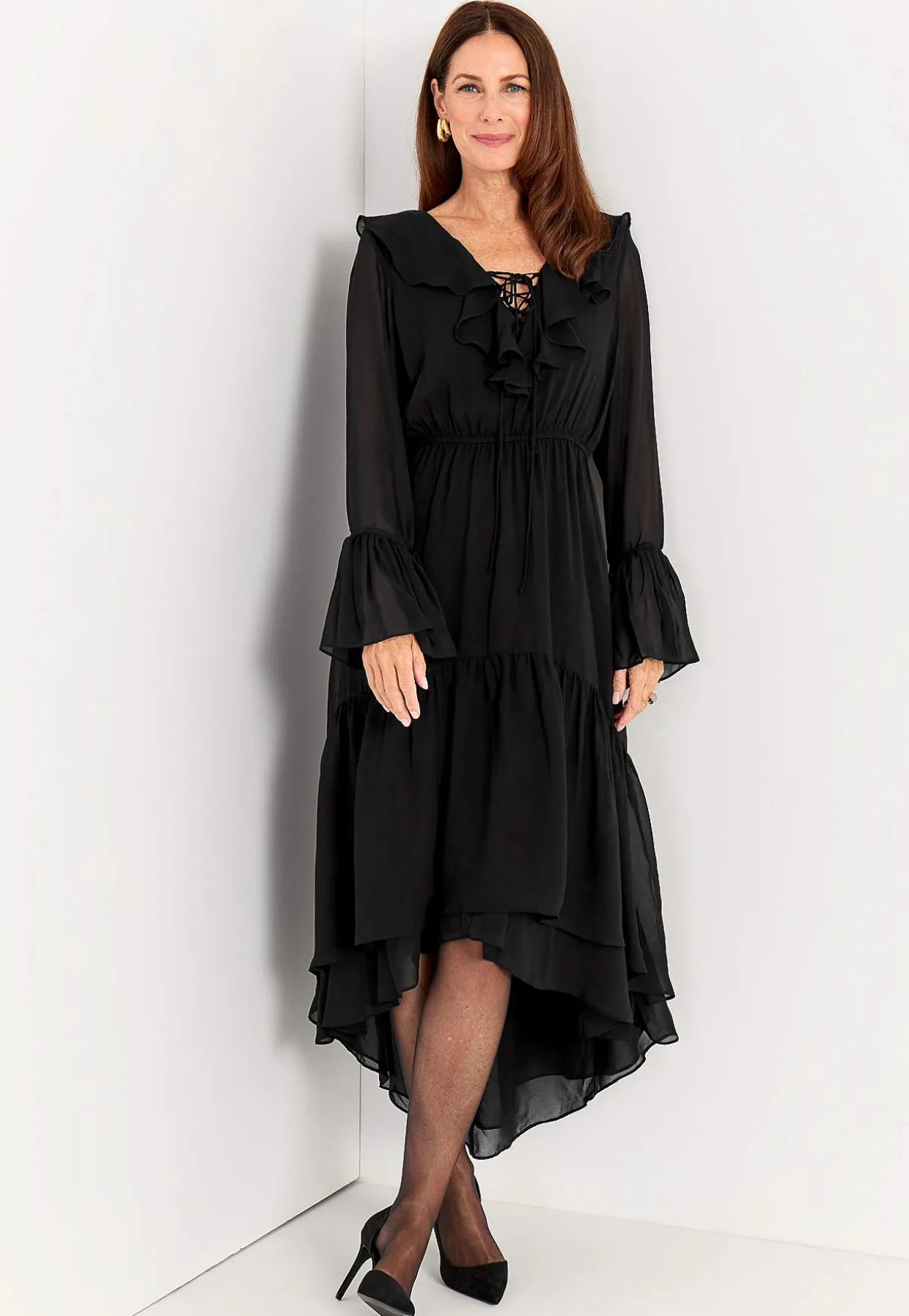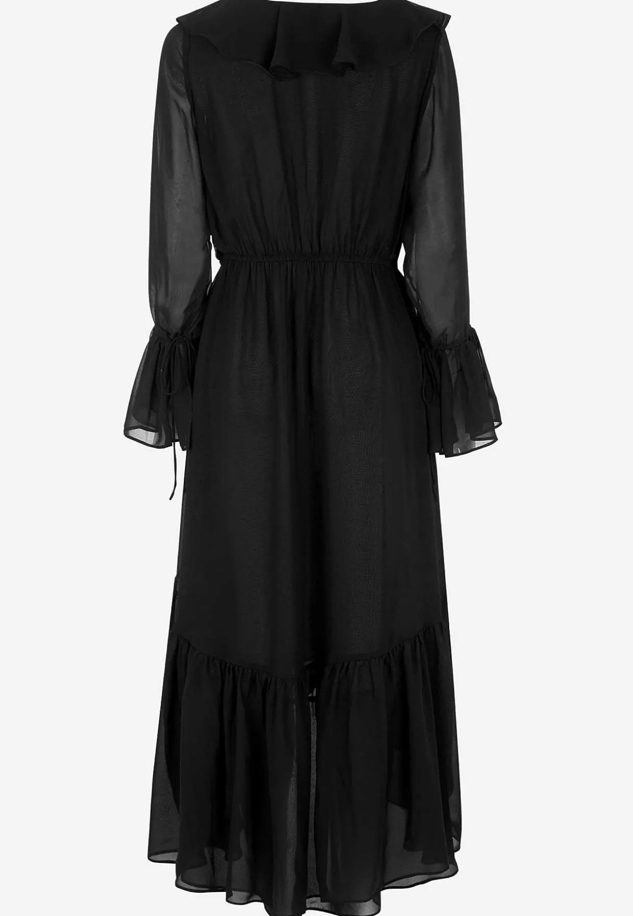 • Lange, næsten gennemsigtige ærmer med volant og justérbar snøring.