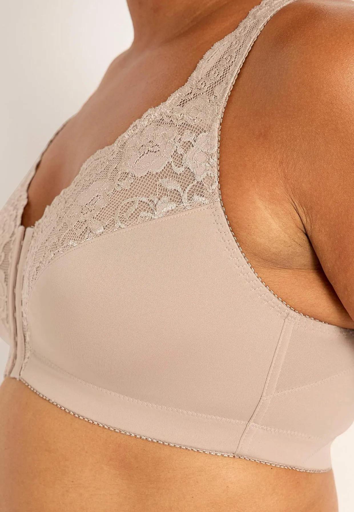 • Vi ønsker, du får den størrelse, der passer dig perfekt! Husk at måle omkredsen under brystet ekstra omhyggeligt, da denne bh kun har én række af krog- og øjelukning i bredden.