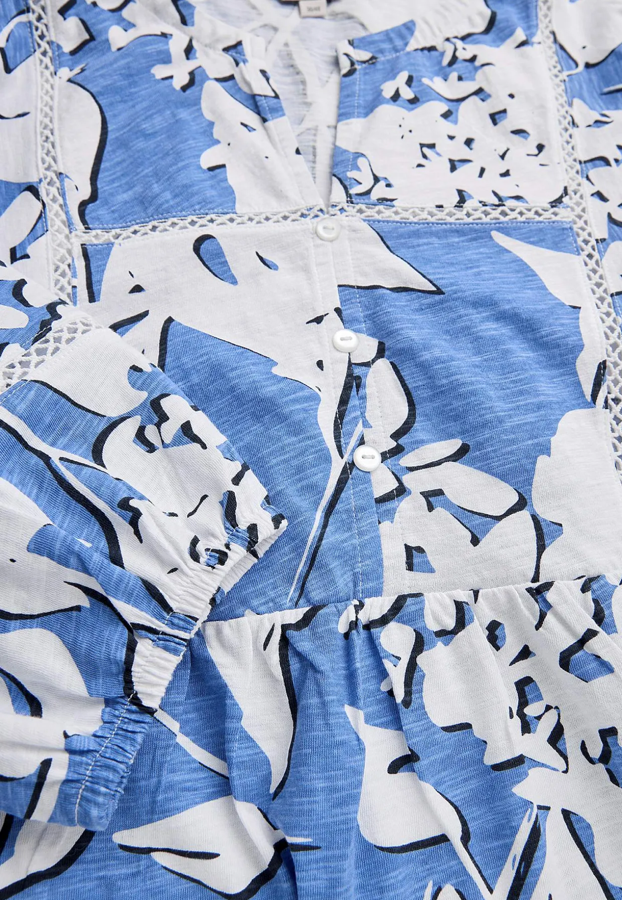 • Afrundet krave med en v-formet åbning og knapdekoration.