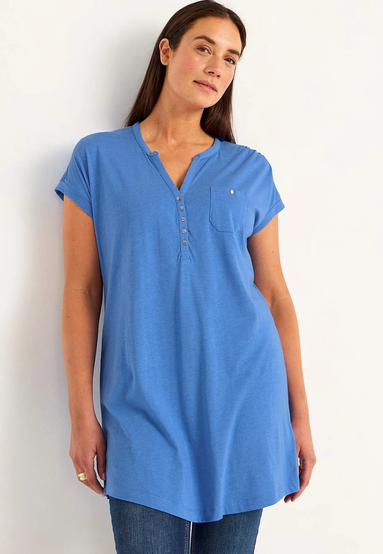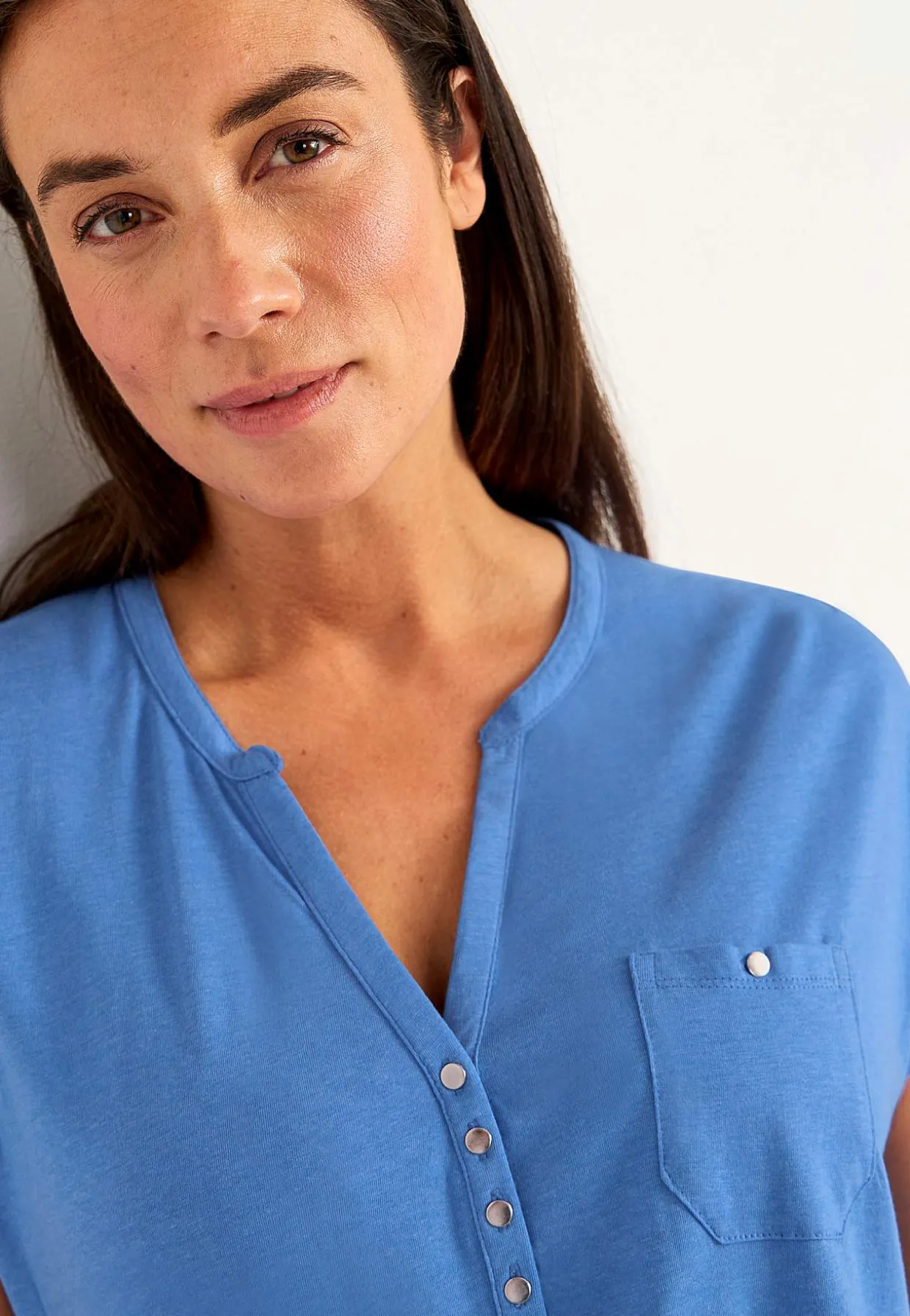 • Kort ærme med samling på skulderen og syet oprullet ved manchetterne.