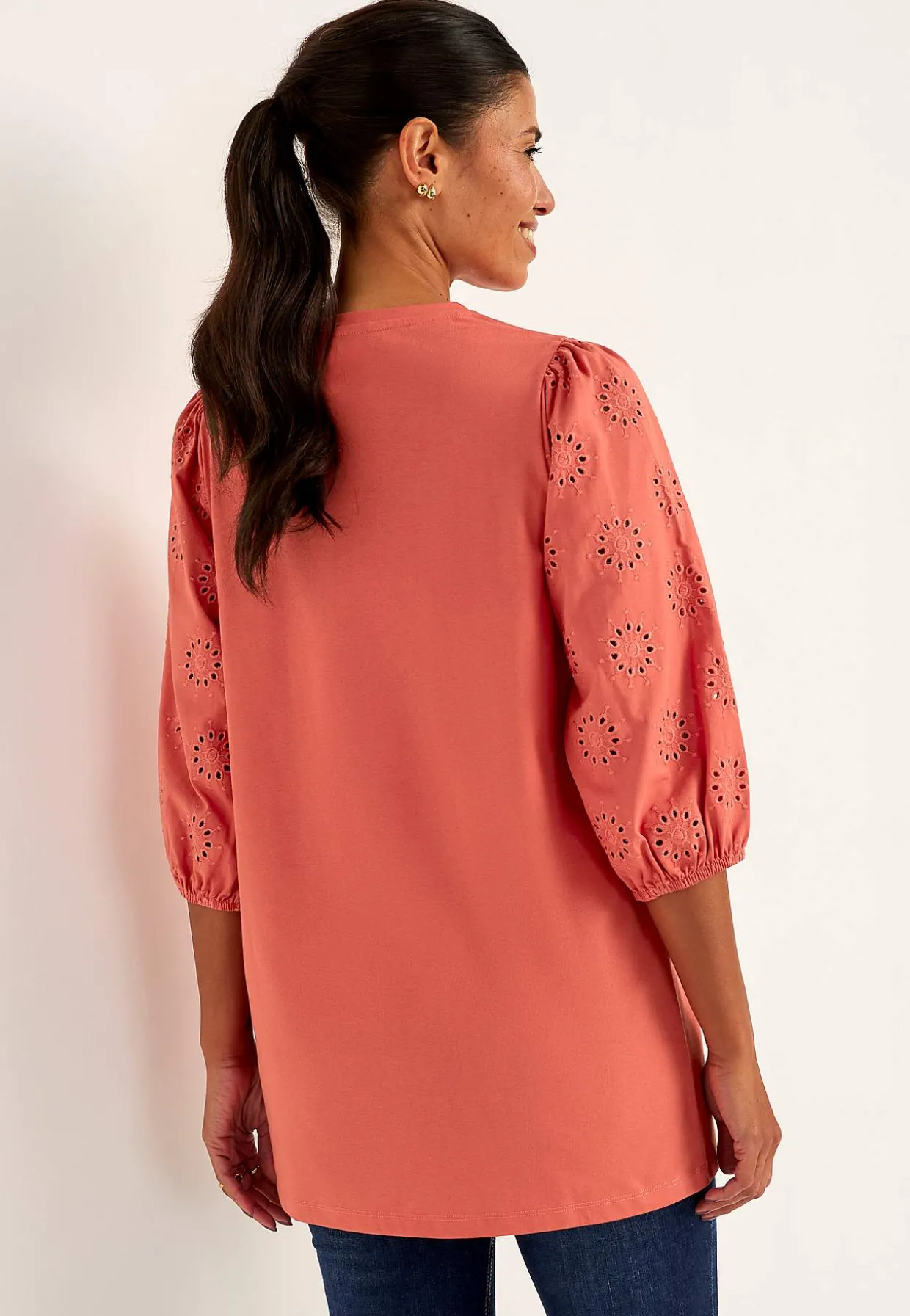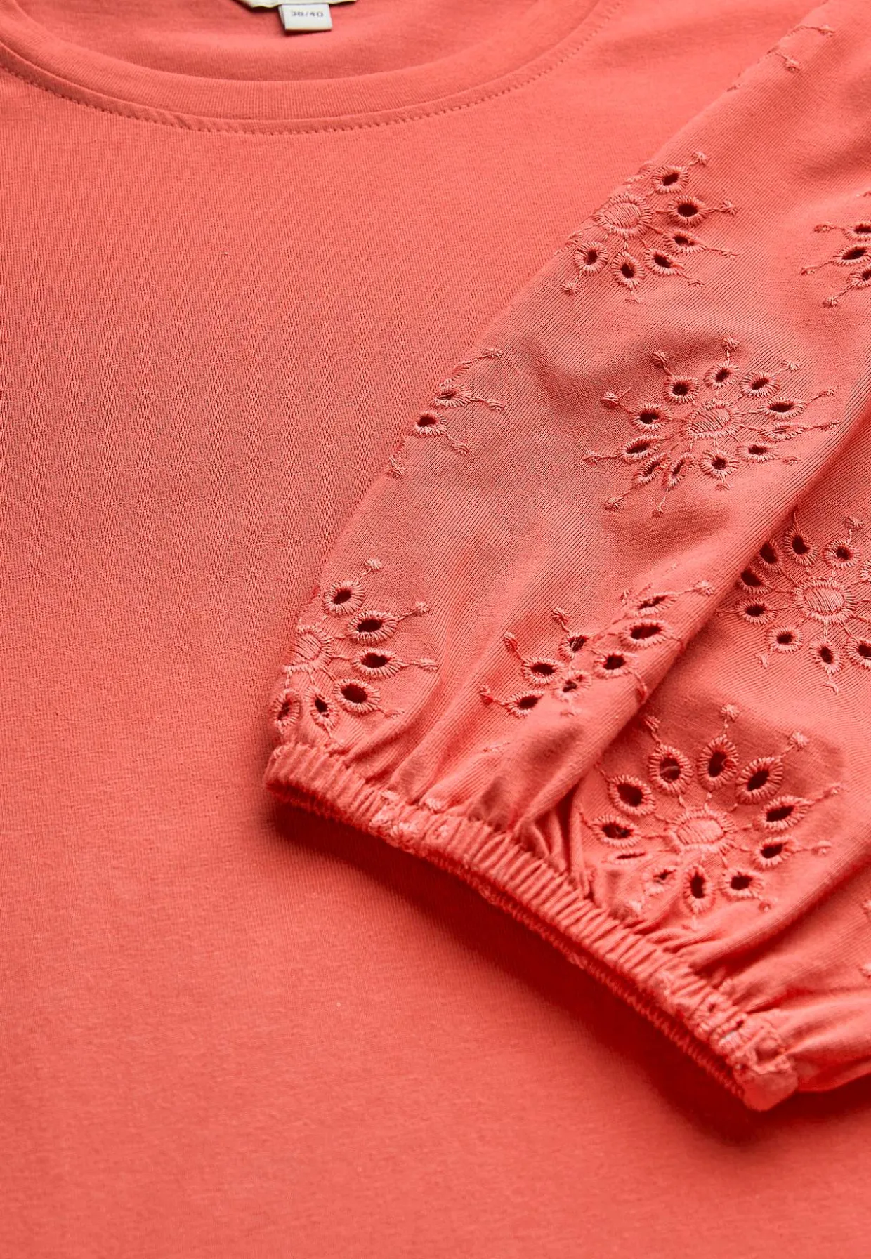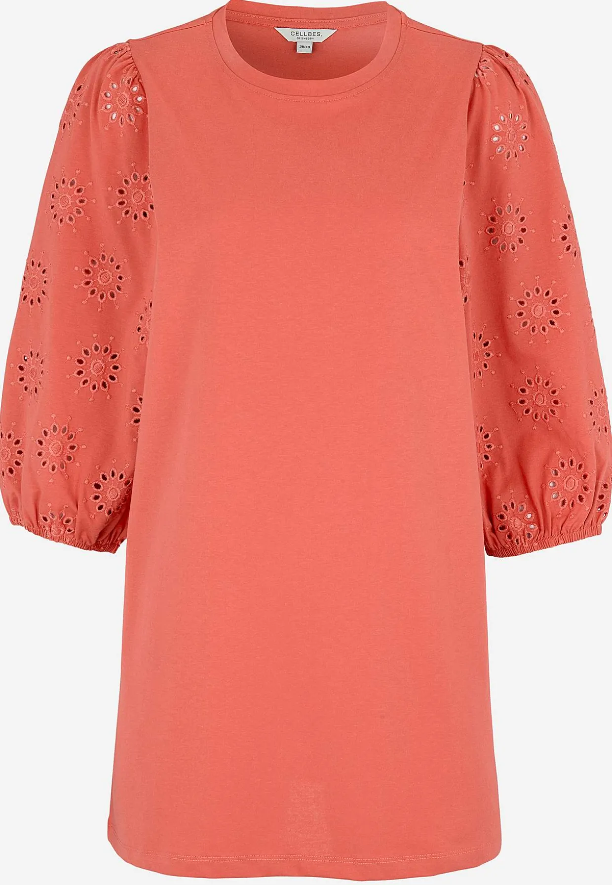 • Brede, 3/4 lange ærmer med hulmønster med broderie anglaise og elastik ved manchetterne.