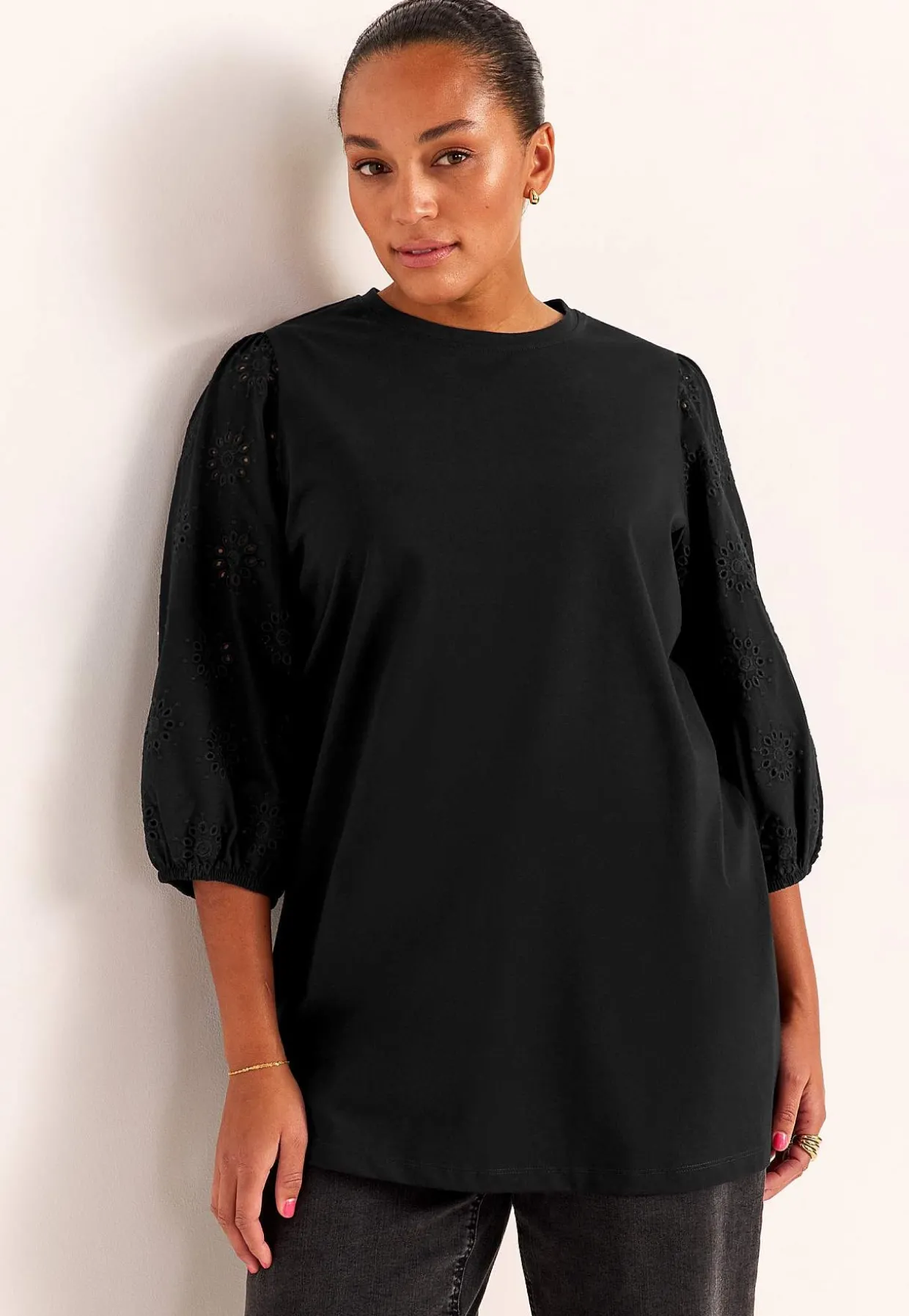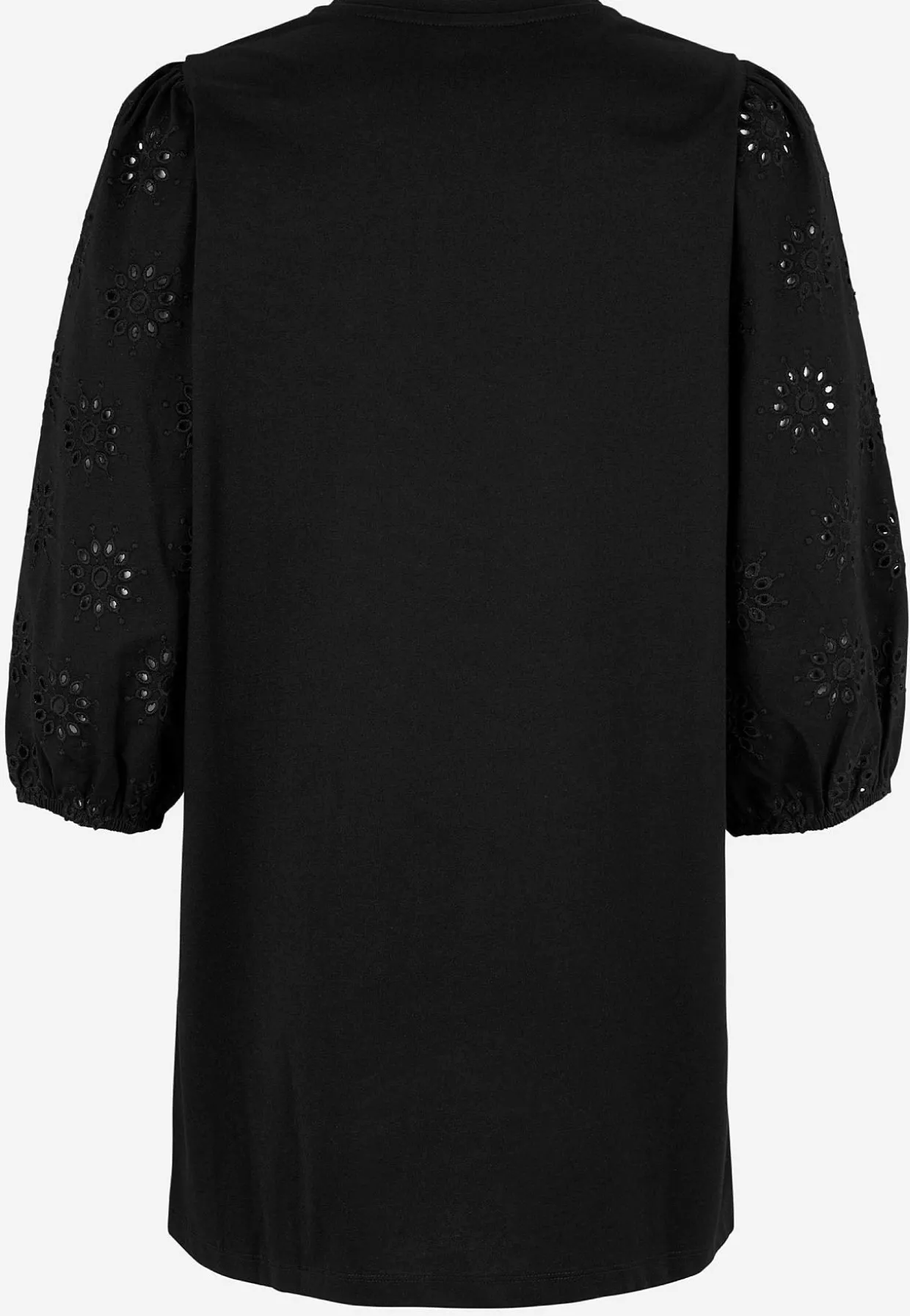 • Brede, 3/4 lange ærmer med hulmønster med broderie anglaise og elastik ved manchetterne.