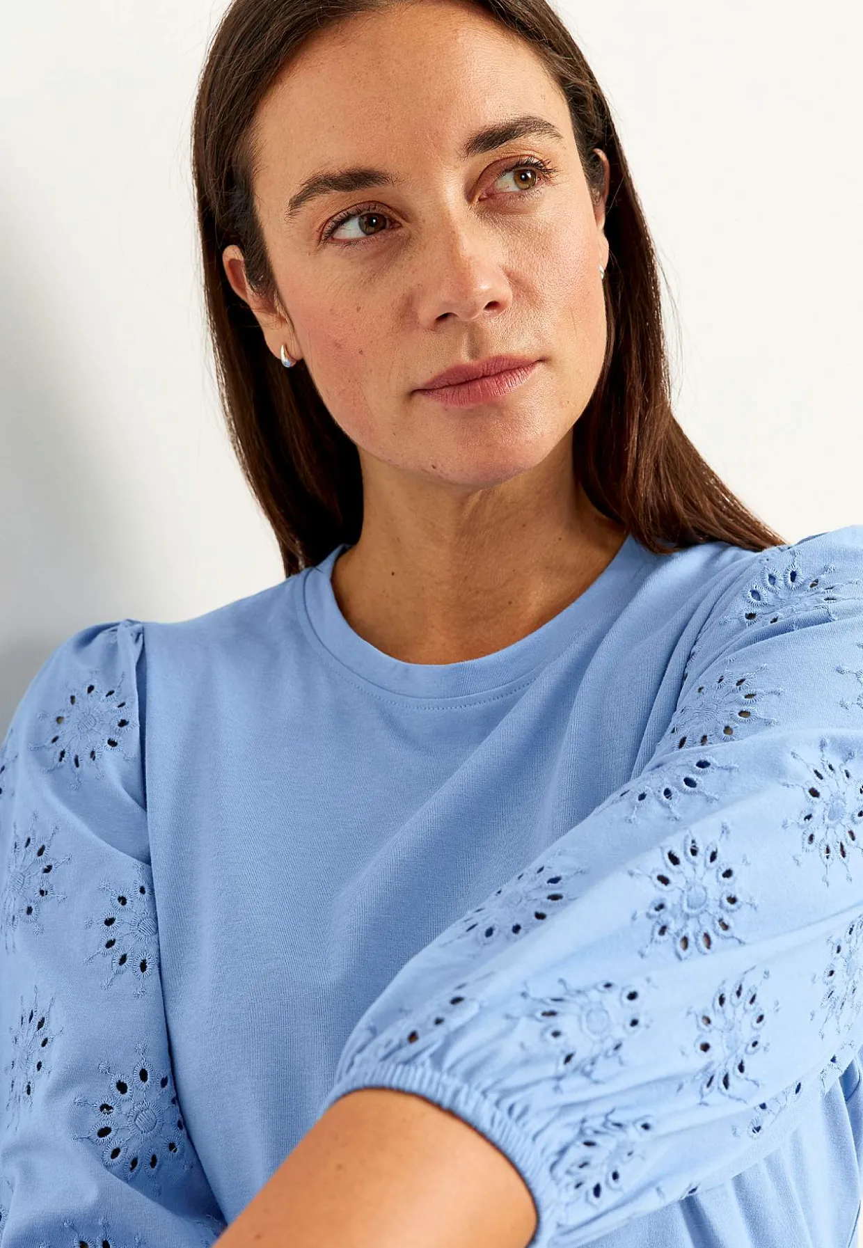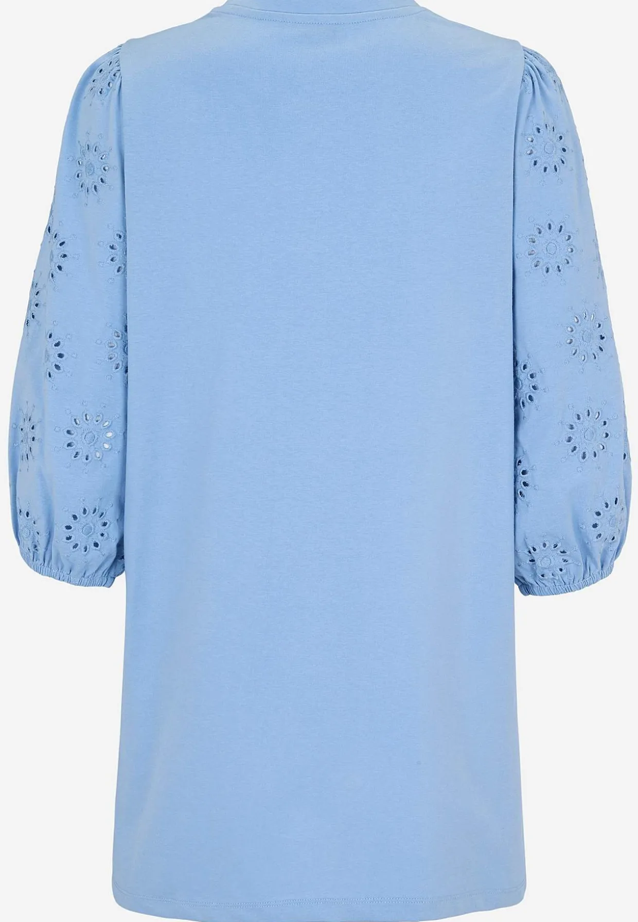 • Brede, 3/4 lange ærmer med hulmønster med broderie anglaise og elastik ved manchetterne.