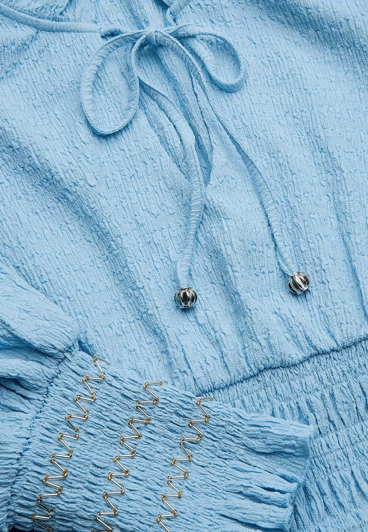 • Ærmeafslutning med elastisk smock og perledetaljer.