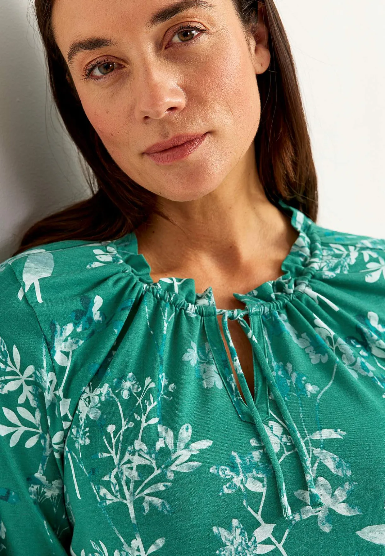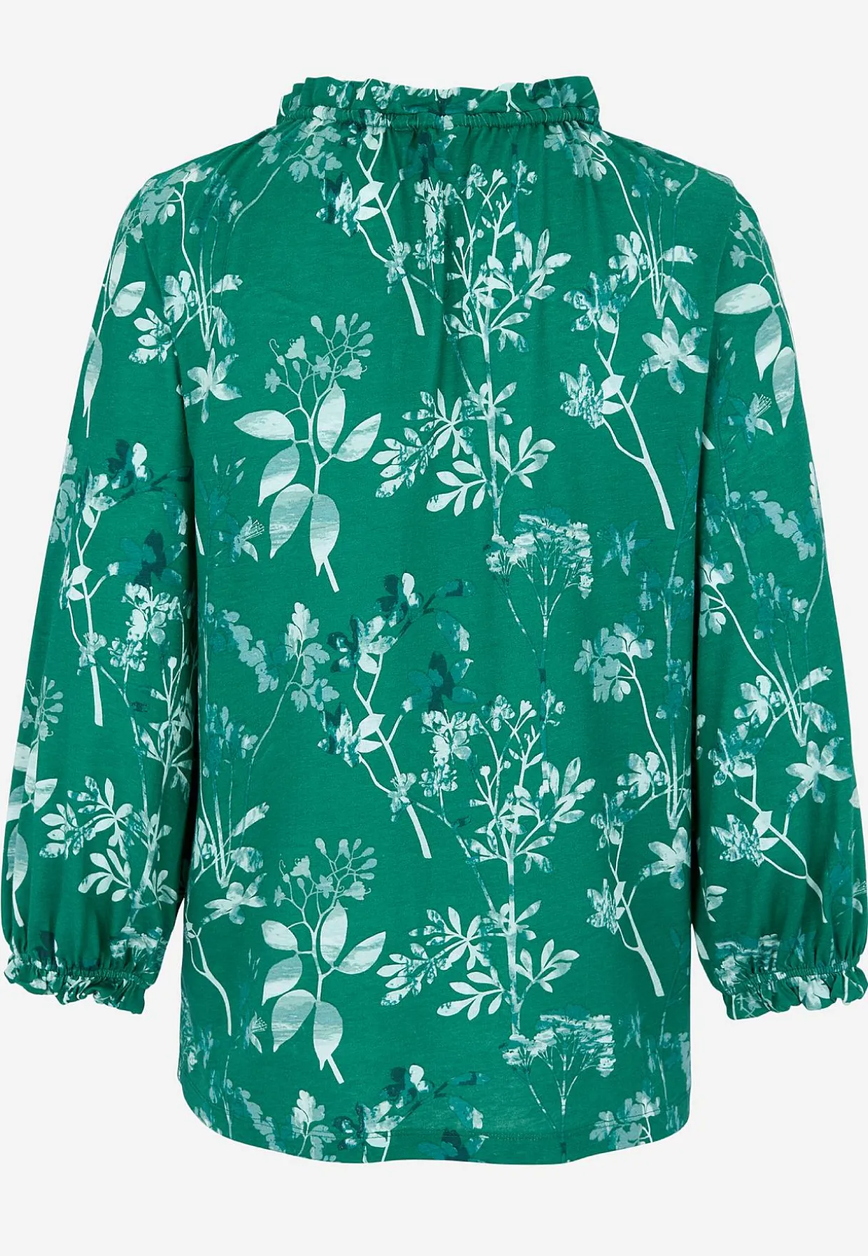 • 3/4 lange, brede ærmer med elastik og lille volant ved manchetterne.