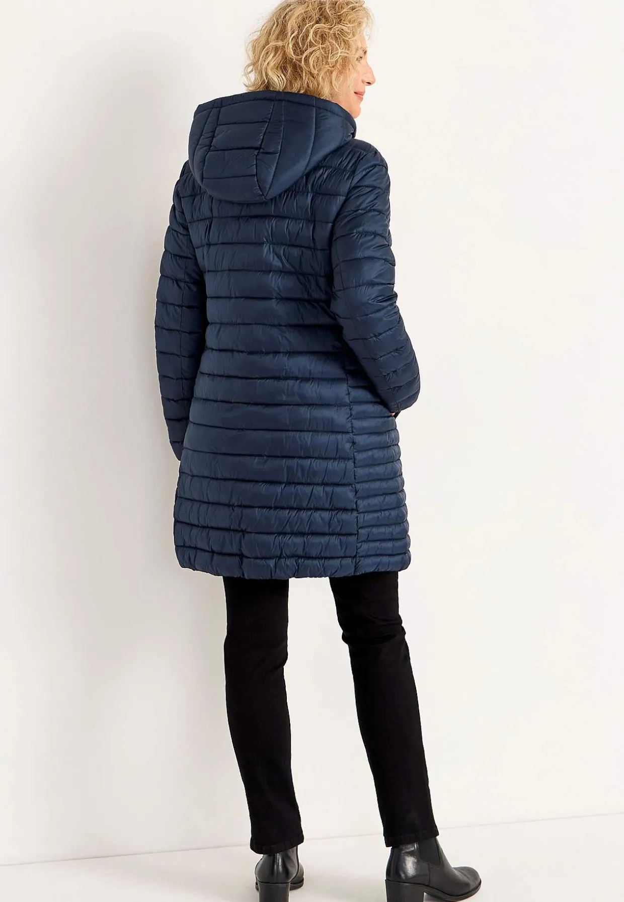 Lang letvægtsjakke med to-vejs lynlås og aftagelig hætte.