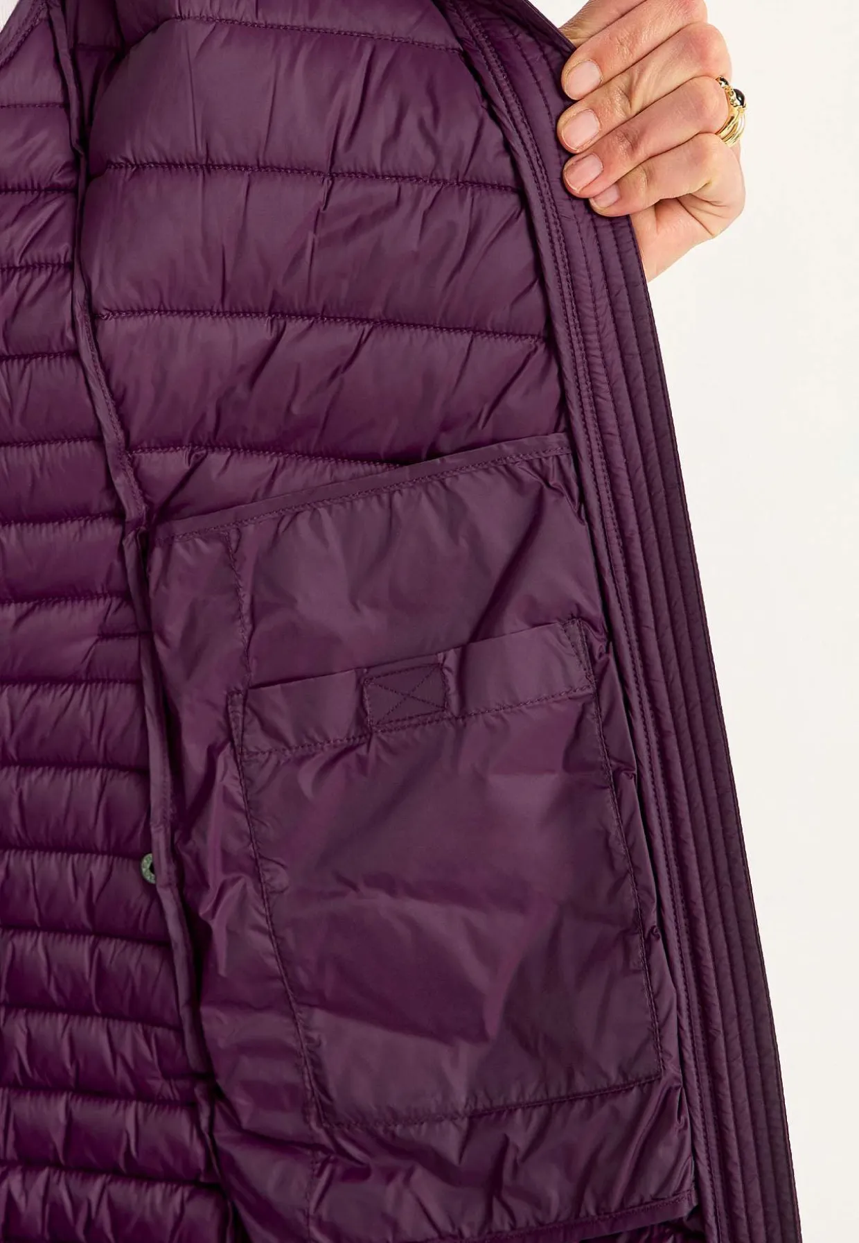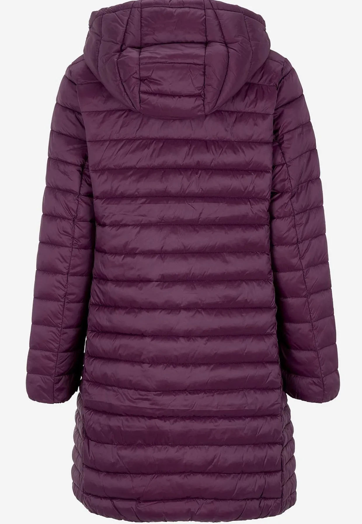 Lang letvægtsjakke med to-vejs lynlås og aftagelig hætte.