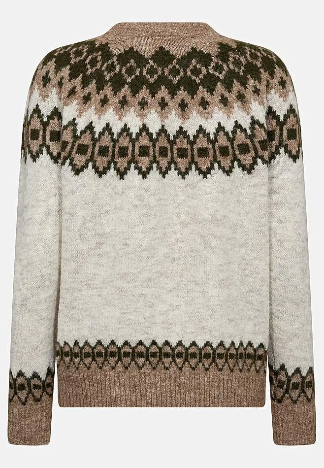 • Lange raglanærmer med mønster og ribmanchet på ærmeafslutningerne.