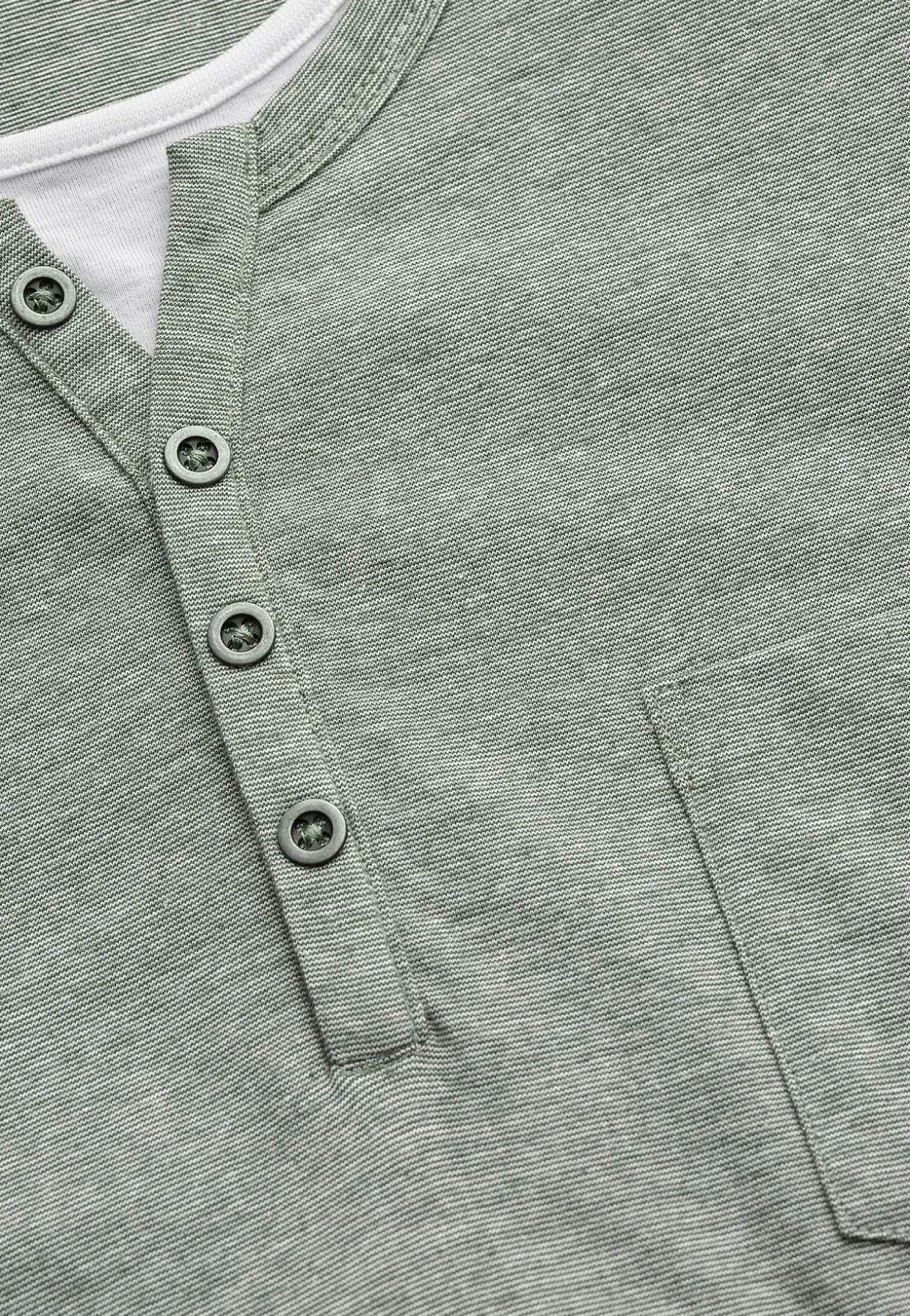 • Rund halsudskæring med lille v-udskæring og en falsk knapåbning.