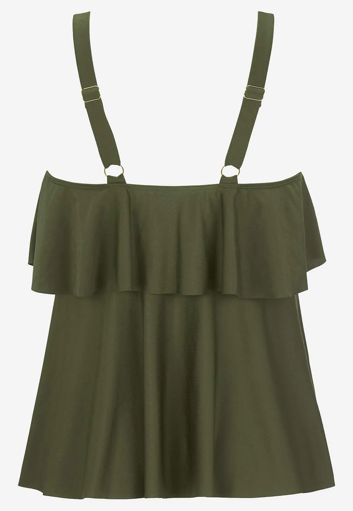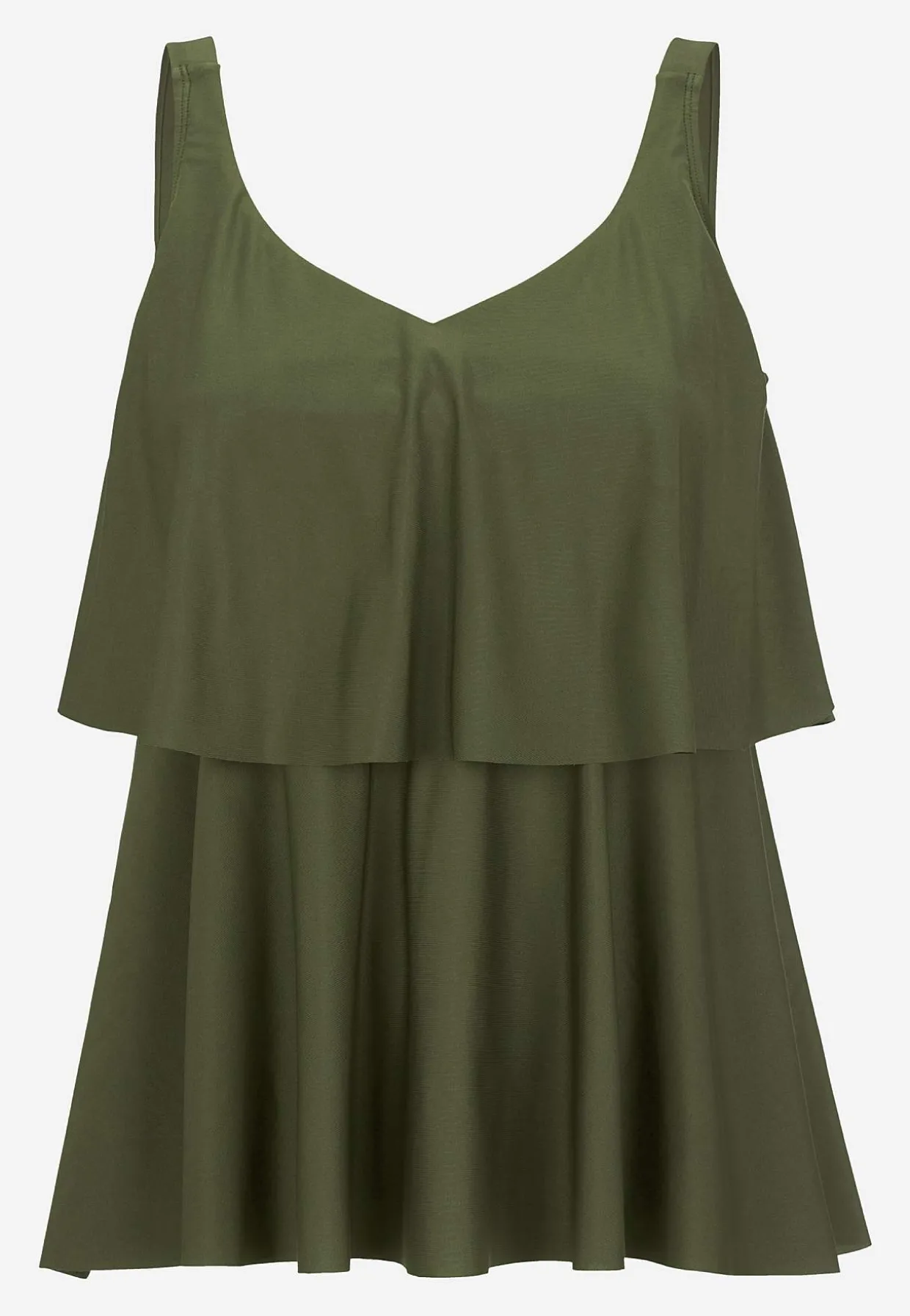 Stilfuld tankinitop med v-udskæring og volanter perfekt til stranden.