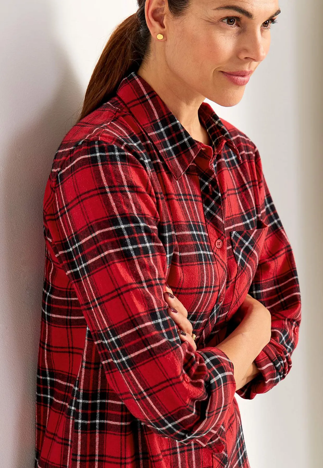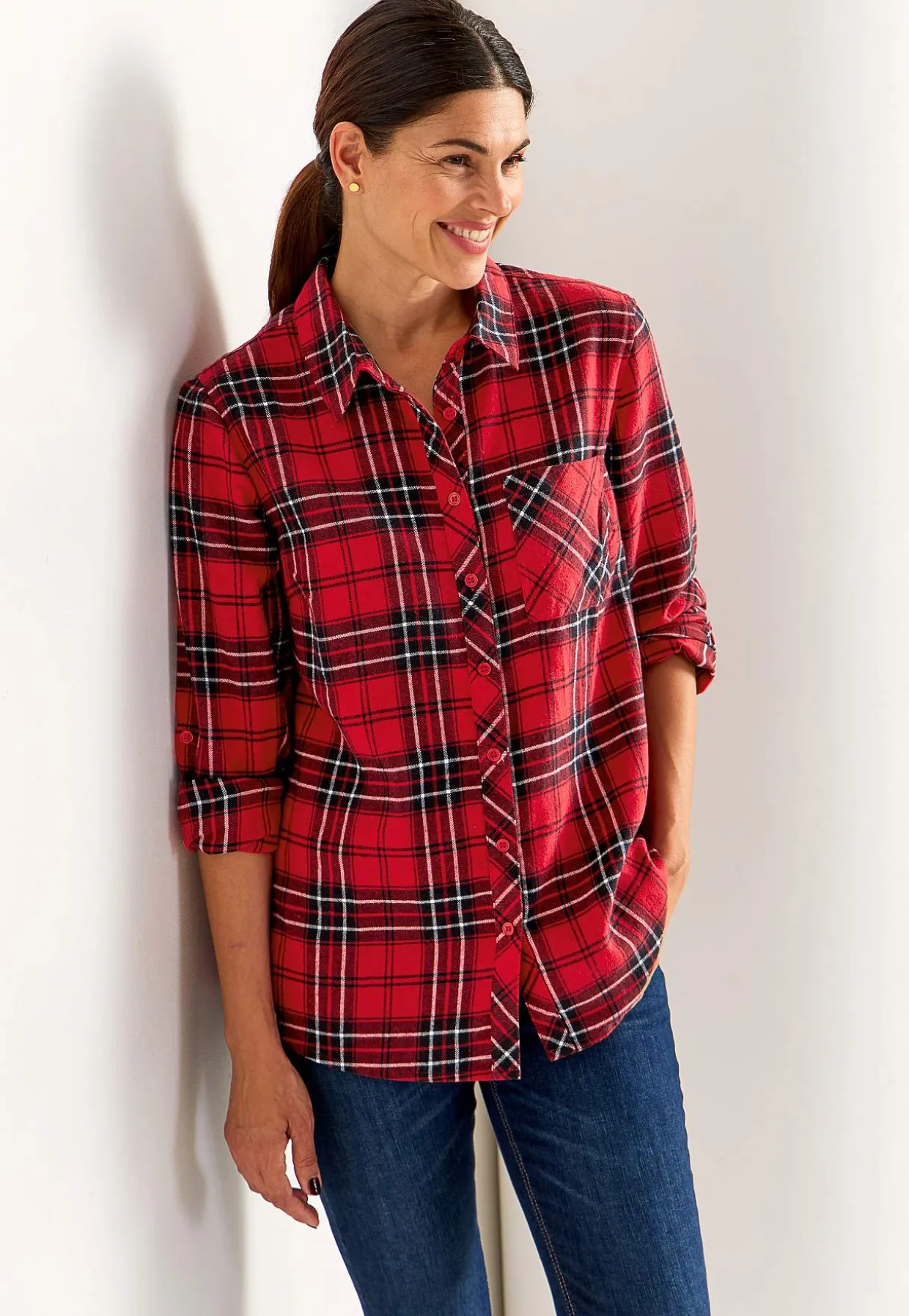 • Lange, foldbare ærmer med strop og knap.