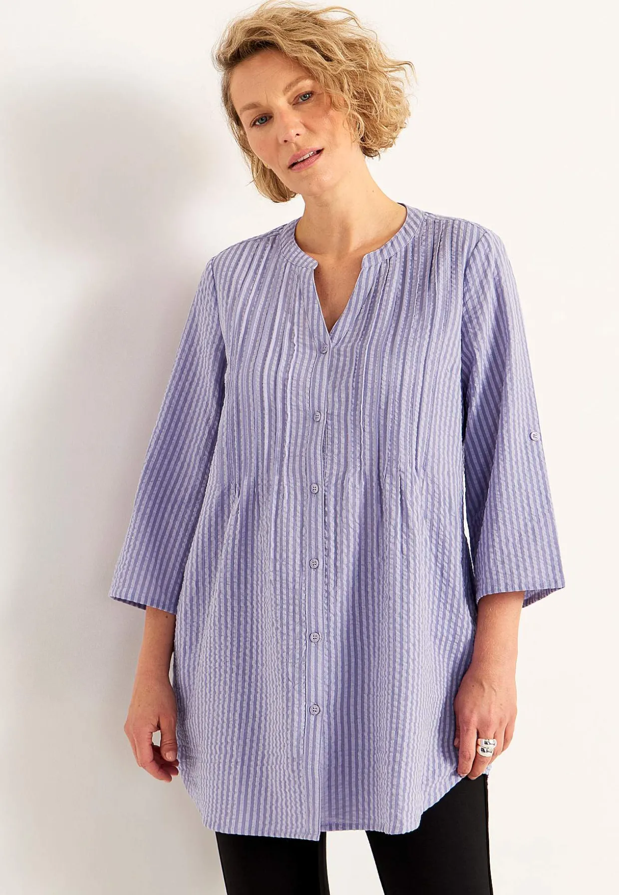 • 3/4 langt, bredt rul-op knap ærme.