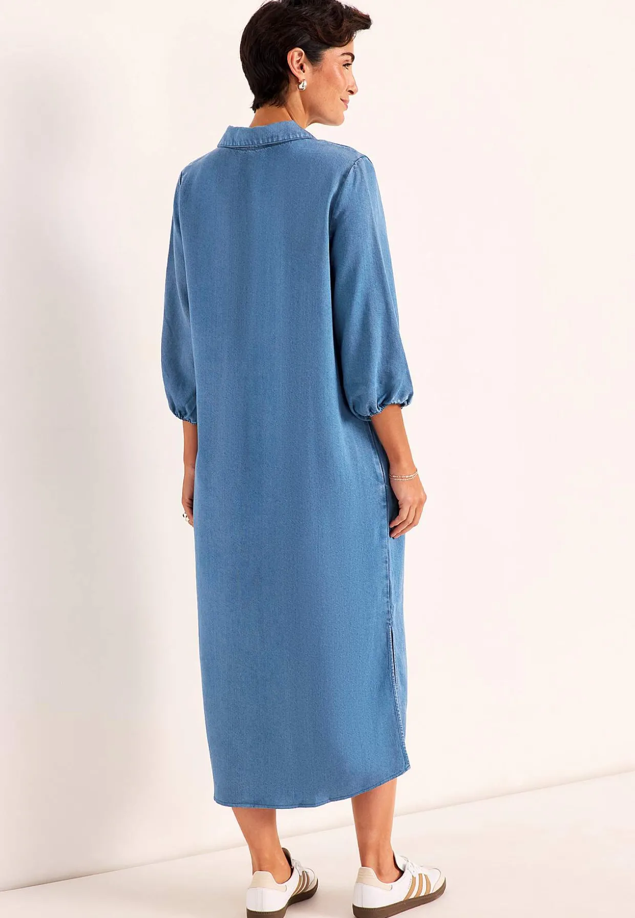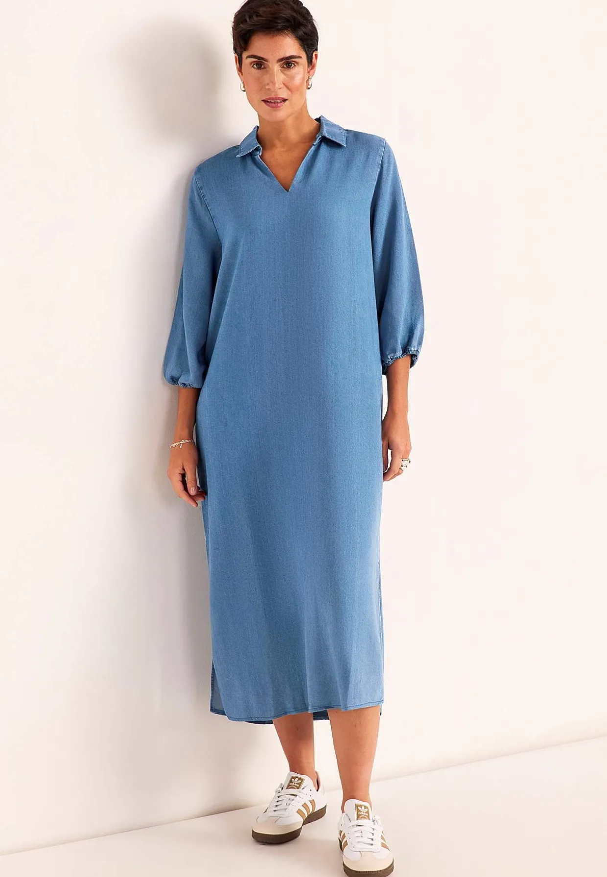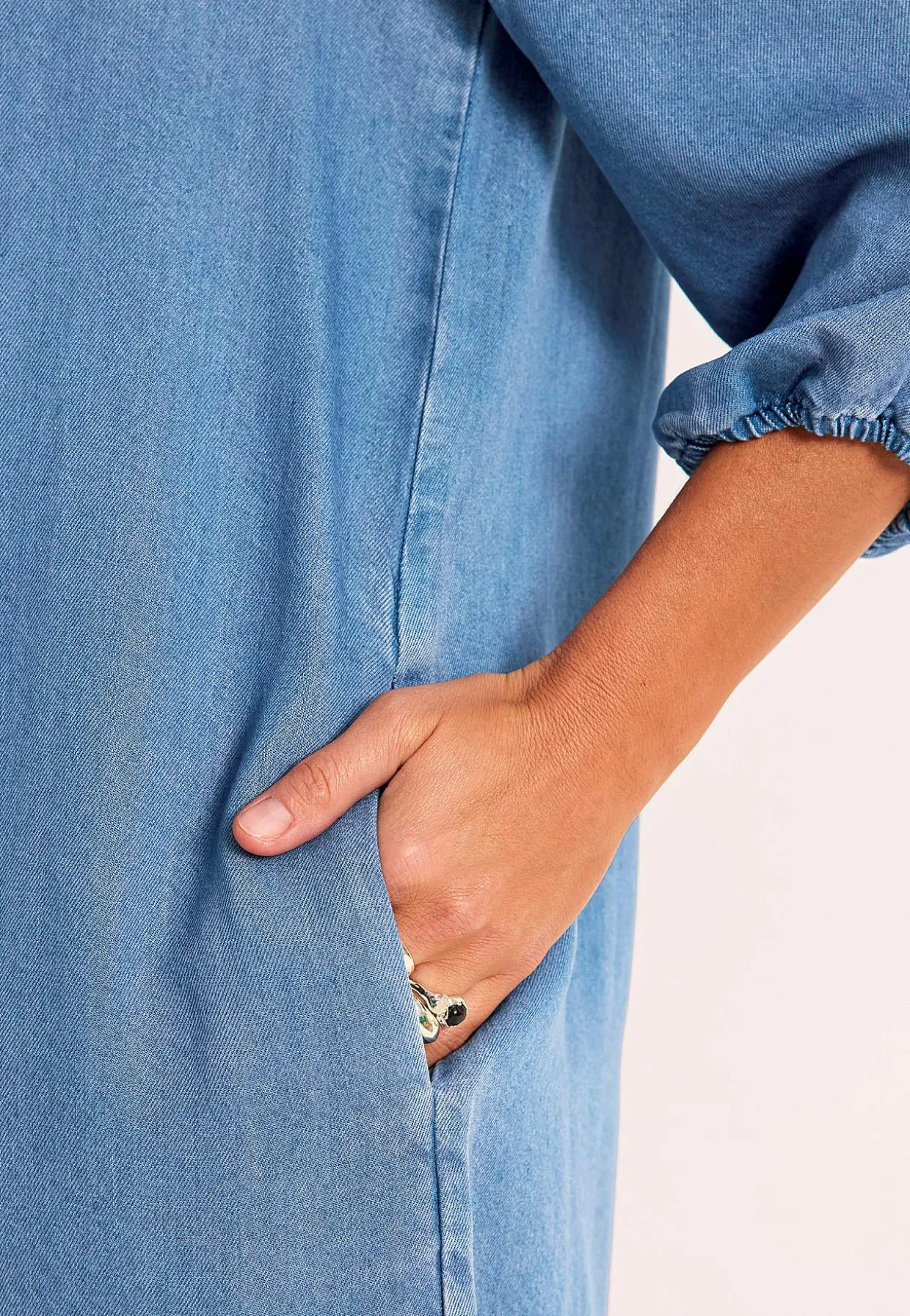 • Brede, trekvartlange ærmer med volumen og elastik ved manchetterne.