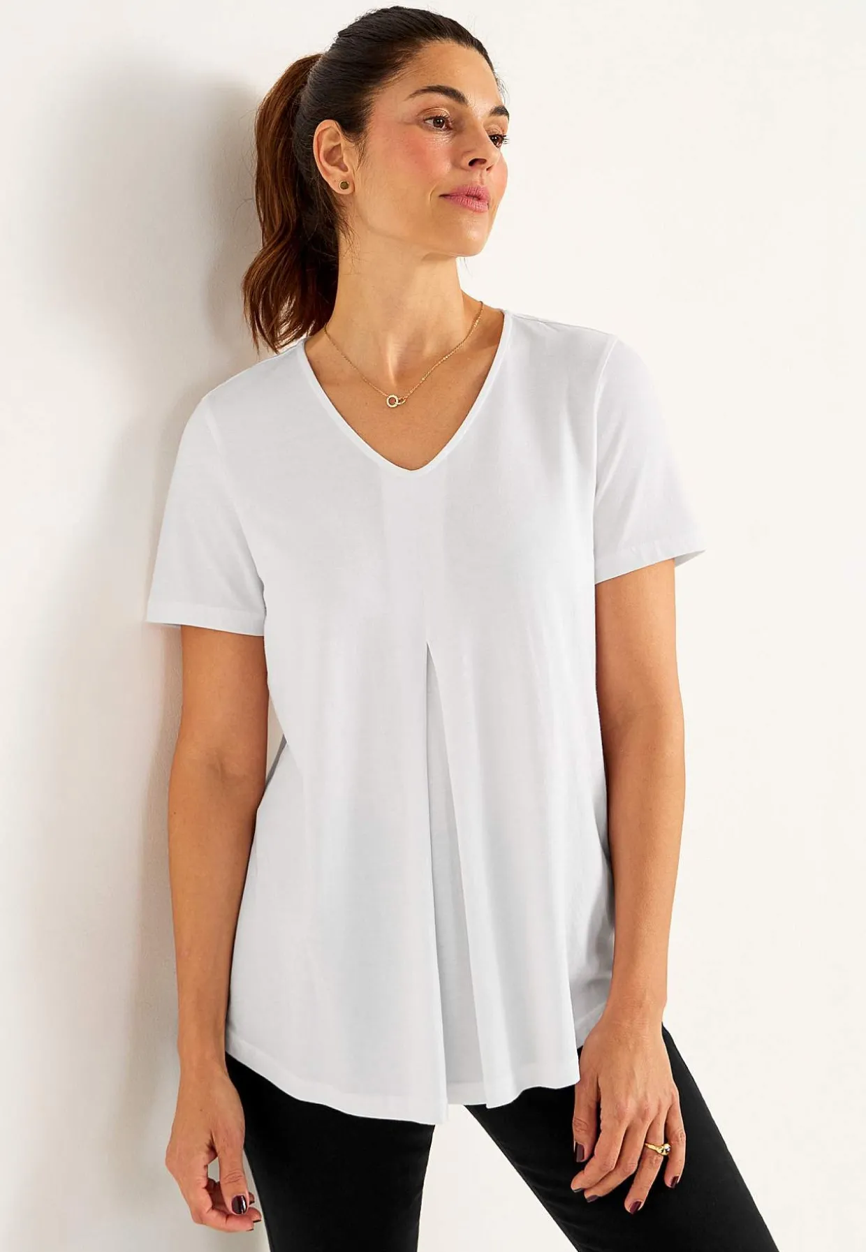 • Flatterende modfold over brystet.